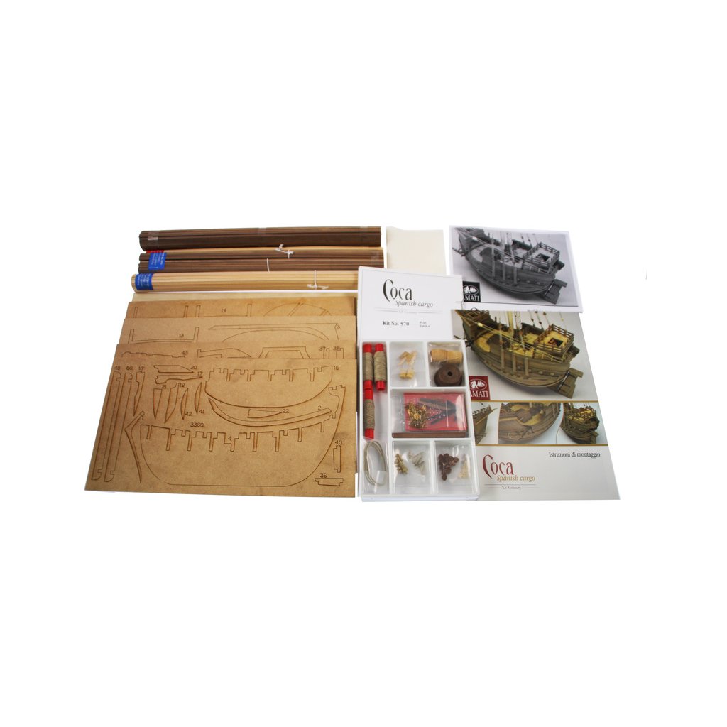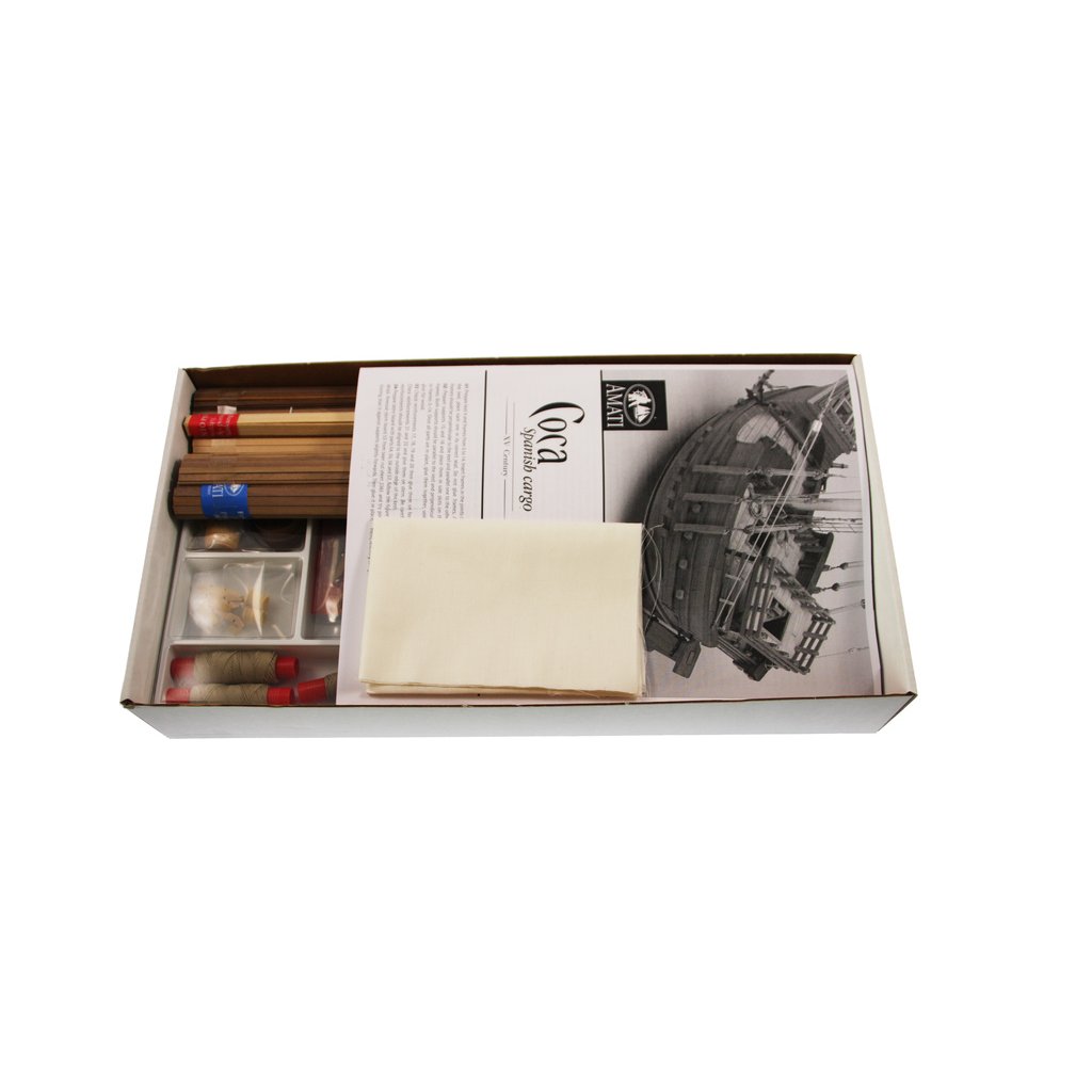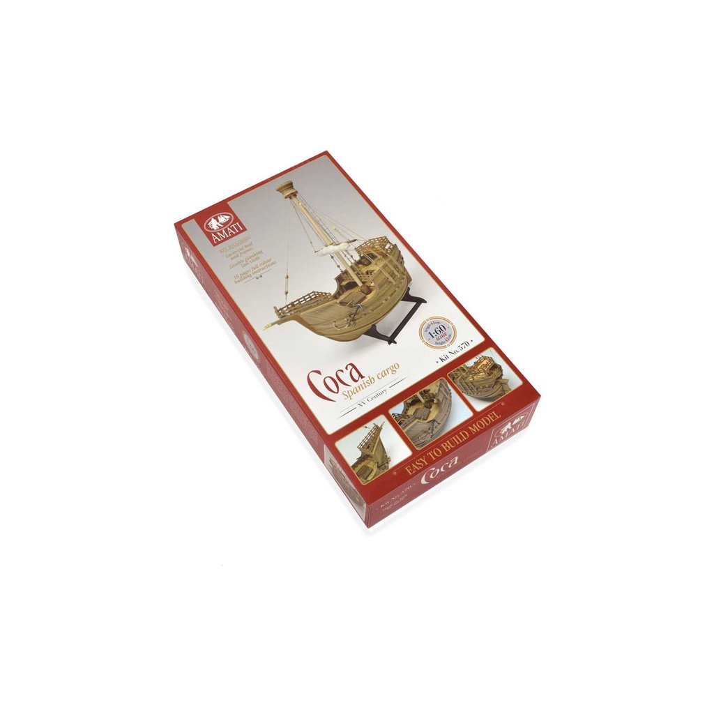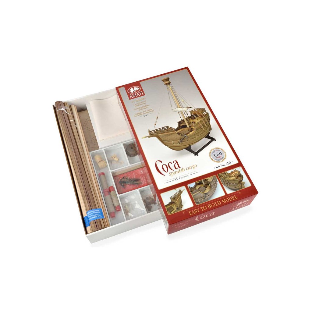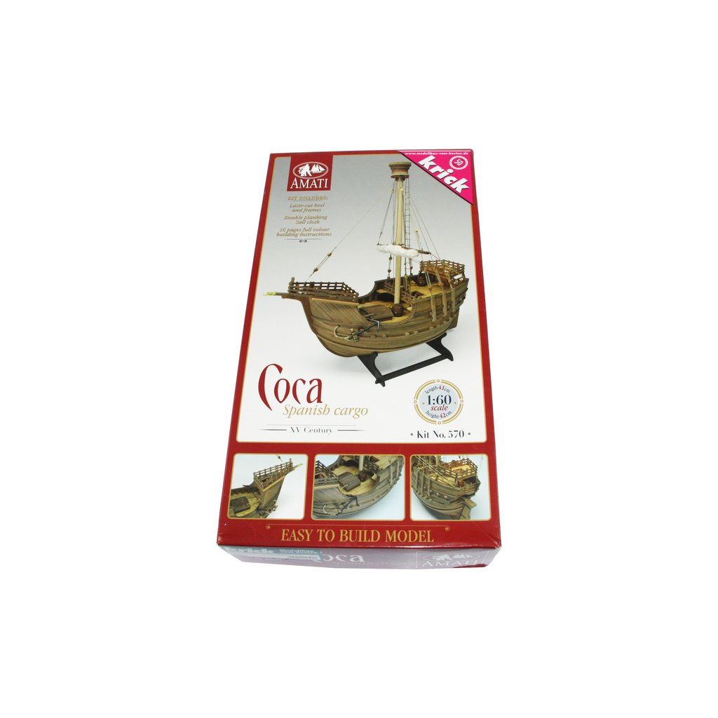 Stavebnice statické makety lodi, AMATI Coca - Karacke 15. století 1:60 kit. Byly používány v 15. století jako obchodní lodě. Typickým znakem byly dvě nástavby, ze kterých se posádky mohly bránit proti pirátským útokům. Z vyhlídky na vrcholku stožáru se pozorovalo okolního moře. Dřevěné díly jako kýl a obšívka jsou řezány laserem, obsahuje plachty, příslušenství a plány.
