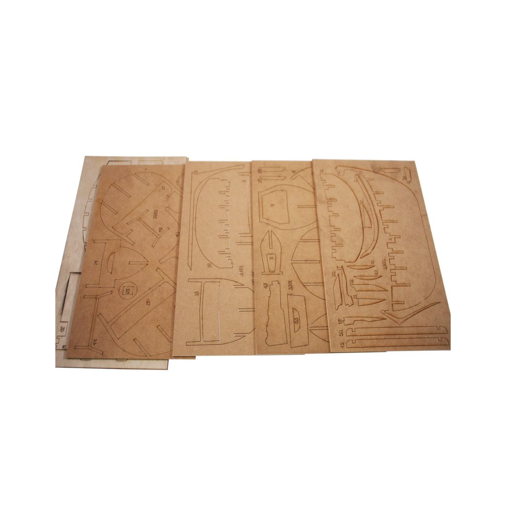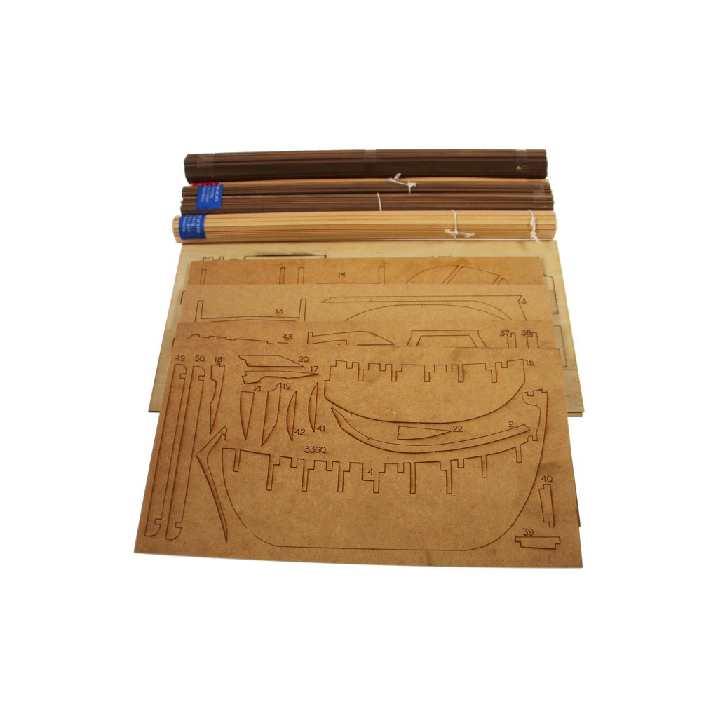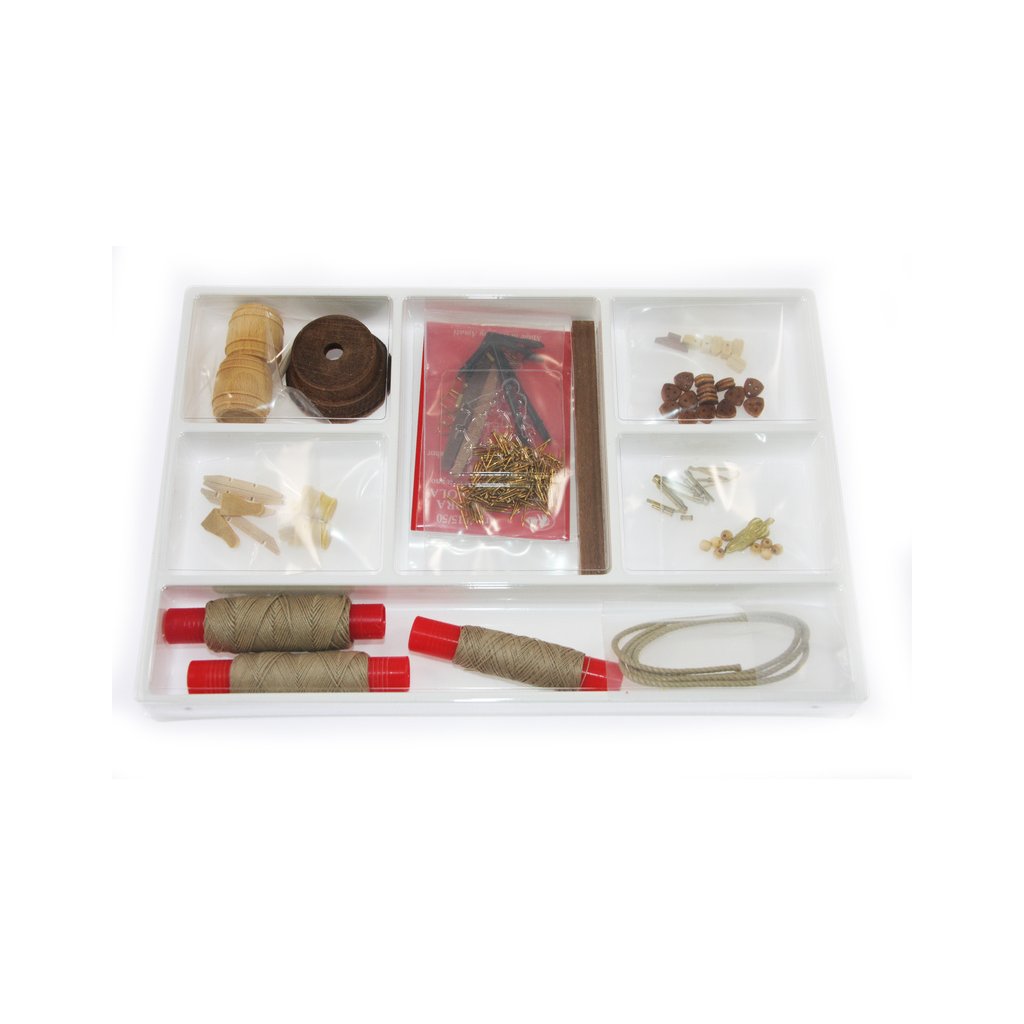 Balení obsahuje sadu překližkových dílů, sadu dřevěných lišt o různém průřezu, blistr s drobnými díly, sadu výkresů a vícejazyčný manuál.