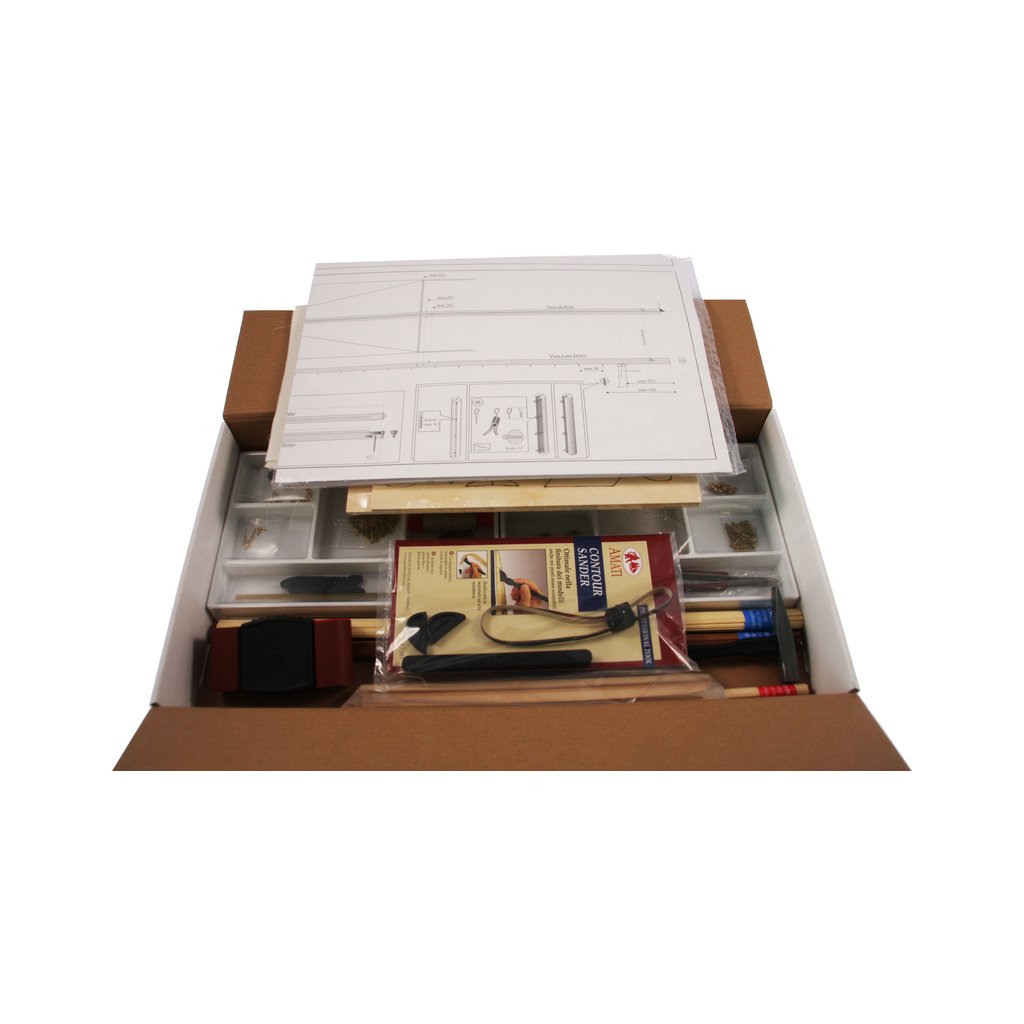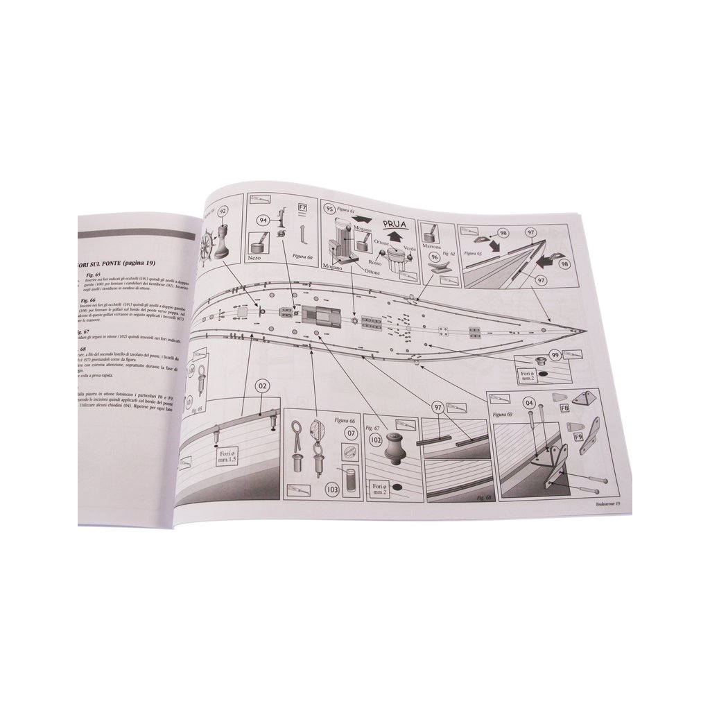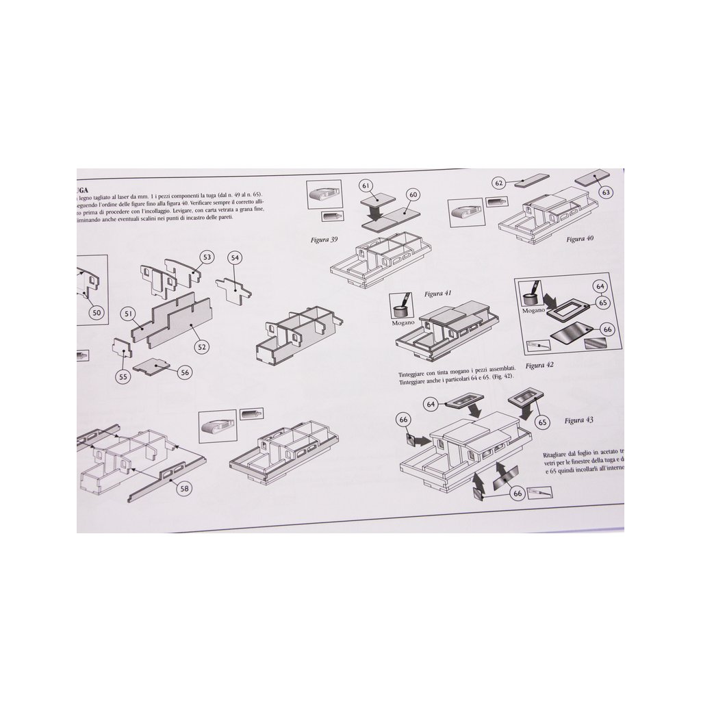 Balení obsahuje sadu překližkových dílů, sadu dřevěných lišt o různém průřezu, blistr s drobnými díly, sadu výkresů, obrázkový manuál s italskými popisky a německý překlad.