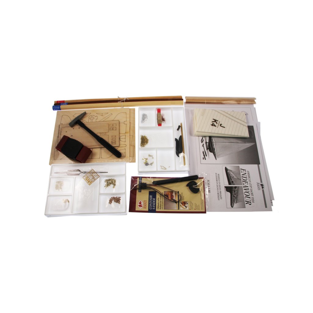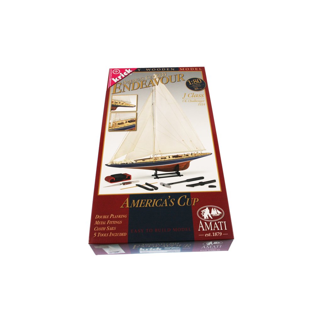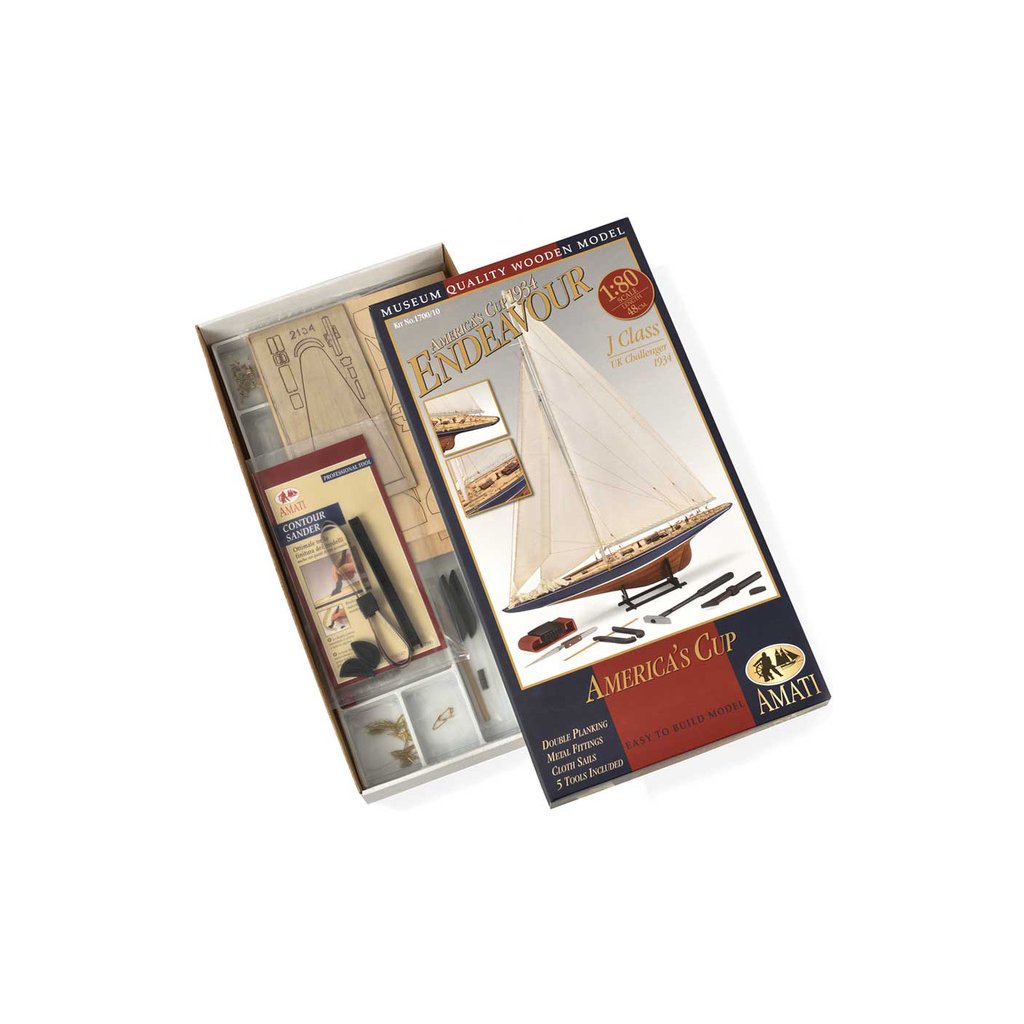 Stavebnice statické makety historické lodi AMATI Endeavour plachetnice 1934 1:80 kit. Škuner Endeavour slavil vítězství v prvním závodu Amerického poháru 1934. Dřevěné díly jako kýl a obšívka jsou řezány laserem, obsaženy jsou plachty, lanoví, doplňky. V balení je i sada nářadí.