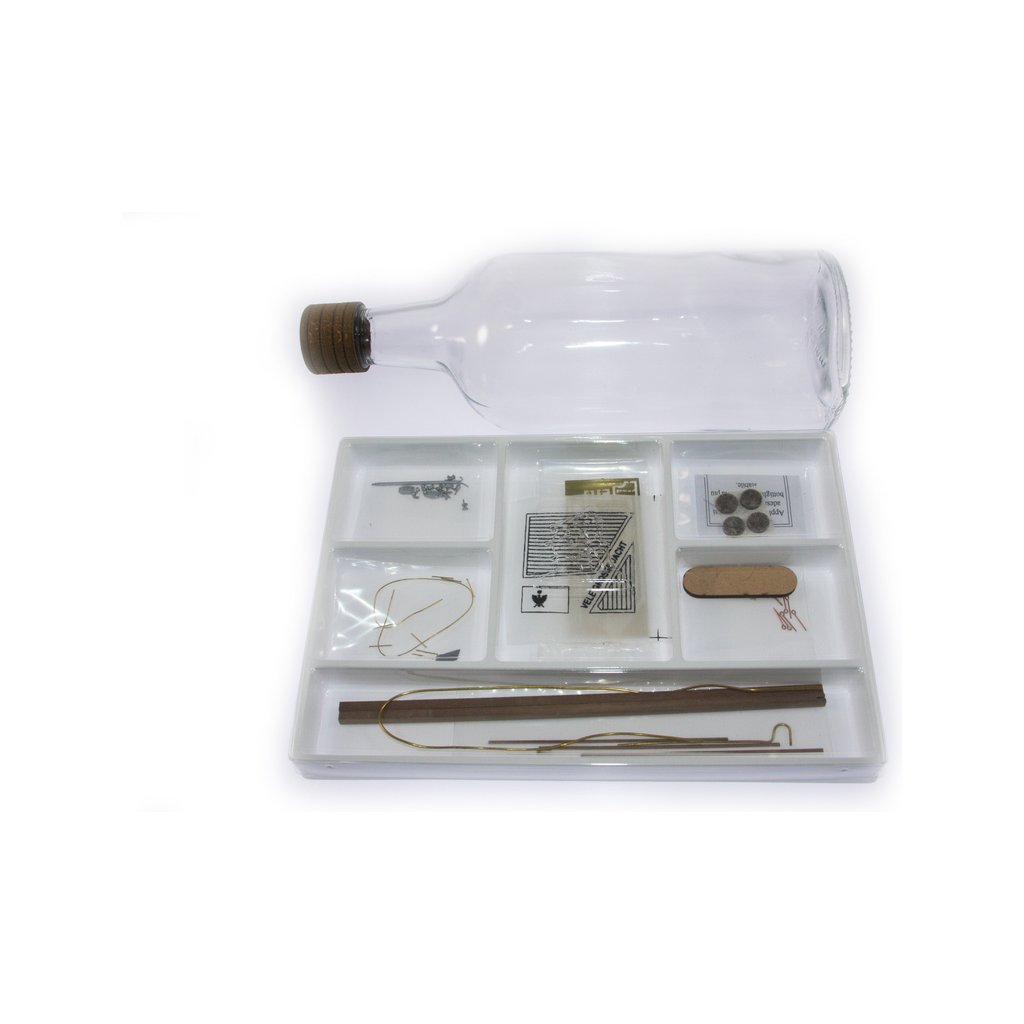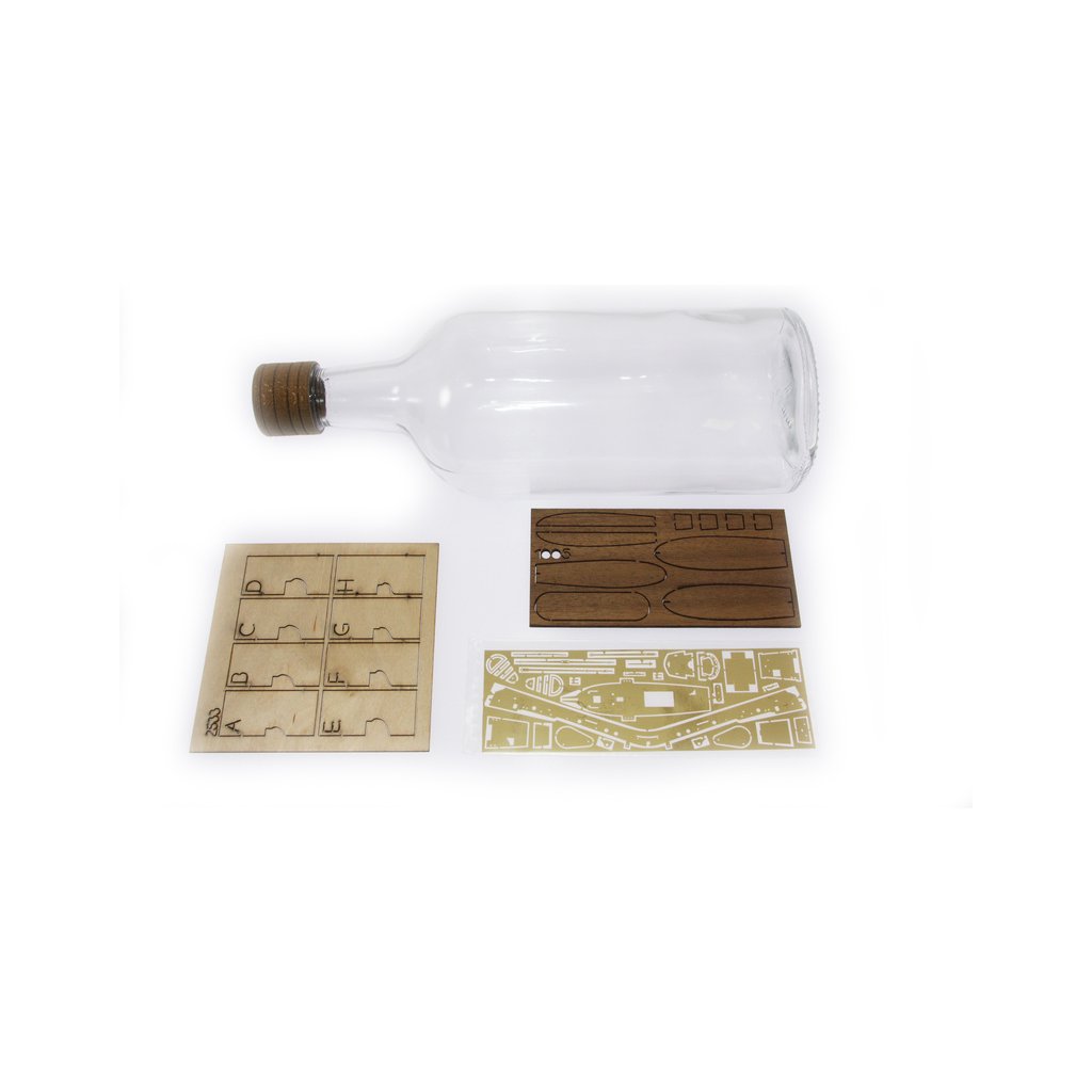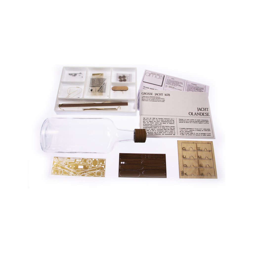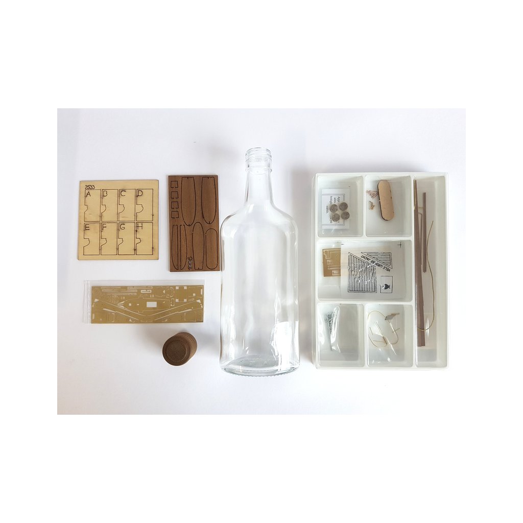Balení obsahuje hotový polotovar trupu, překližkové díly, dřevěné lišty, skleněná láhev, blistr s drobnými díly, sadu výkresů a návod anglický a italský.