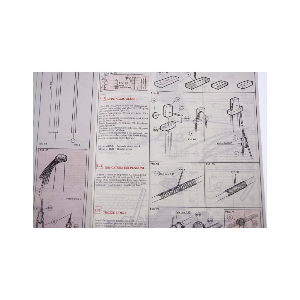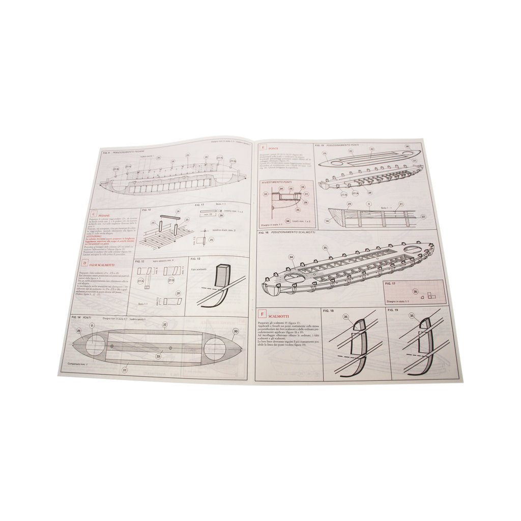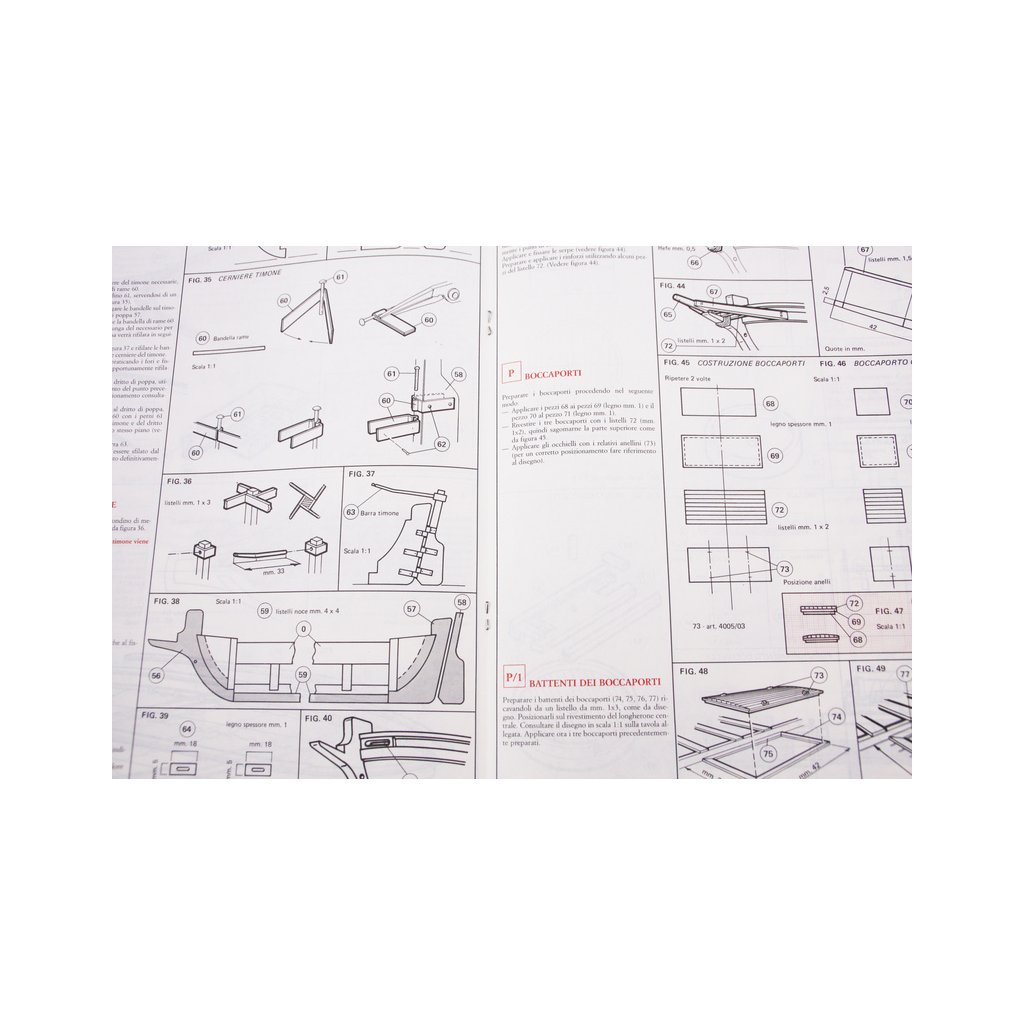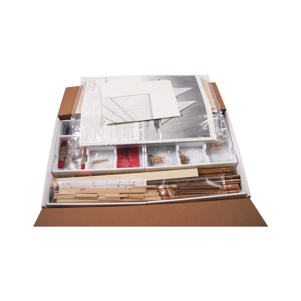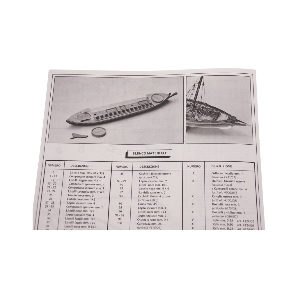 Balení obsahuje hotový polotovar trupu, překližkové díly, dřevěné lišty, skleněná láhev, blistr s drobnými díly, sadu výkresů a návod anglický a italský.
