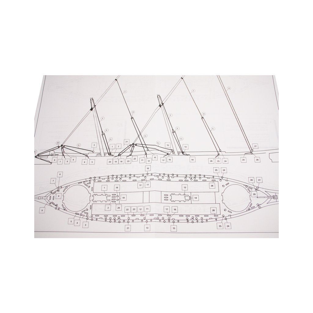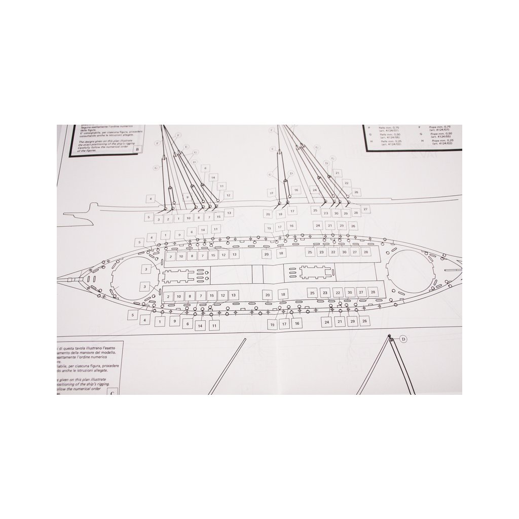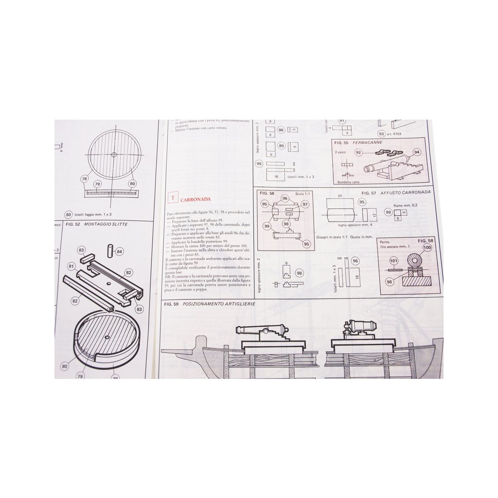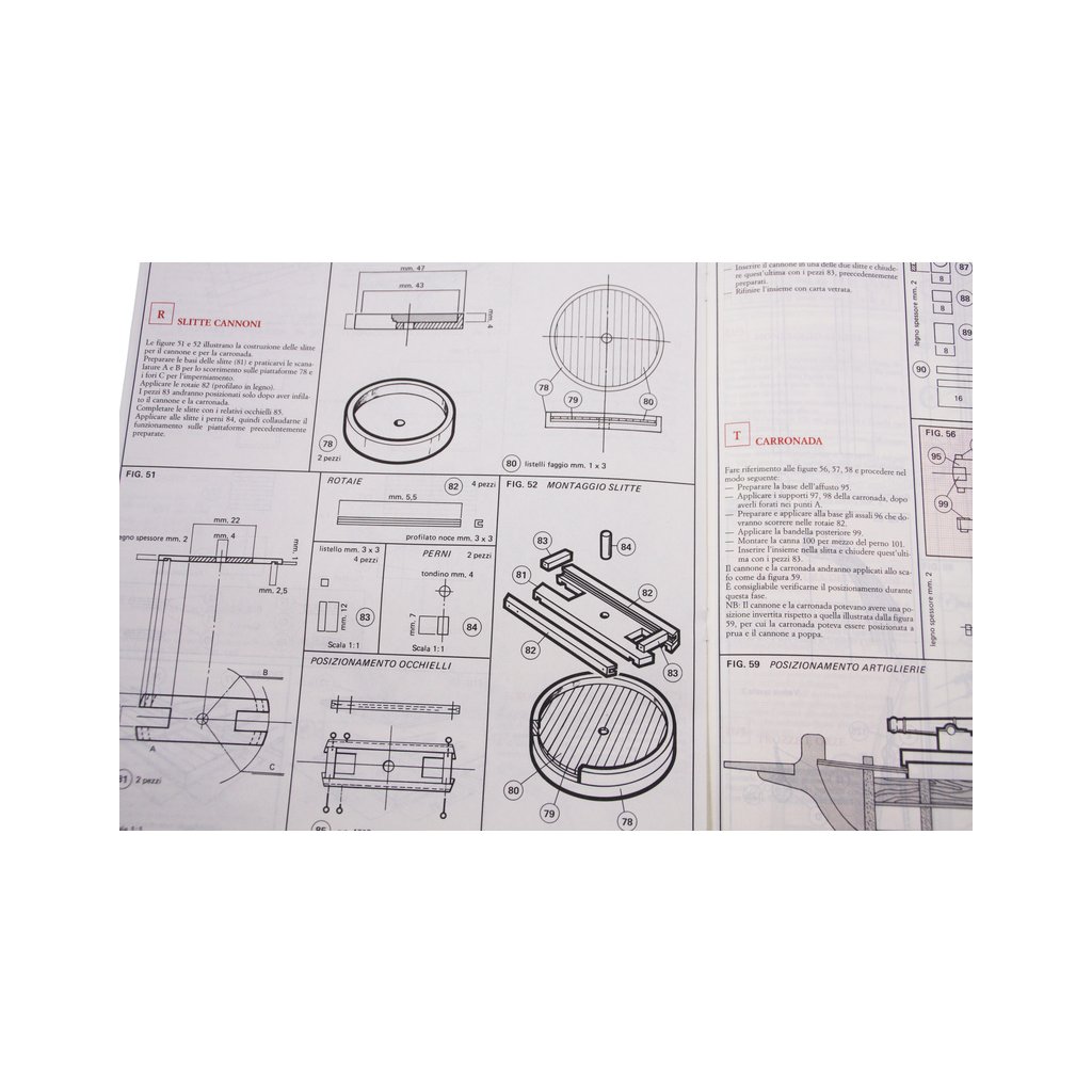 Balení obsahuje hotový polotovar trupu, překližkové díly, dřevěné lišty, skleněná láhev, blistr s drobnými díly, sadu výkresů a návod anglický a italský.