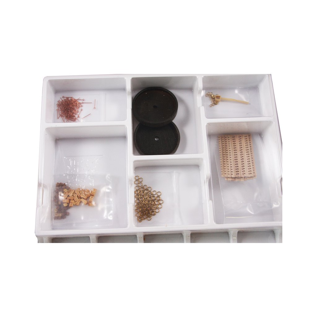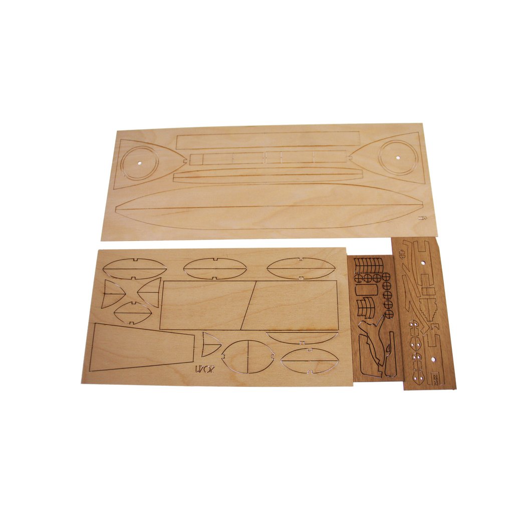 Po otevření víka krabice naleznete dřevěné díly modelu, drobné součásti uzavřené v plastovém průhledném blistru a sadu výkresů.