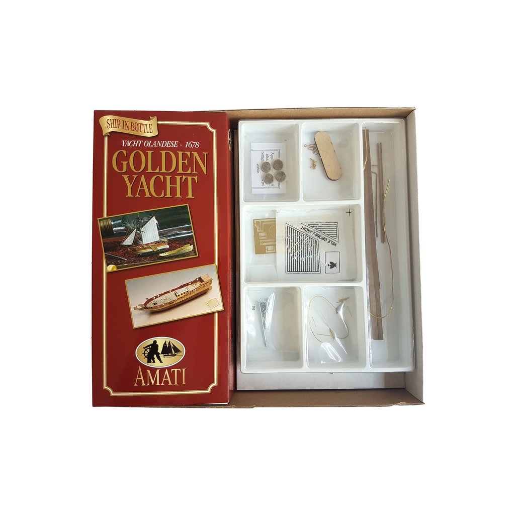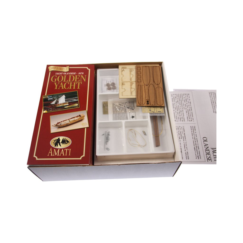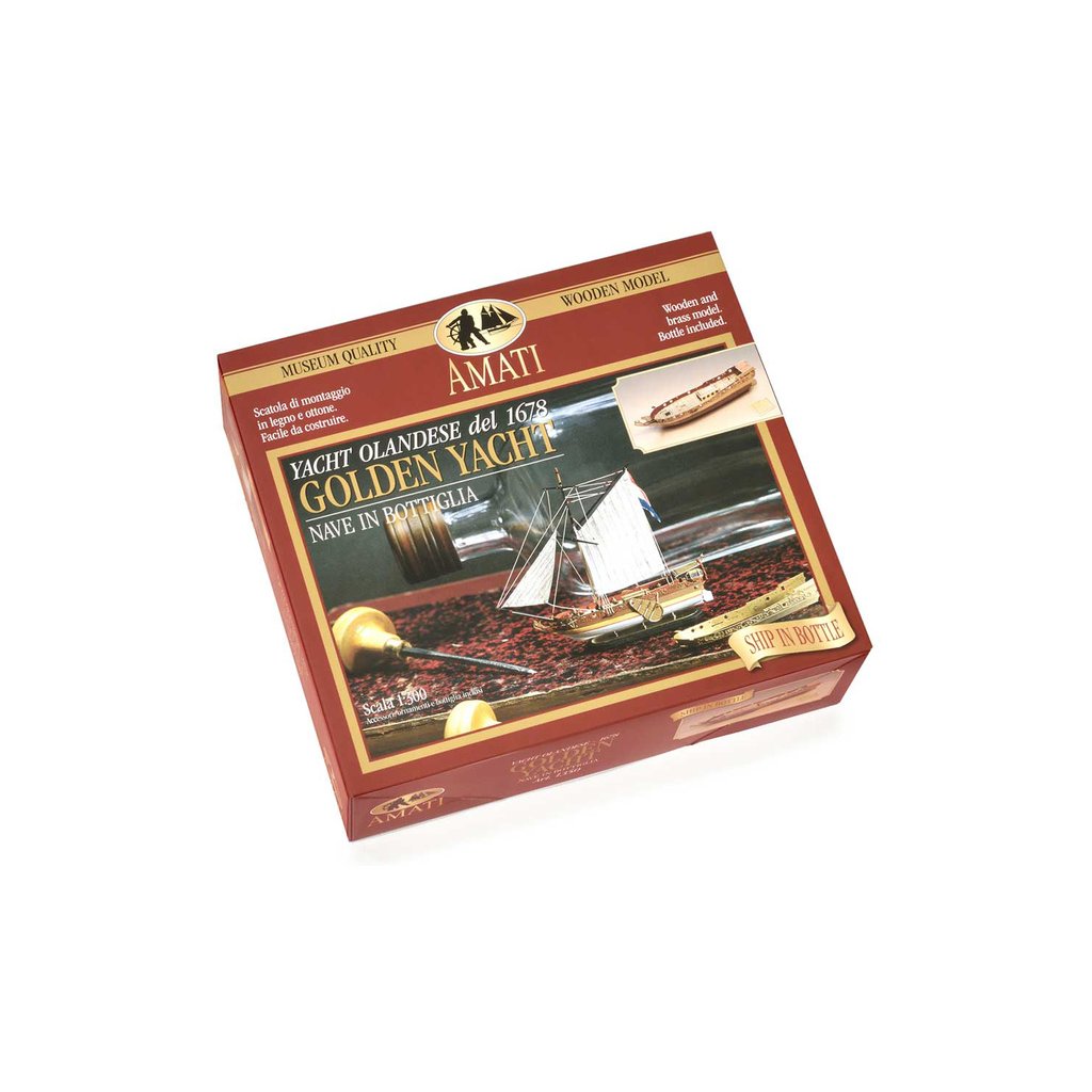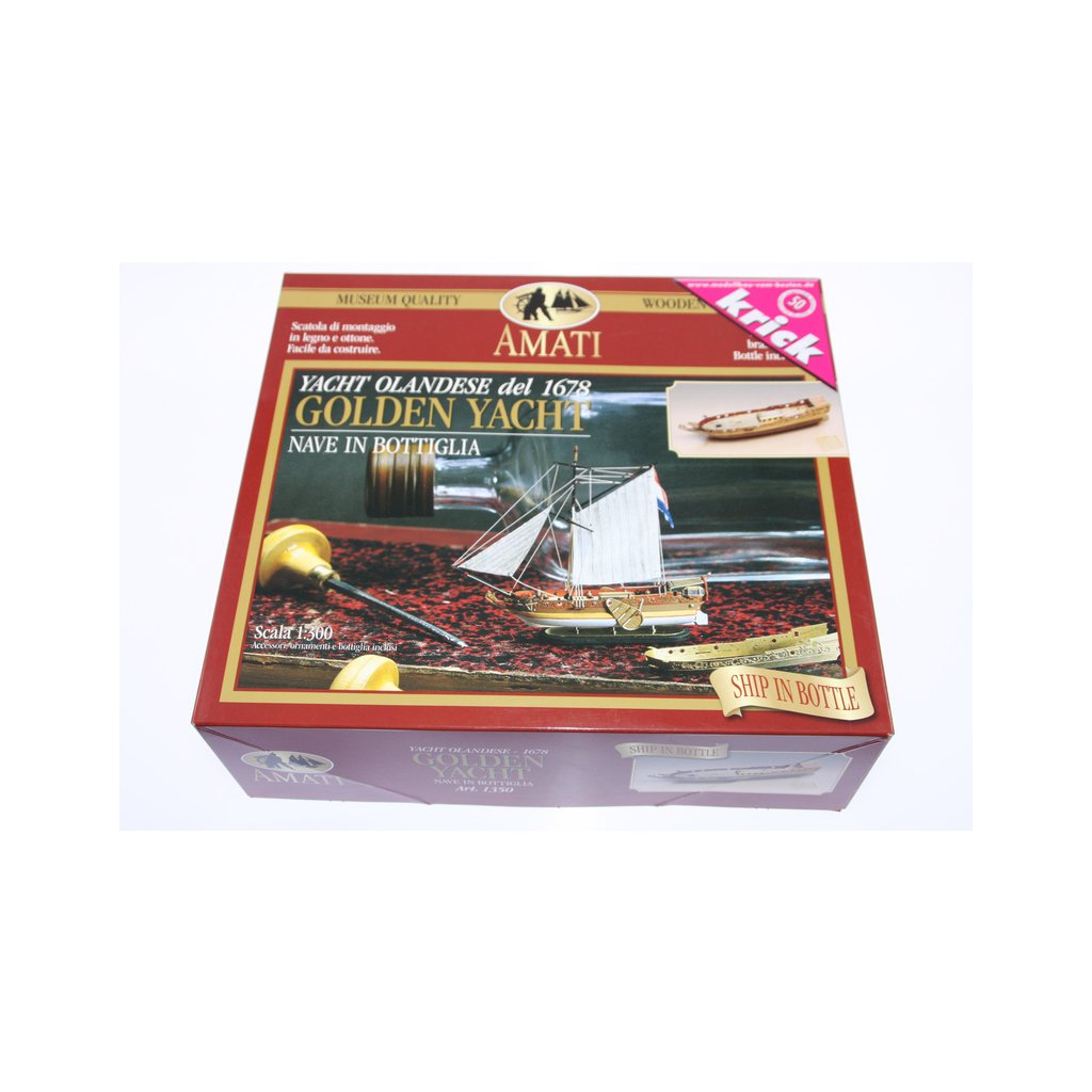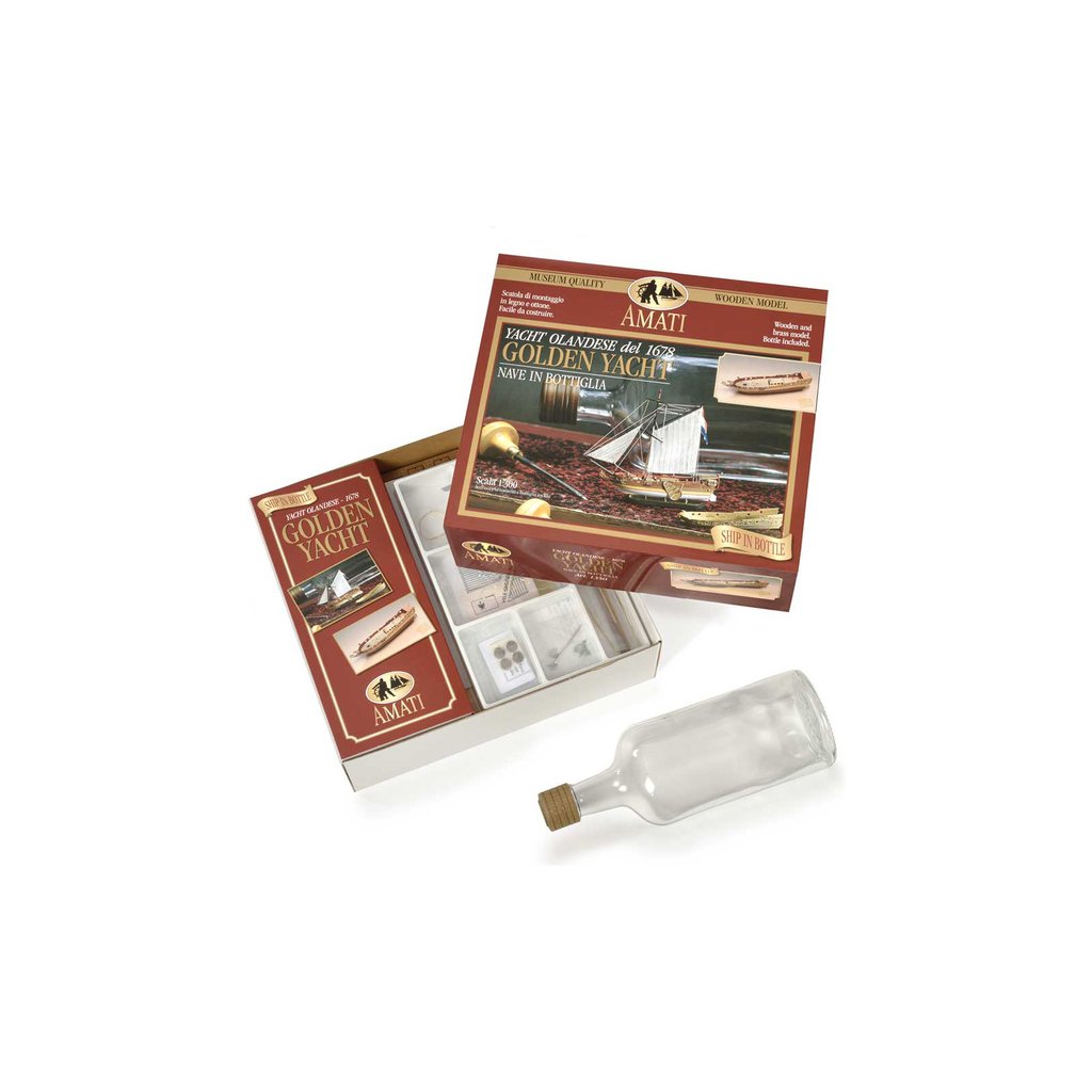 Sníte o historické lodi ve skleněné láhvi? Dřevěná stavebnice modelu lodi Golden Yacht od AMATI v měřítku 1:300 obsahuje vše pro sestavení a vy si můžete dopřát to potěšení a uskutečnit stavbu lodi v láhvi. Balení obsahuje laserem řezané dřevěné díly, leptaná mosazná paluba, kýl, kování, ozdobné prvky a krásná skleněná láhev a samozřejmě obrázkový návod ke sestavení.