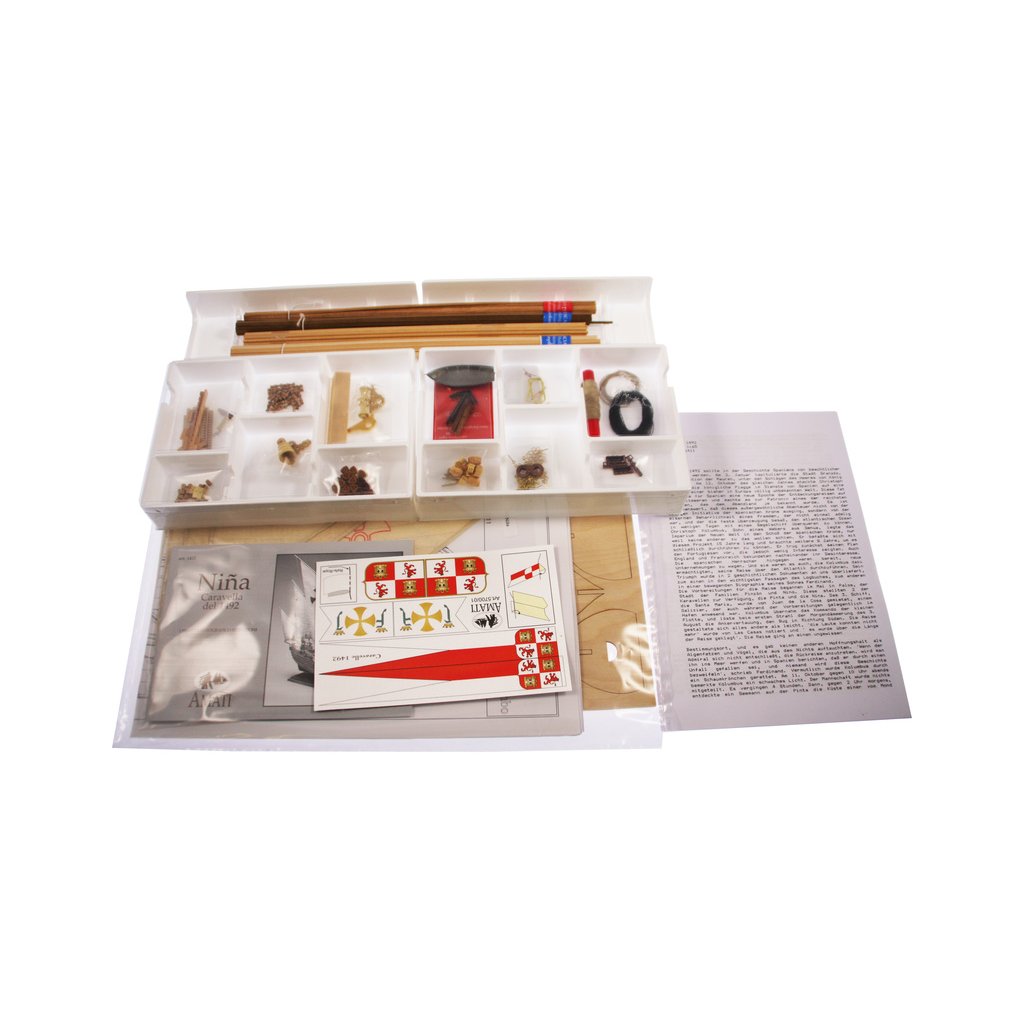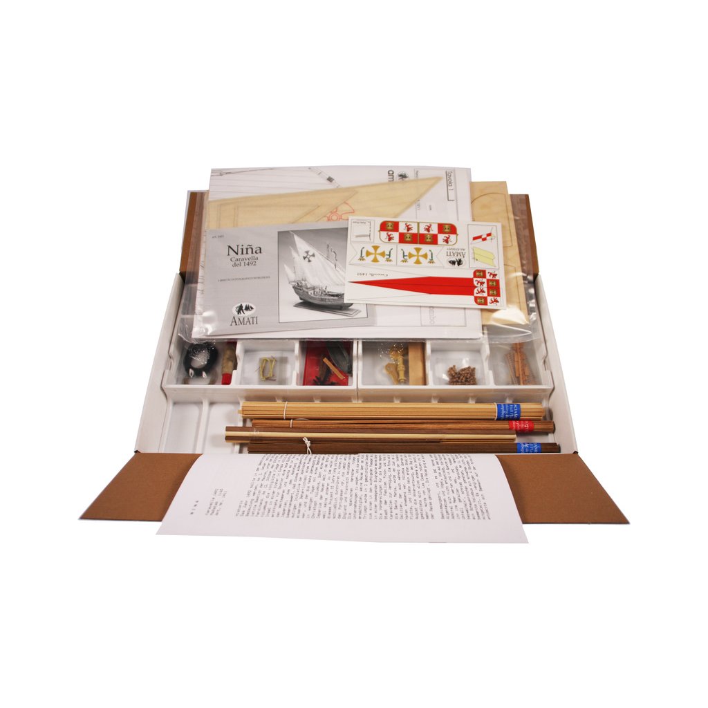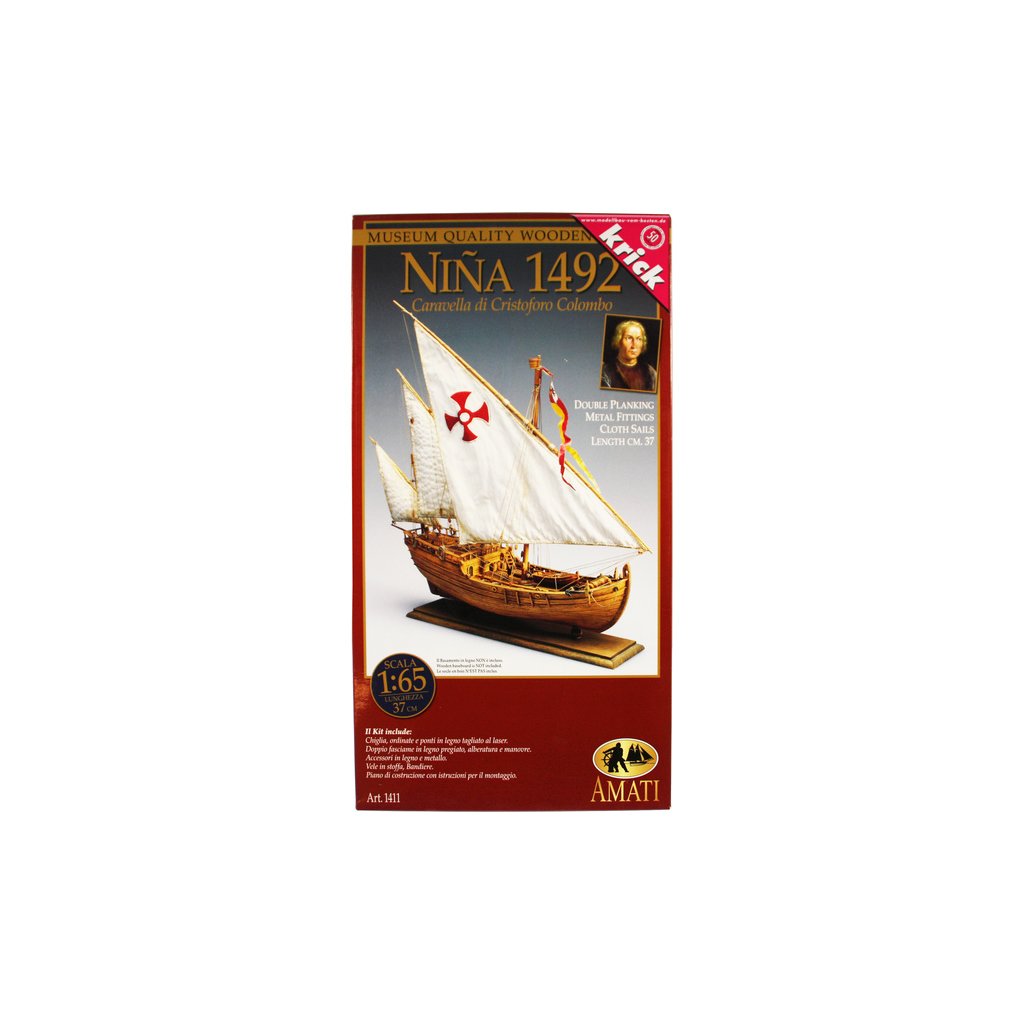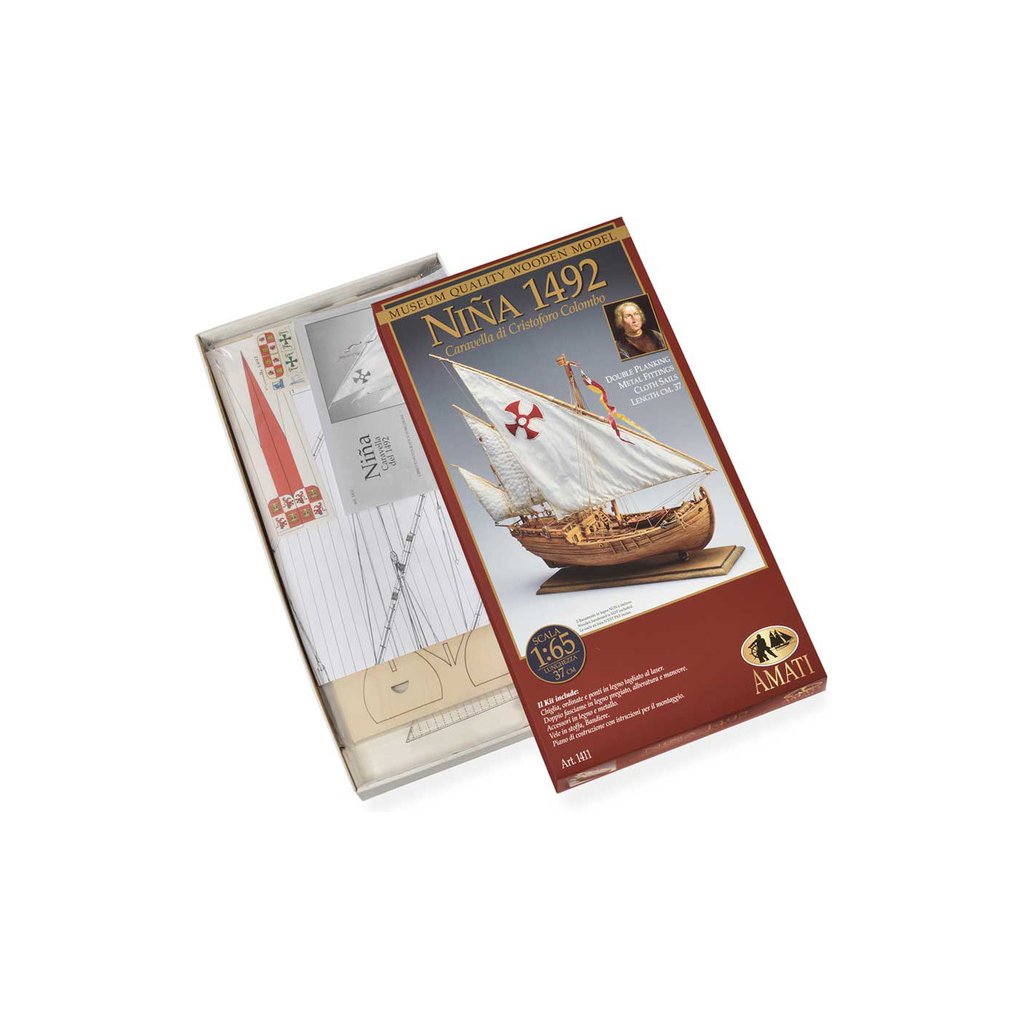 Stavebnice statické makety lodi, AMATI Niňa karavela z roku 1492 v měřítku 1:65 kit. Jedna ze tří lodí, s nimiž Kryštof Kolumbus objevil Ameriku. Tento model je součástí série Columbus společnosti AMATI. Dřevěné díly jako kýl a obšívka jsou řezány laserem, obsahuje plachty, lanoví, stožáry, kování a plány.