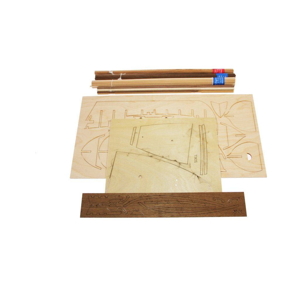 Balení obsahuje sadu překližkových dílů, sadu dřevěných lišt o různém průřezu, blistr s drobnými díly, sadu výkresů a vícejazyčný manuál.