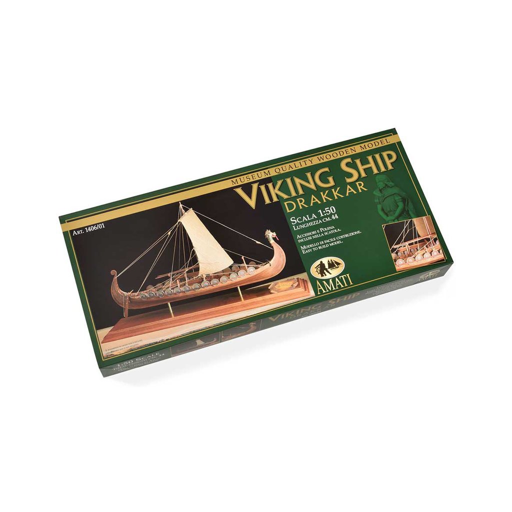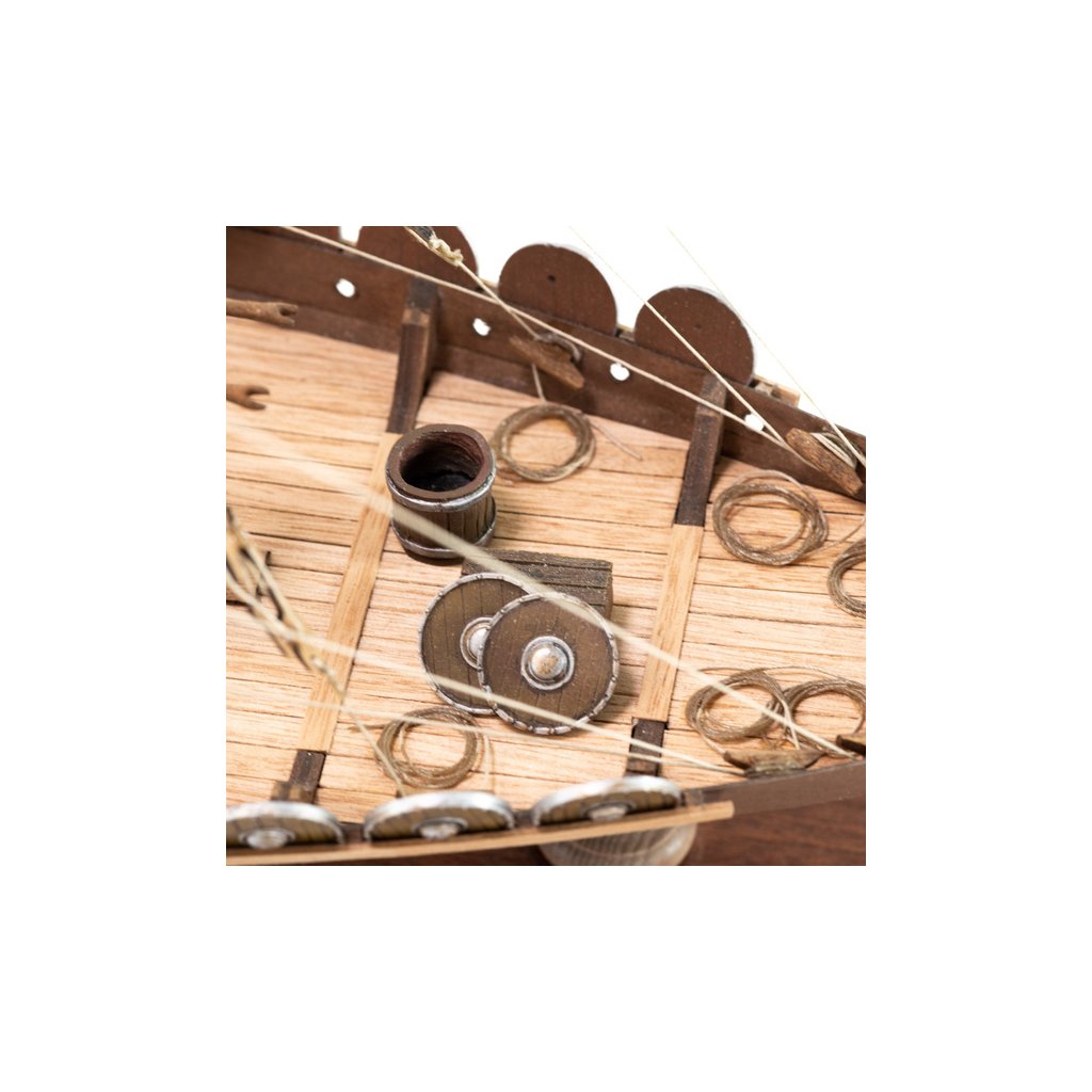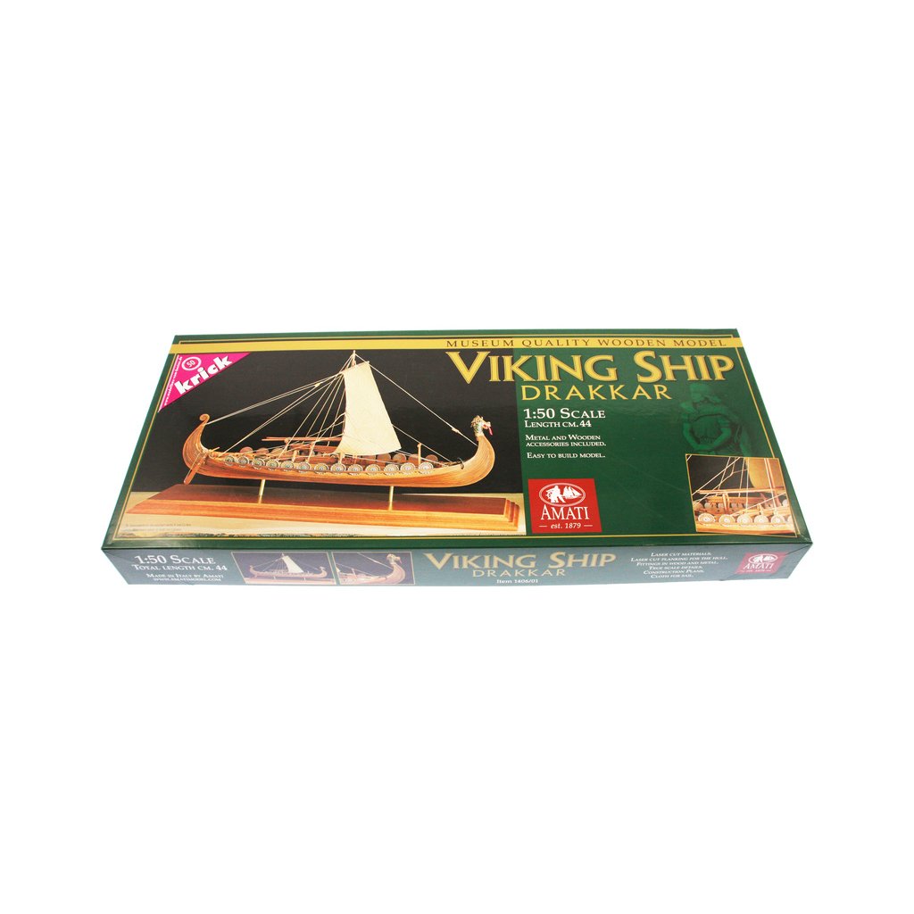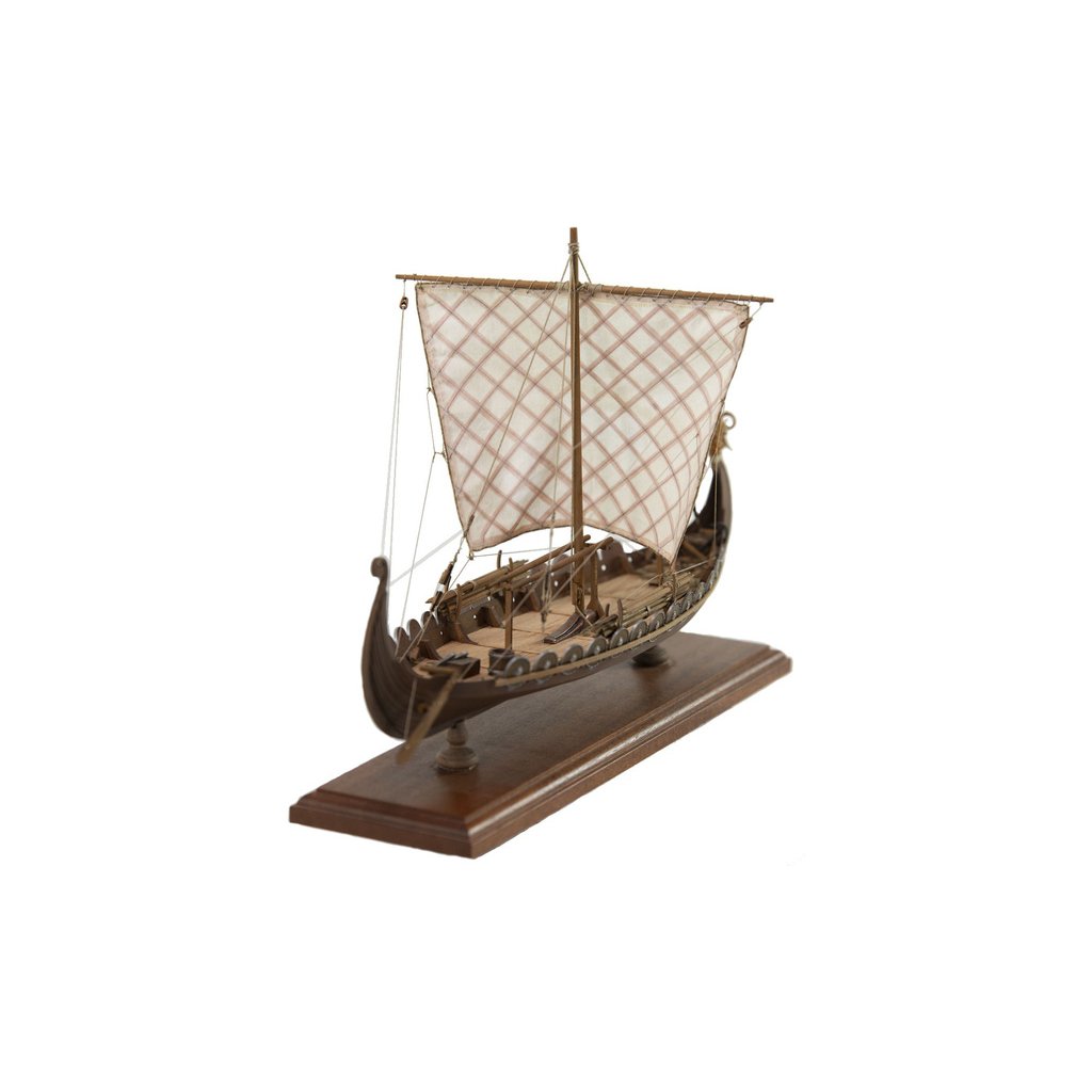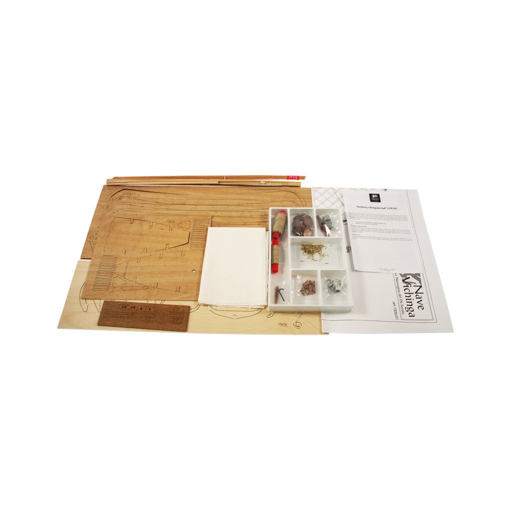 Stavebnice statické makety historické lodi AMATI Oseberg vikingská loď 1:50 kit. Loď lrále Olafa Tryggvessona se stala legendou Severního moře. Tyto lodě byly zdobeny dračí hlavou a mohly dosahovat délky až 48 metrů. Vikingské lodě musely být lehké a dobře manévrovatelné. Dřevěné díly jako kýl a obšívka jsou řezány laserem, obsaženy jsou plachty, lanoví, doplňky.