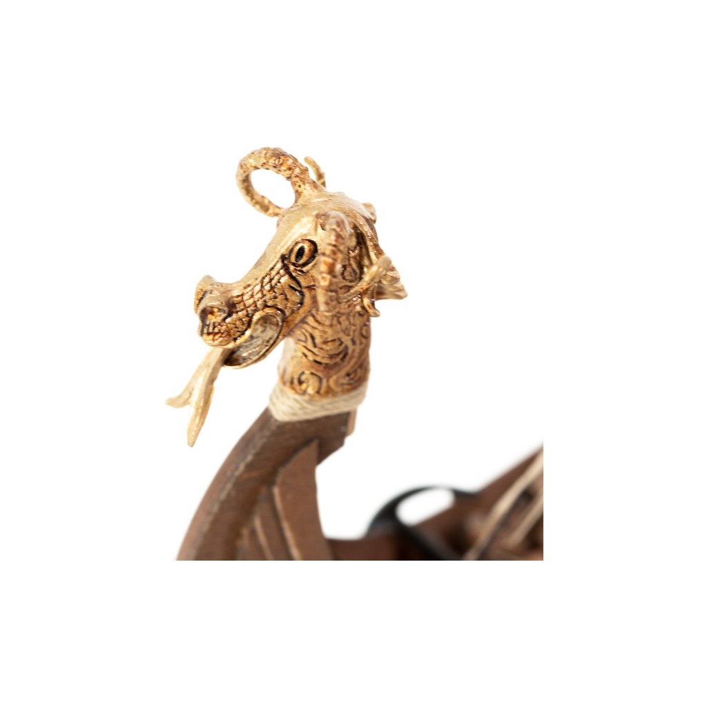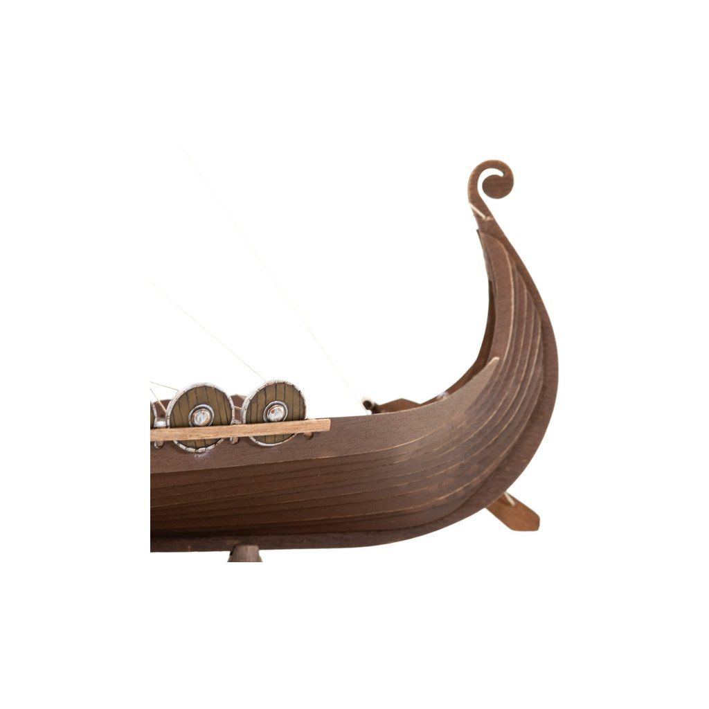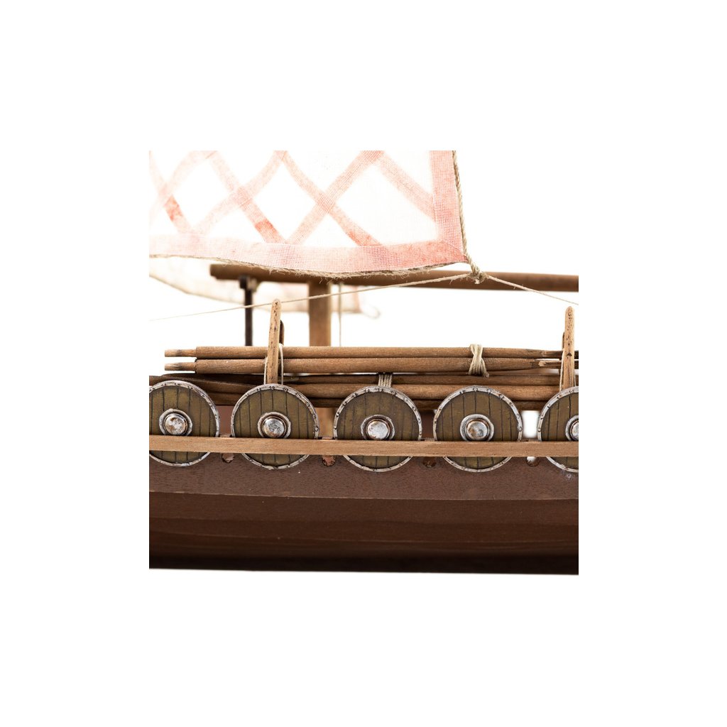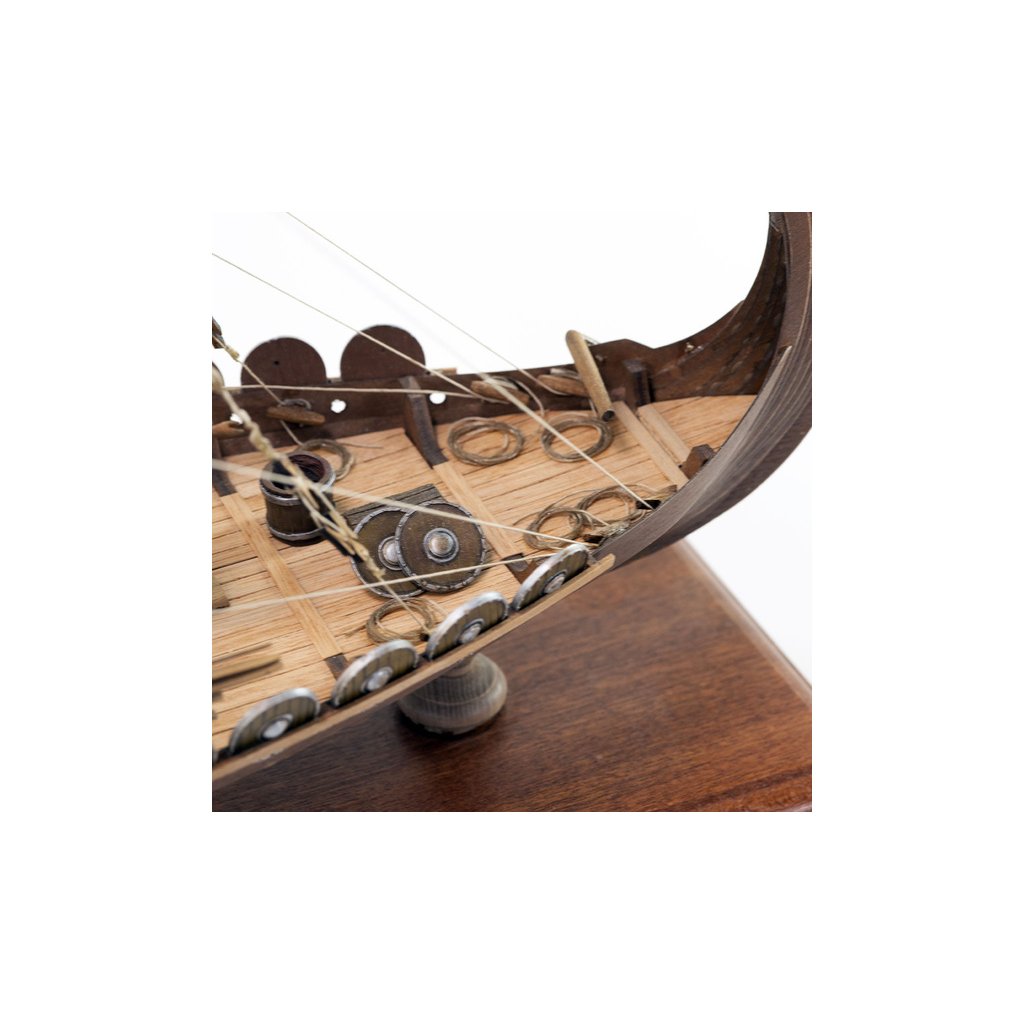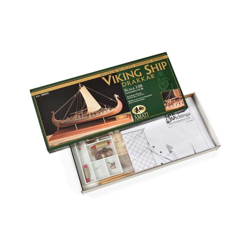 Stavebnice statické makety historické lodi AMATI Oseberg vikingská loď 1:50 kit. Loď lrále Olafa Tryggvessona se stala legendou Severního moře. Tyto lodě byly zdobeny dračí hlavou a mohly dosahovat délky až 48 metrů. Vikingské lodě musely být lehké a dobře manévrovatelné. Dřevěné díly jako kýl a obšívka jsou řezány laserem, obsaženy jsou plachty, lanoví, doplňky.