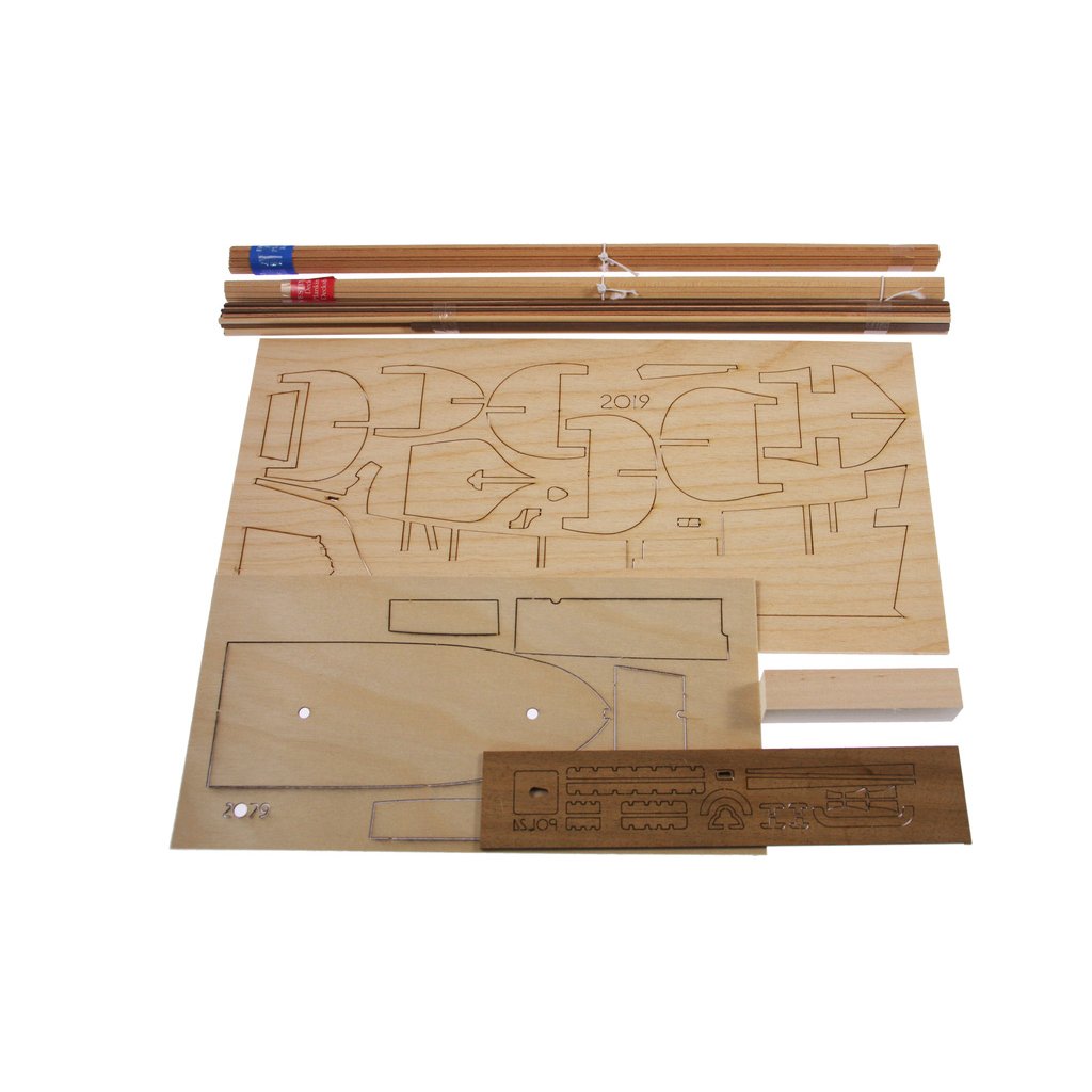 Balení obsahuje sadu překližkových dílů, sadu dřevěných lišt o různém průřezu, blistr s drobnými díly, sadu výkresů a vícejazyčný manuál.