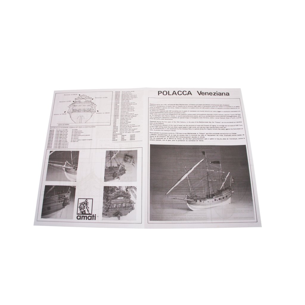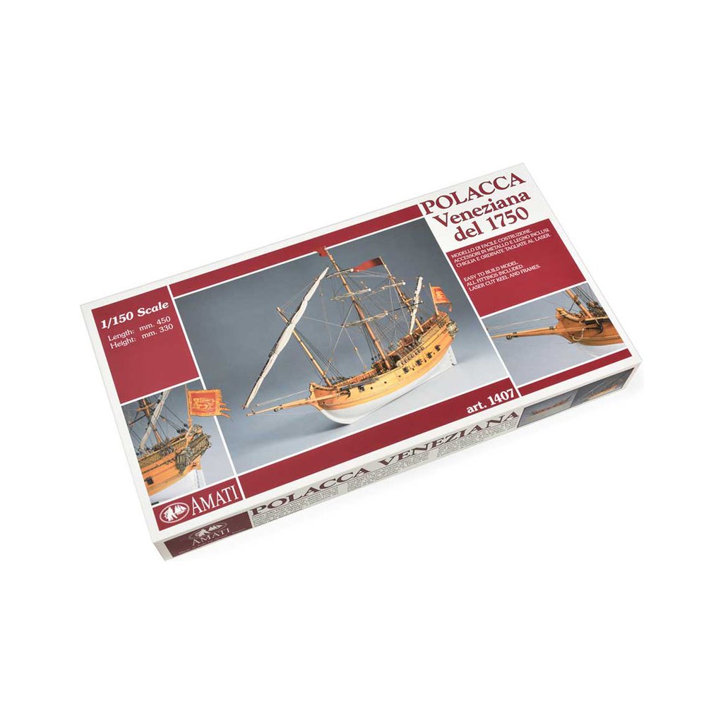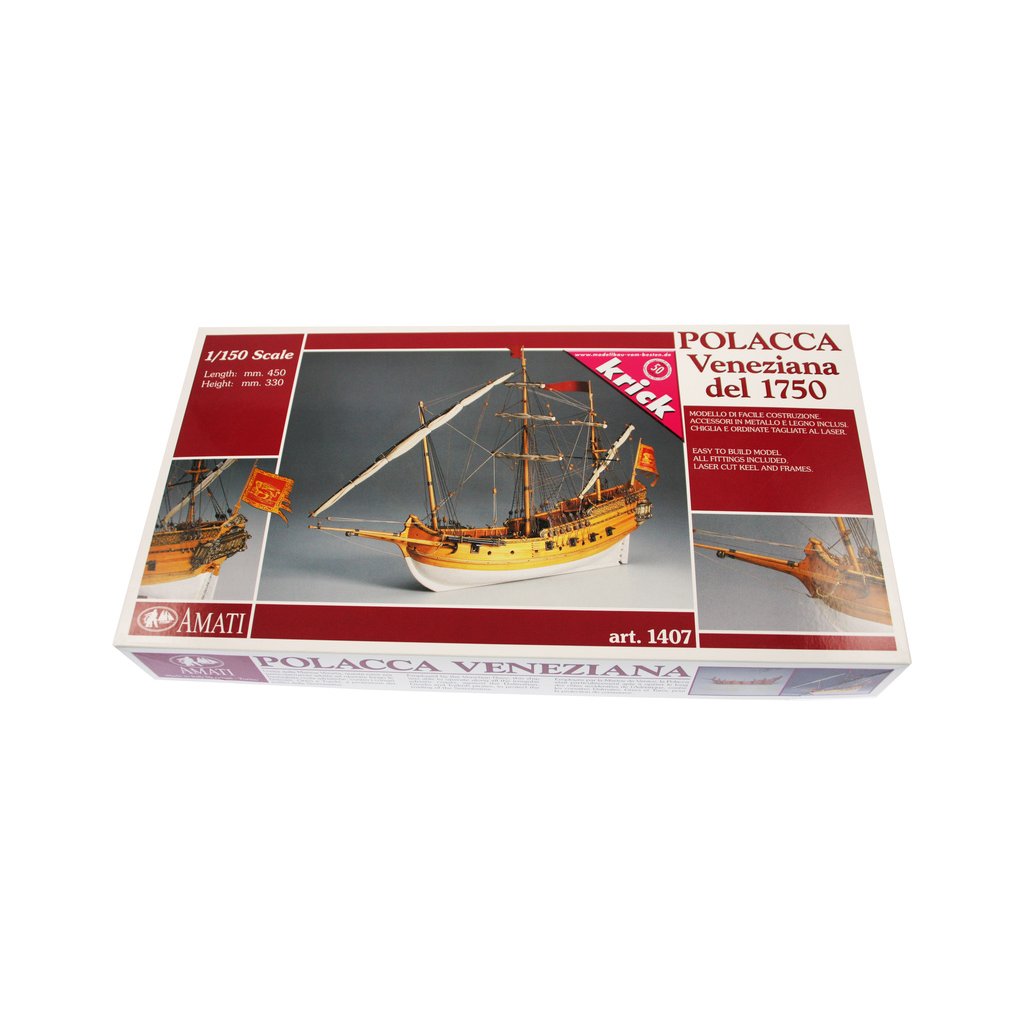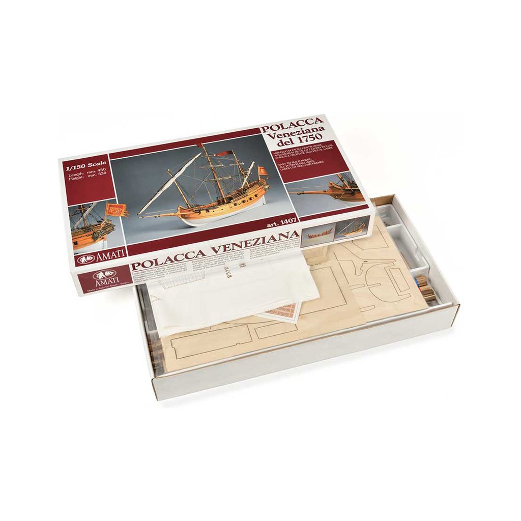 Stavebnice statické makety historické lodi AMATI Polacca benátská loď z roku 1750, verze kit. Plavila se na počátku 18. století ve Středomoří a byla používána jako komerční nebo nákladní loď. Benátská flotila používala Polack k ochraně svých lodních tras od dalmatských, řeckých a tureckých pirátů. Dřevěné díly jako kýl a obšívka jsou řezány laserem, obsaženy jsou stěžně, plachty, lanoví, stejně jako děla, plány a dekorativní stojan pro lodě.
