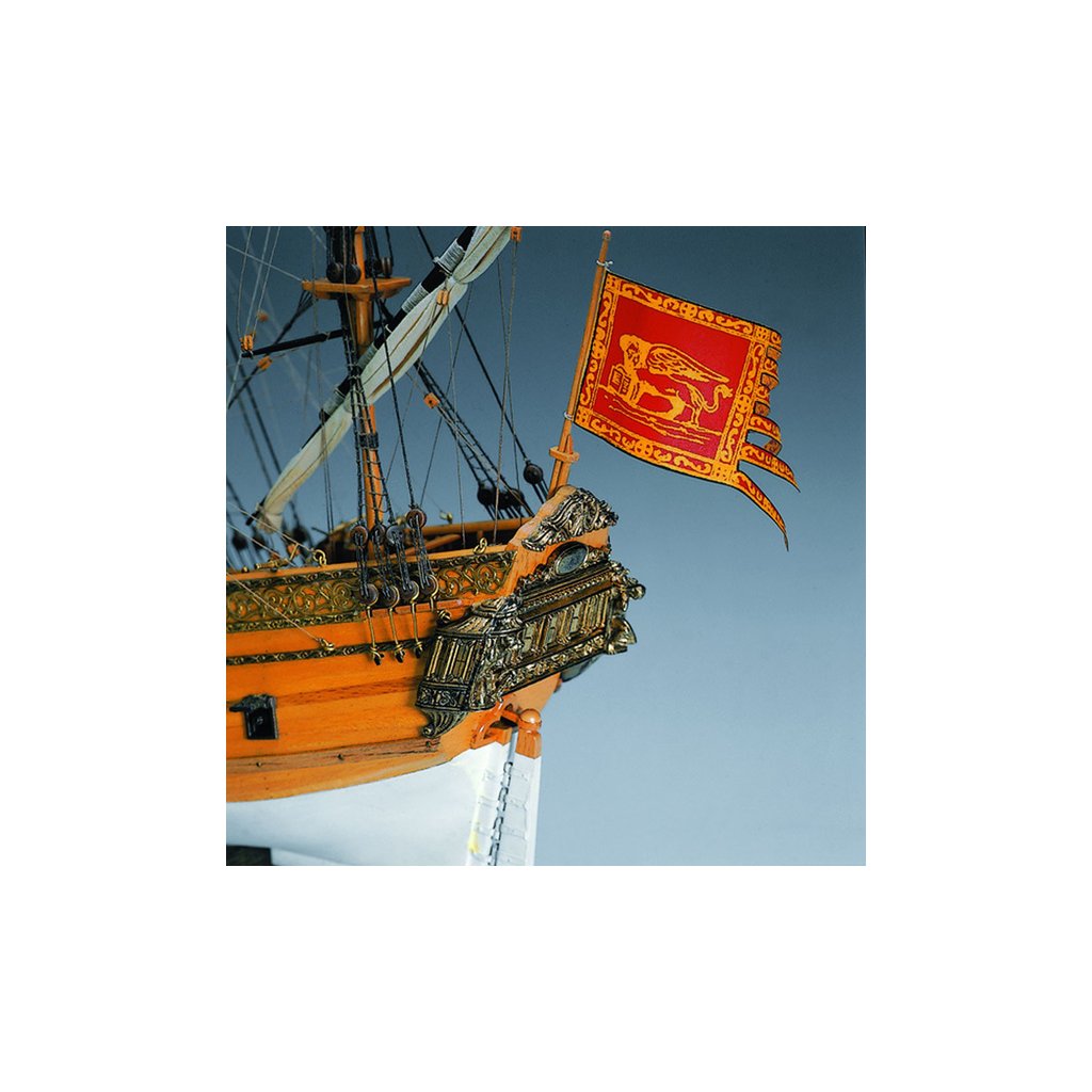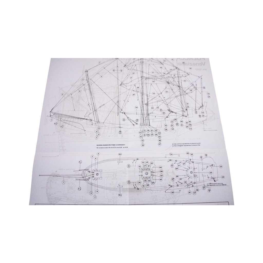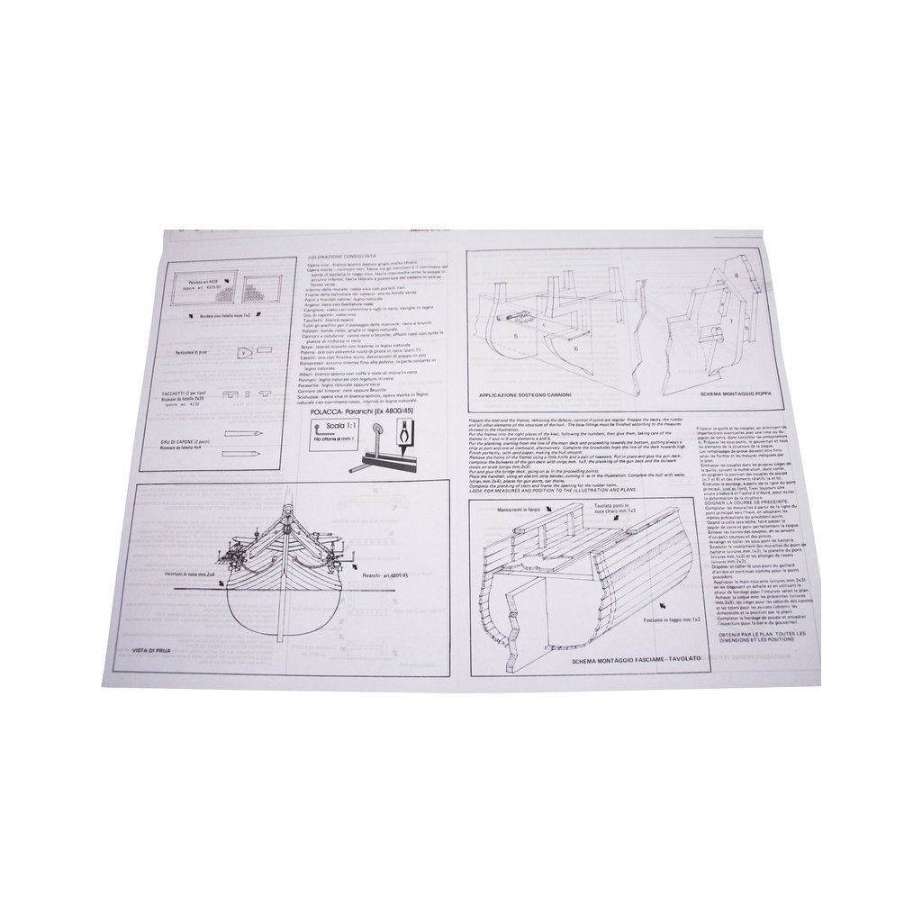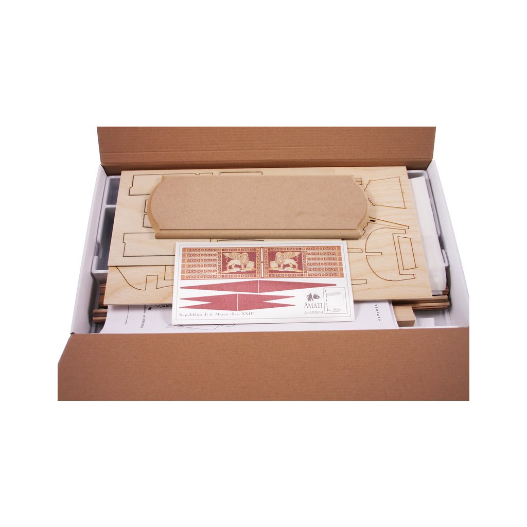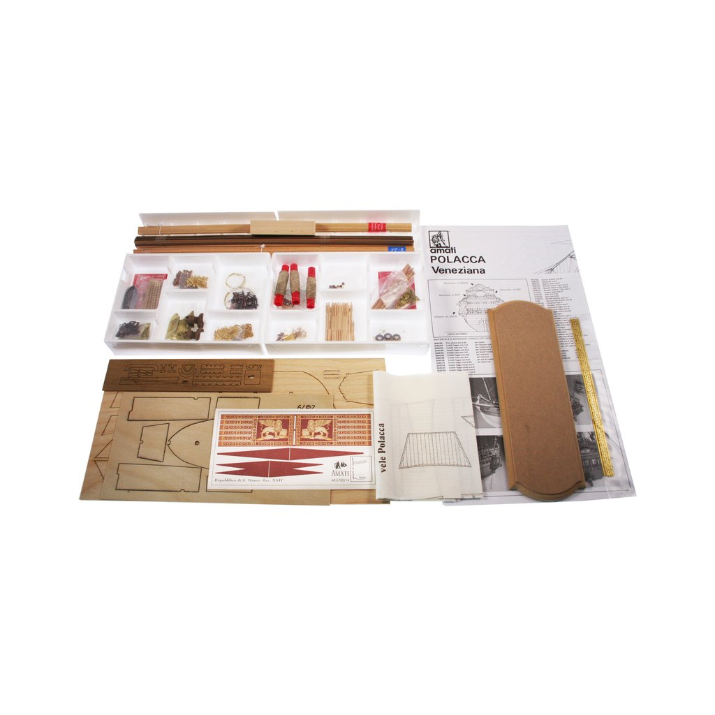 Stavebnice statické makety historické lodi AMATI Polacca benátská loď z roku 1750, verze kit. Plavila se na počátku 18. století ve Středomoří a byla používána jako komerční nebo nákladní loď. Benátská flotila používala Polack k ochraně svých lodních tras od dalmatských, řeckých a tureckých pirátů. Dřevěné díly jako kýl a obšívka jsou řezány laserem, obsaženy jsou stěžně, plachty, lanoví, stejně jako děla, plány a dekorativní stojan pro lodě.