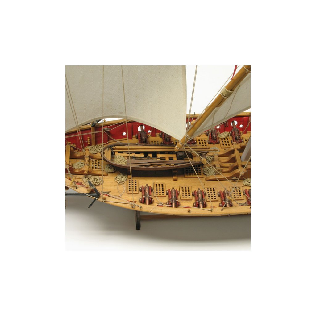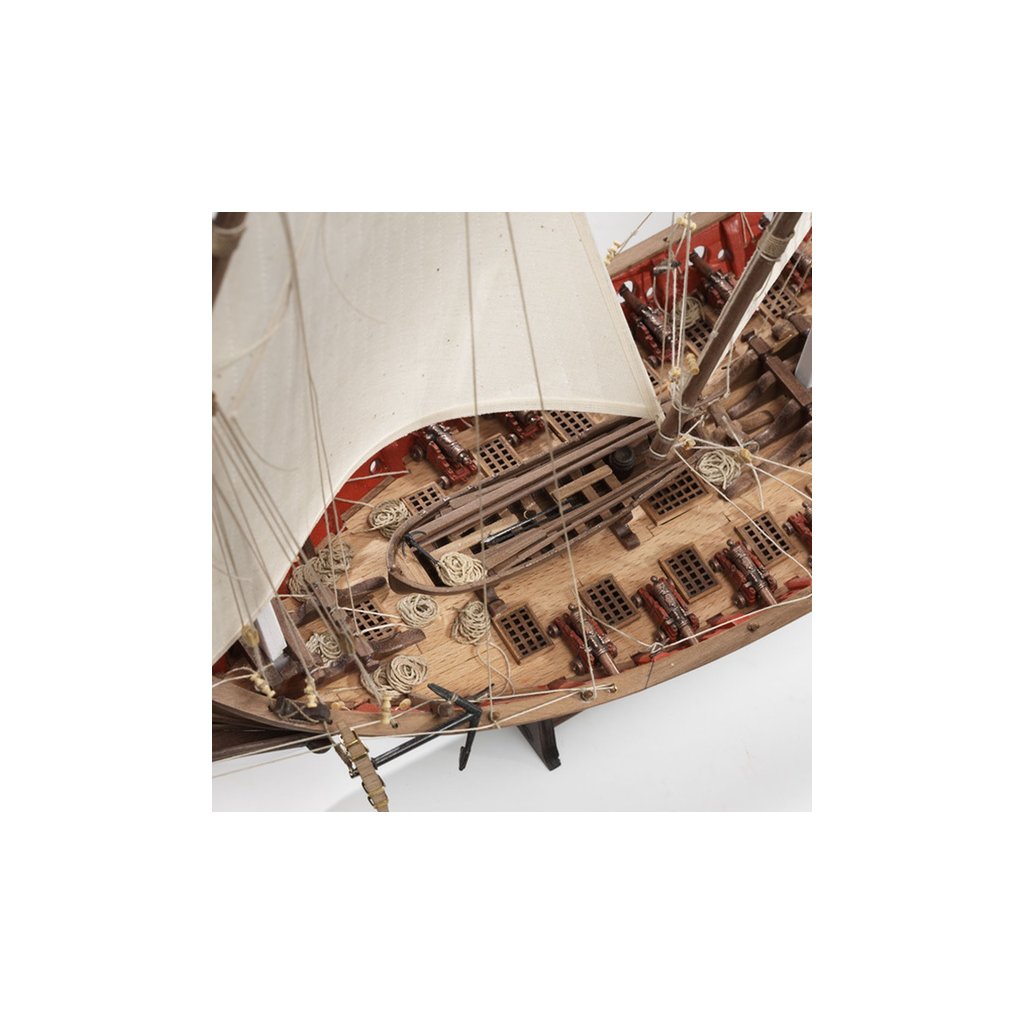 Stavebnice statické makety historické lodi AMATI Sciabecco pirátská loď z roku 1753 v měřítku 1:60, kit. Pirátská loď byla vyzbrojena 14 kanony středních kalibrů. Dřevěné díly jako kýl a obšívka jsou řezány laserem, obsaženy jsou plachty, lanoví, stožáry, kování, doplňky a plány.