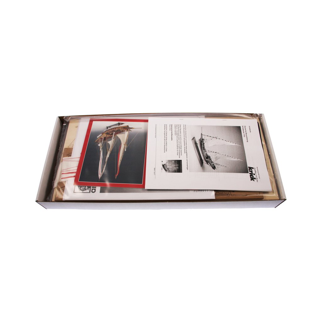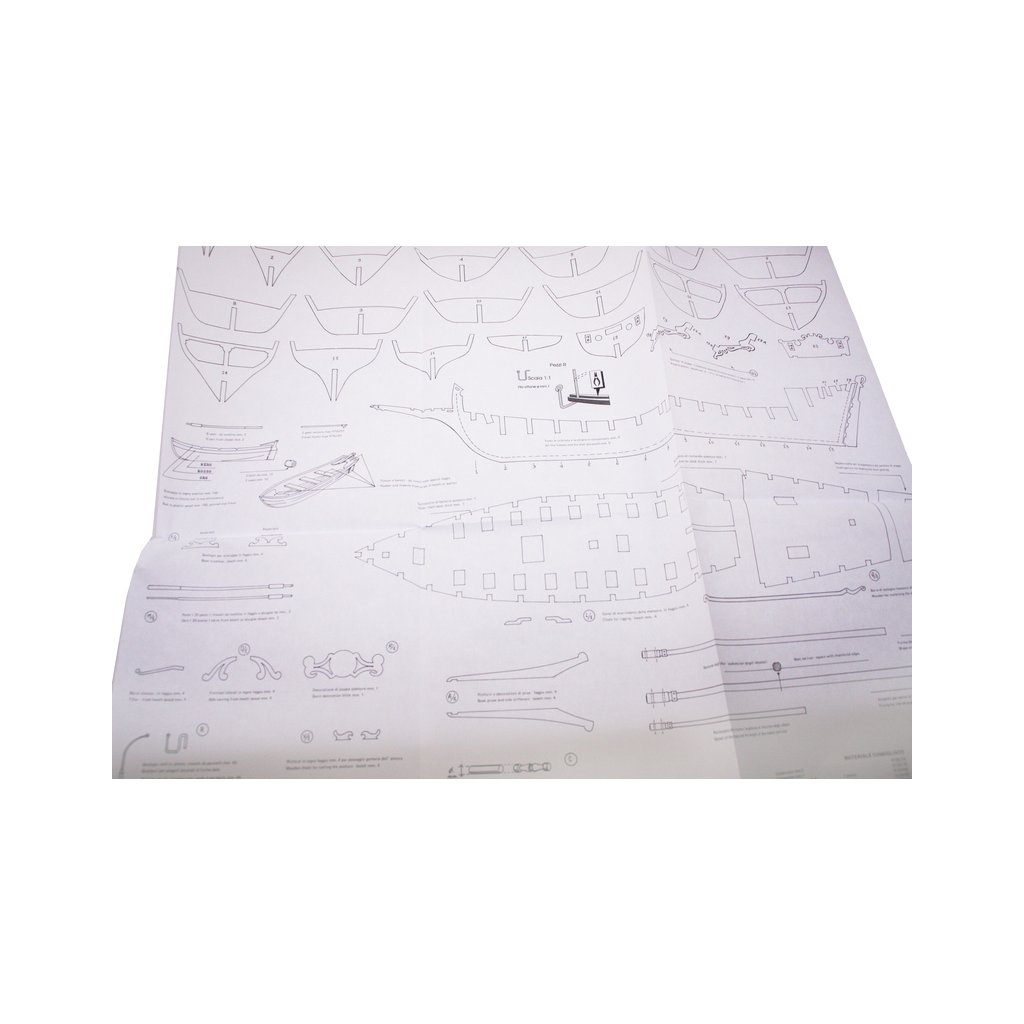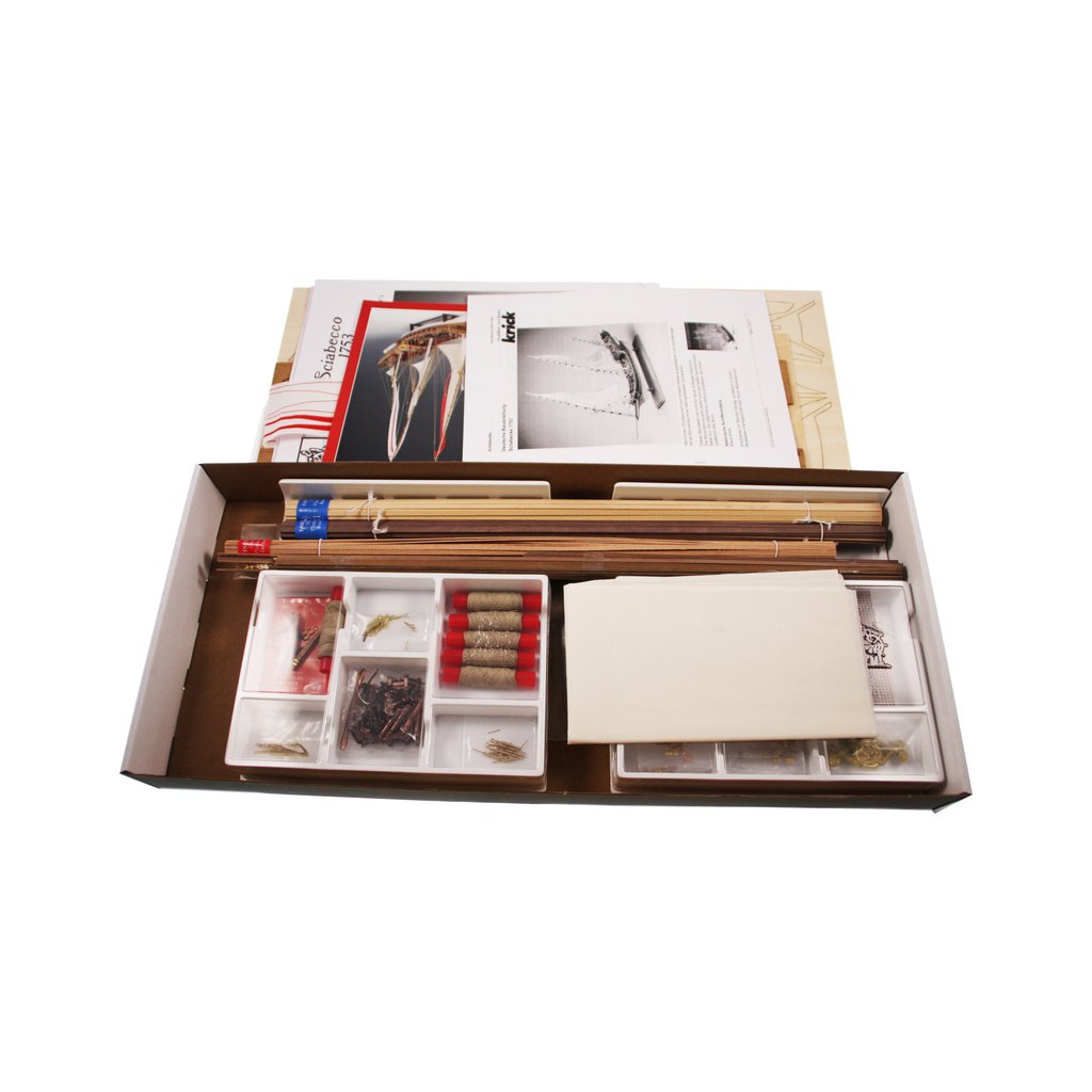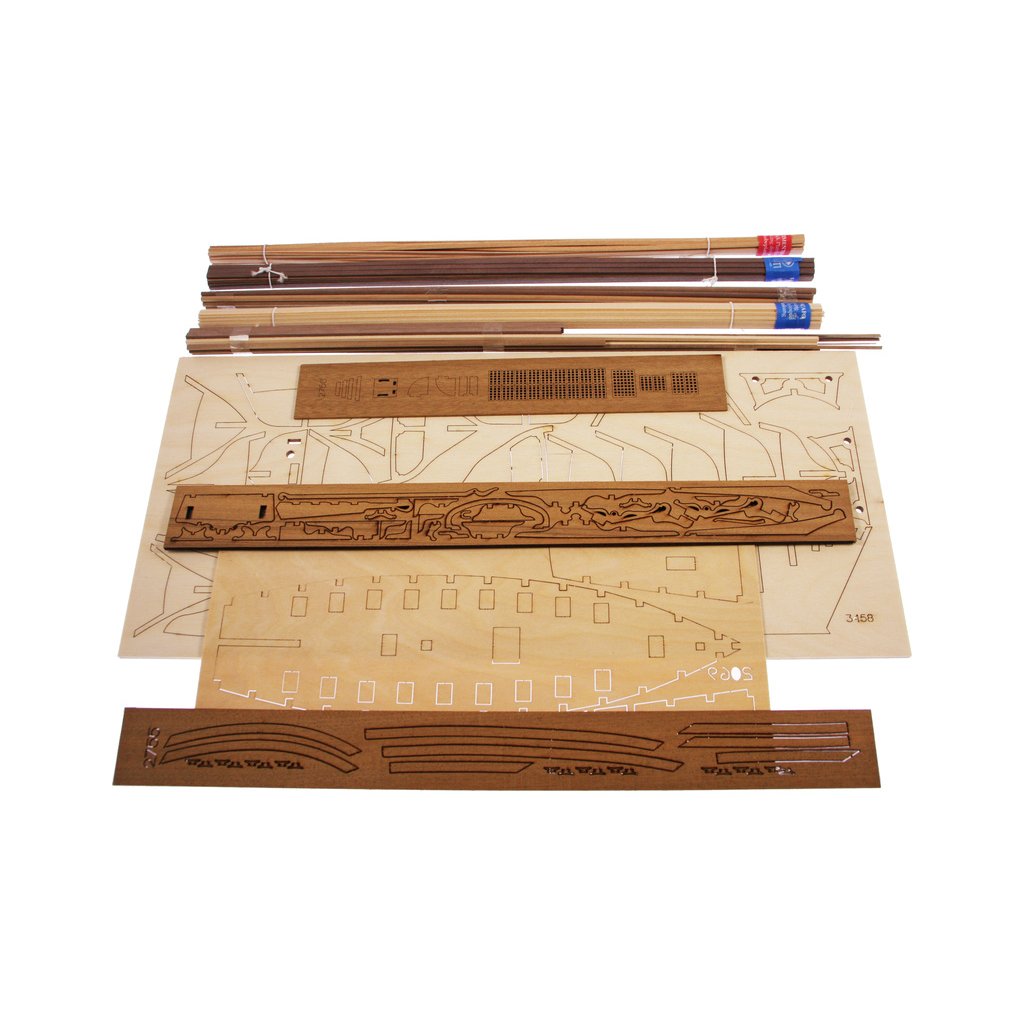 Balení obsahuje sadu překližkových dílů, sadu dřevěných lišt o různém průřezu, blistr s drobnými díly, sadu výkresů a manuál anglický, německý, francouzský a italský.