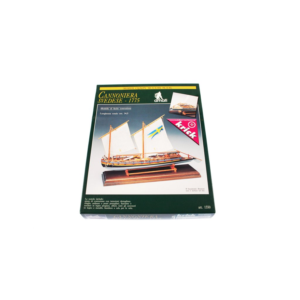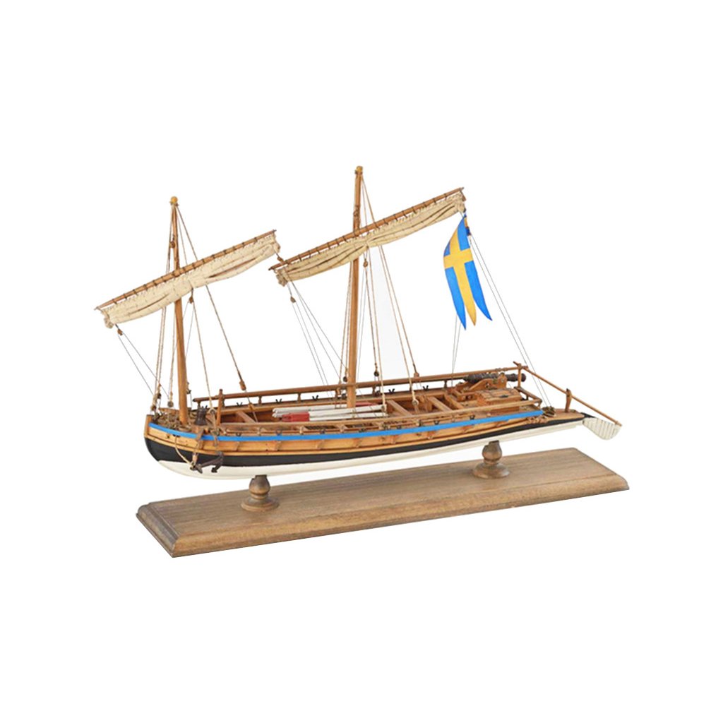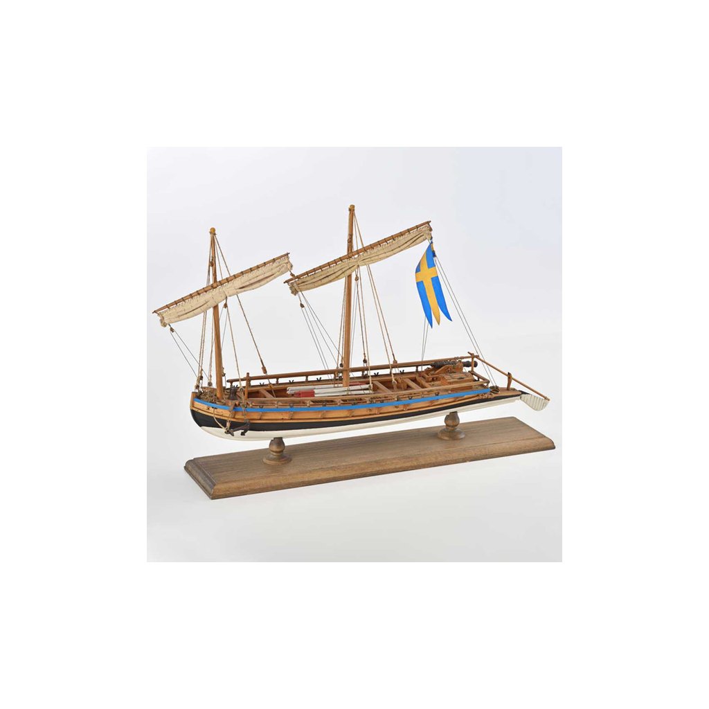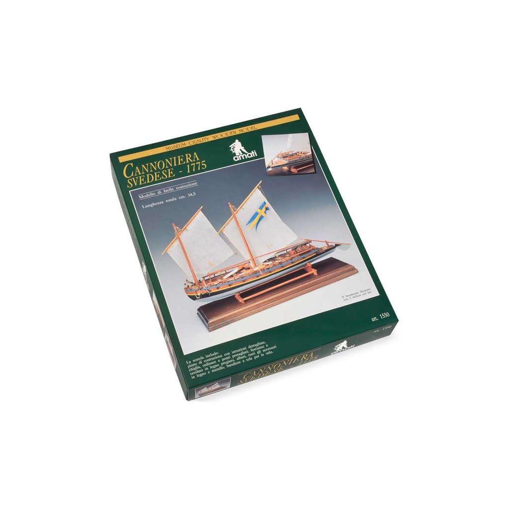 Stavebnice statické makety historické lodi AMATI Švédská válečná loď z roku 1775 v měřítku 1:35, provedení kit. Dělový člun švédské pobřežní stráže má velmi zajímavou stavbu. Dřevěné díly jako kýl a obšívka jsou řezány laserem, obsaženy jsou plachty, lanoví, doplňky.