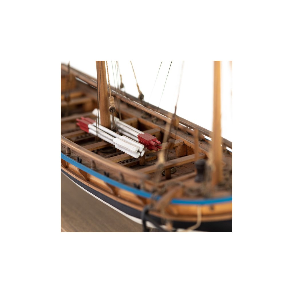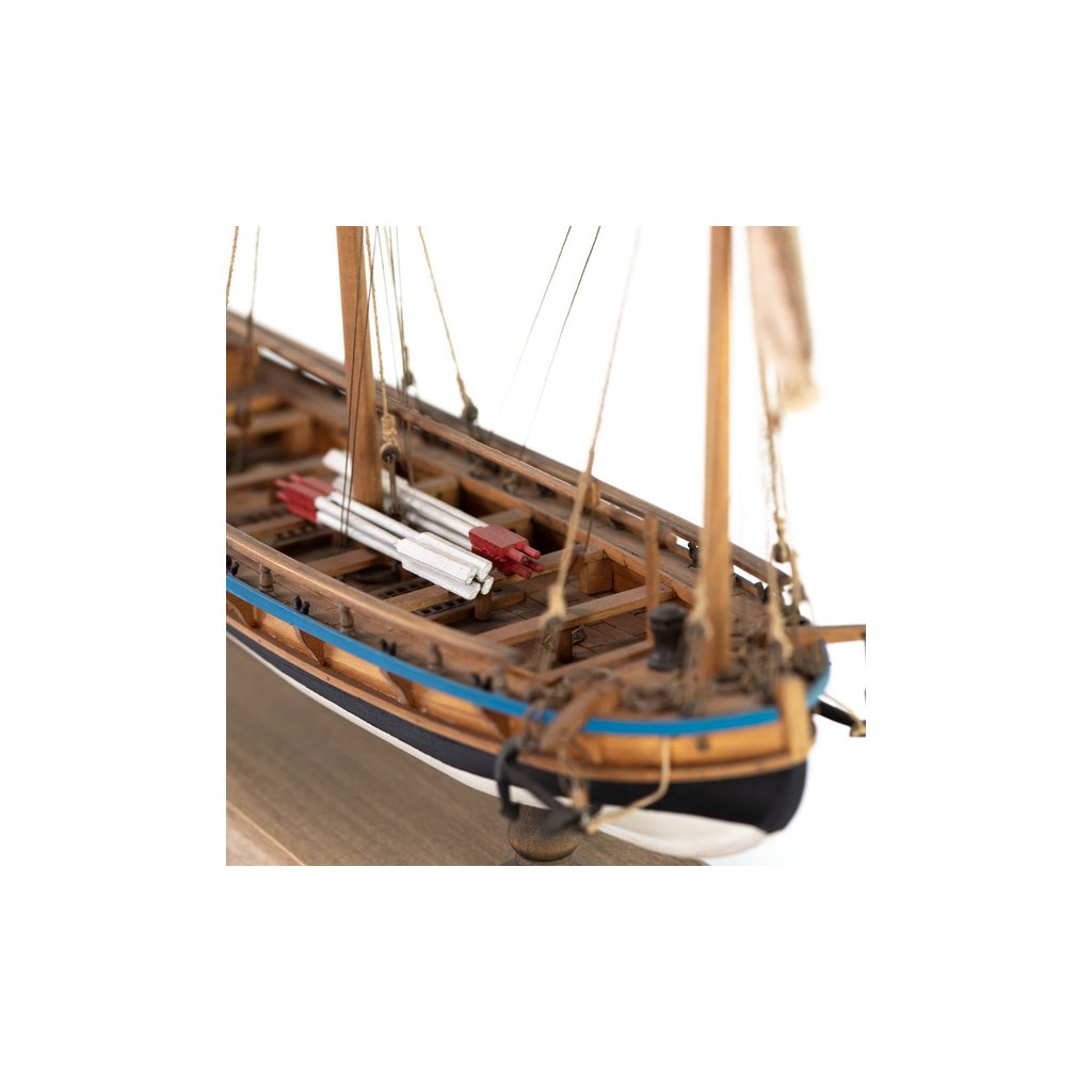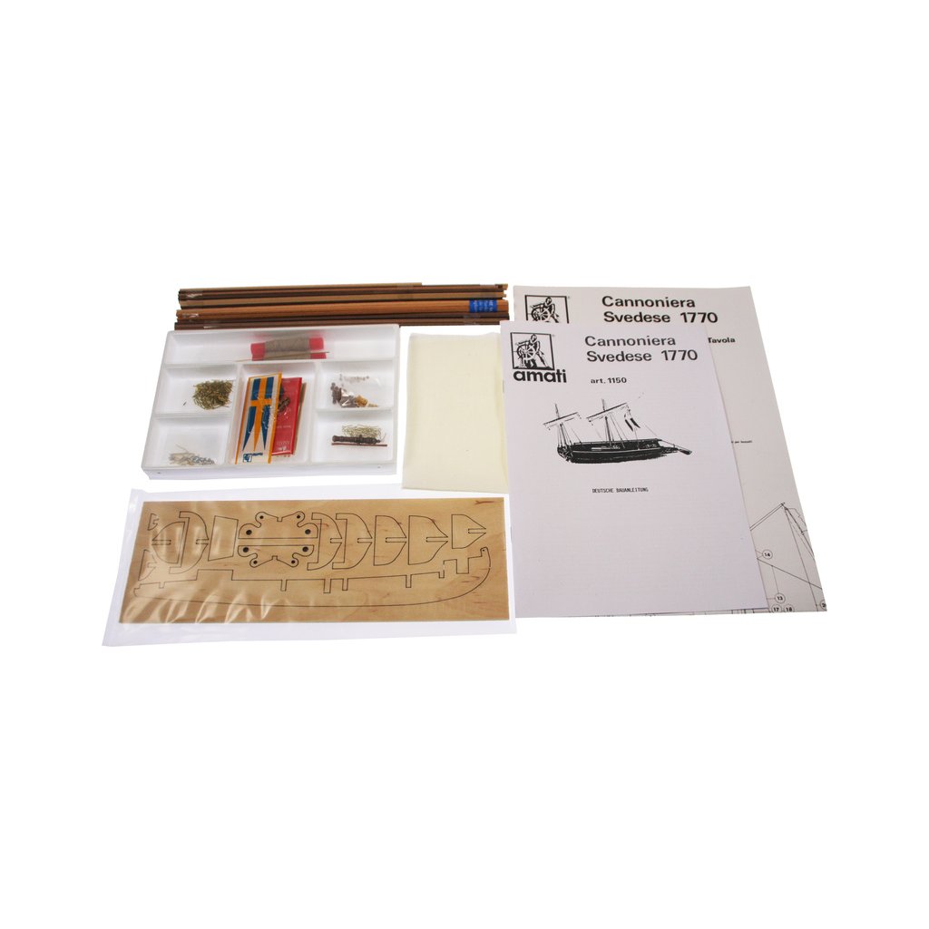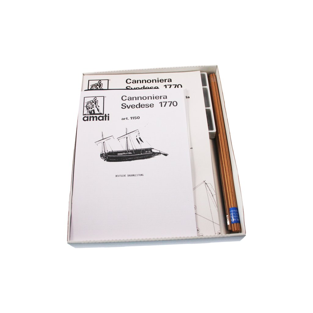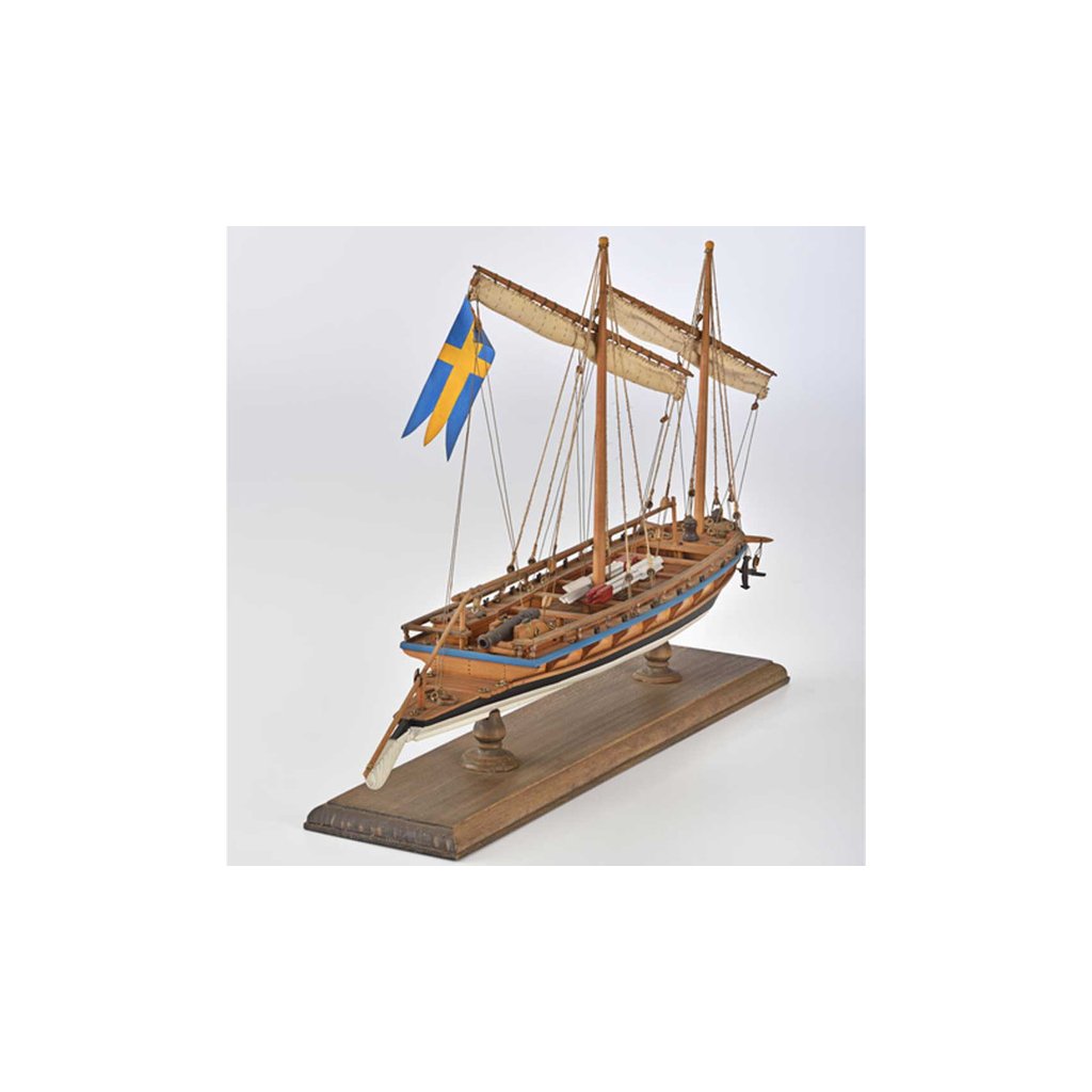Stavebnice statické makety historické lodi AMATI Švédská válečná loď z roku 1775 v měřítku 1:35, provedení kit. Dělový člun švédské pobřežní stráže má velmi zajímavou stavbu. Dřevěné díly jako kýl a obšívka jsou řezány laserem, obsaženy jsou plachty, lanoví, doplňky.