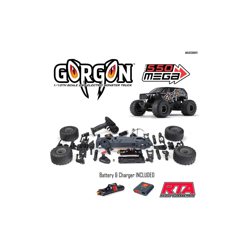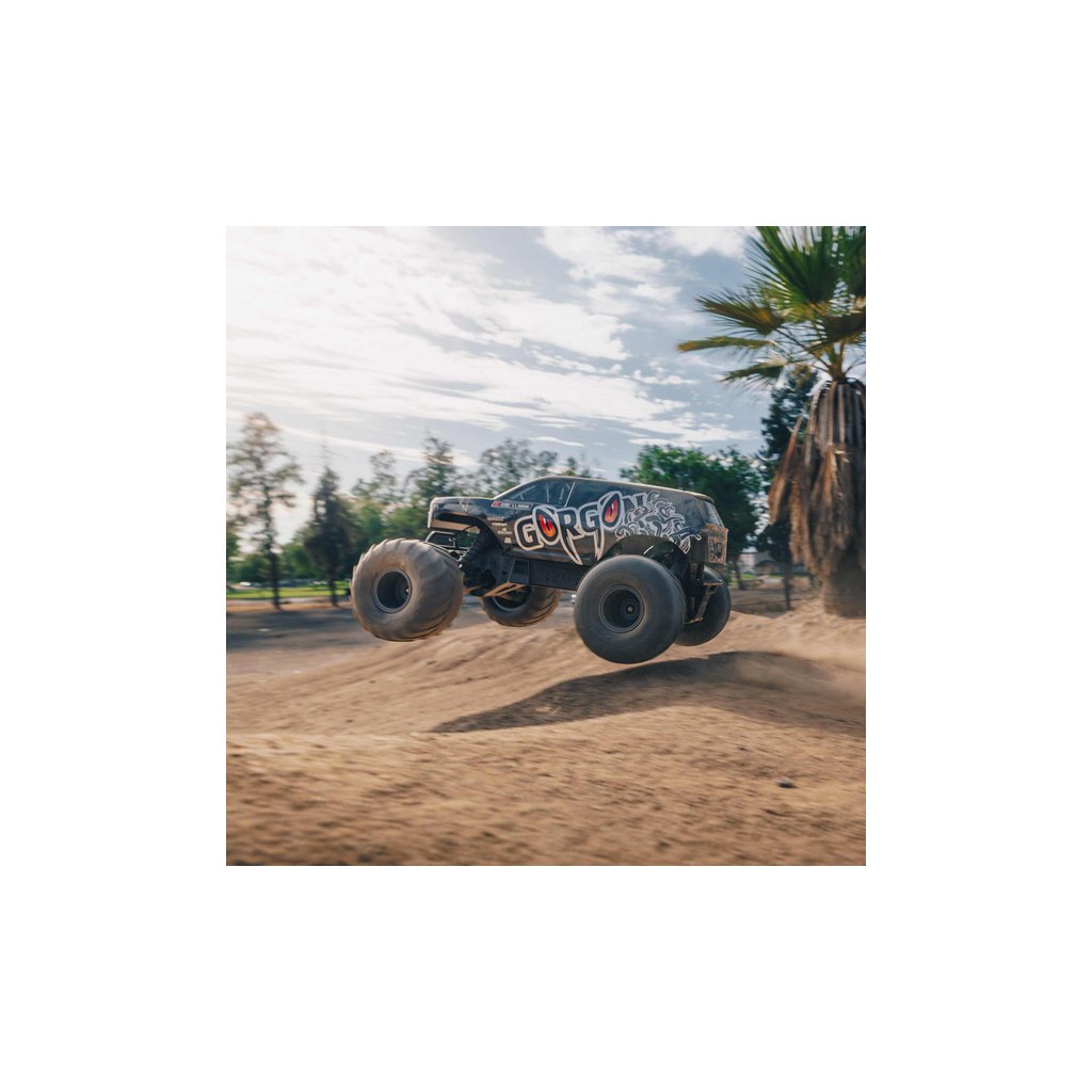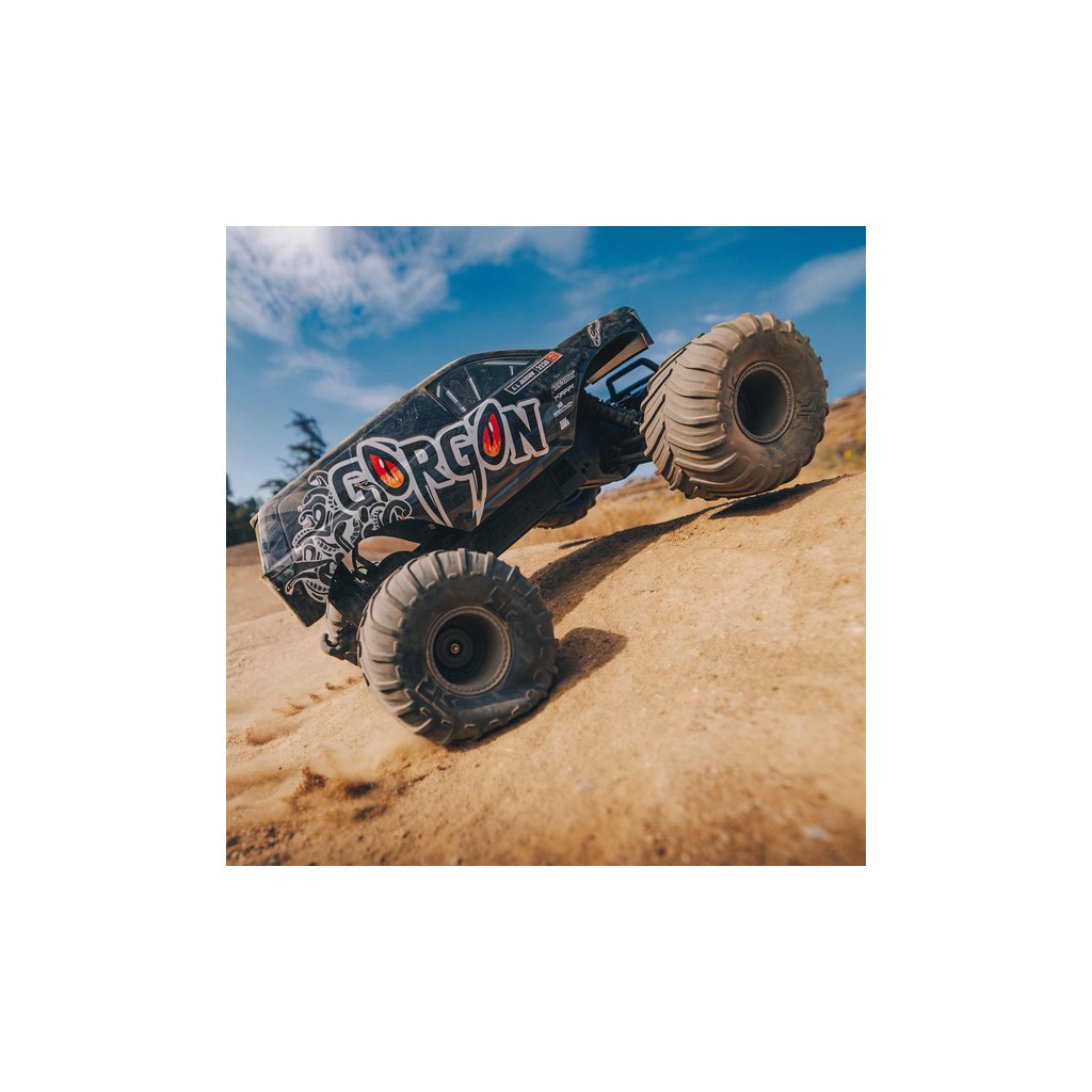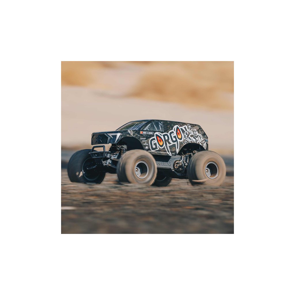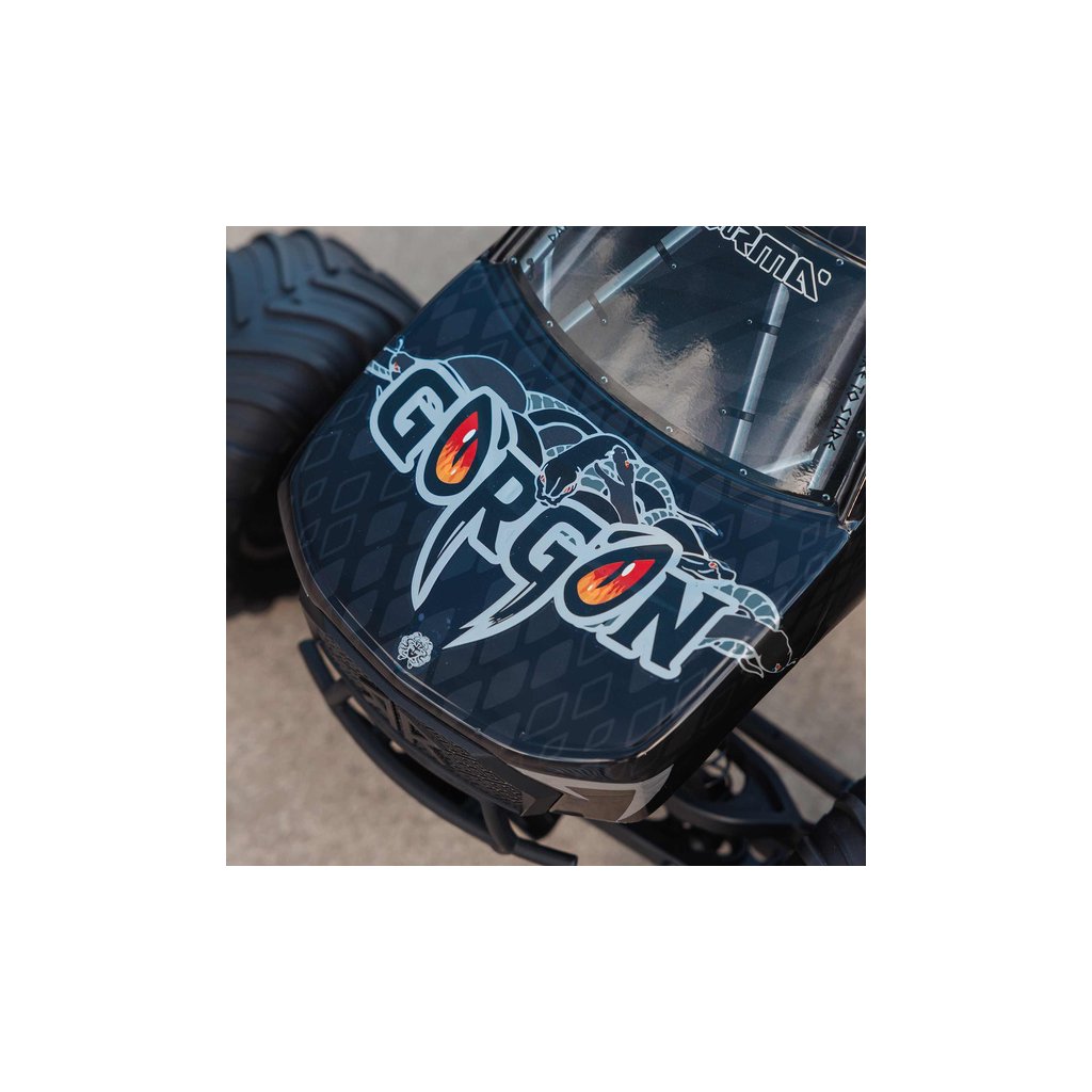 Ihned po vybalení přitáhne Gorgon vaši pozornost, díky originálnímu vzhledu. Velmi atraktivní moderní styl má barevně sladěny jednotlivé díly, jako jsou pružiny, přihrádka na baterii, kluzné desky a nárazníky. Osvědčená technologie ARRMA má díky kompozitnímu šasi vysokou odolnost. Nezávislé zavěšení, olejové tlumiče a nastavitelná světlá výška zajišťují komfortní jízdu. Pro nezastavitelnou trakci přenáší 2WD převodovka výkon ze stejnosměrného motoru MEGA 550 do masivních pneumatik dBoots ® Chevron o rozměru 130mm, nalepených na nylonových discích 57mm. Použité kovové převody jsou dostatečně odolné i pro případný upgrade na střídavý pohon.
