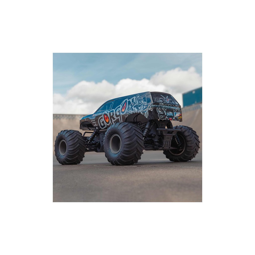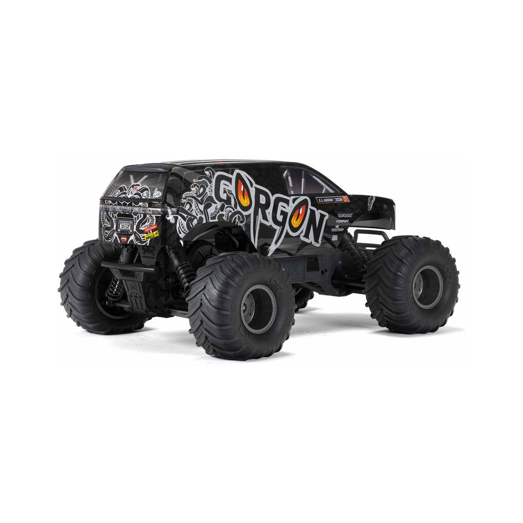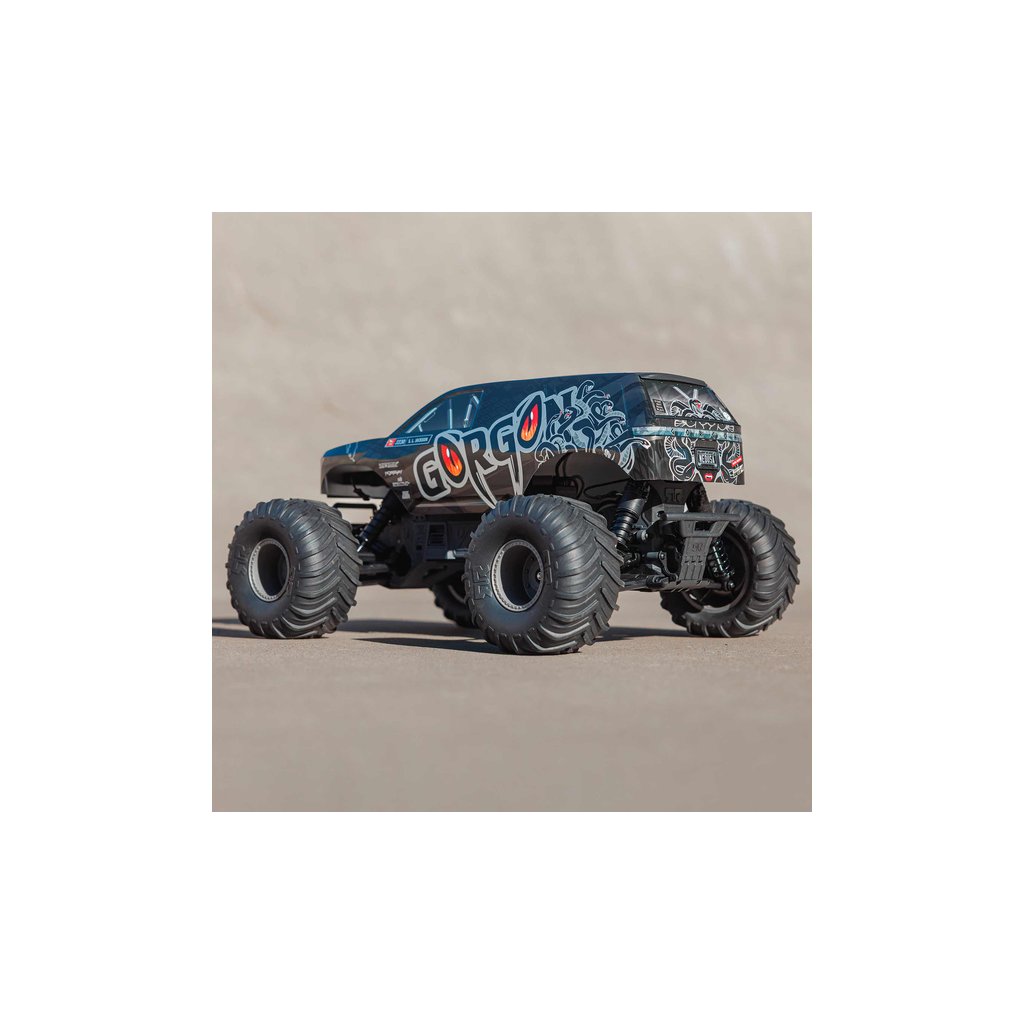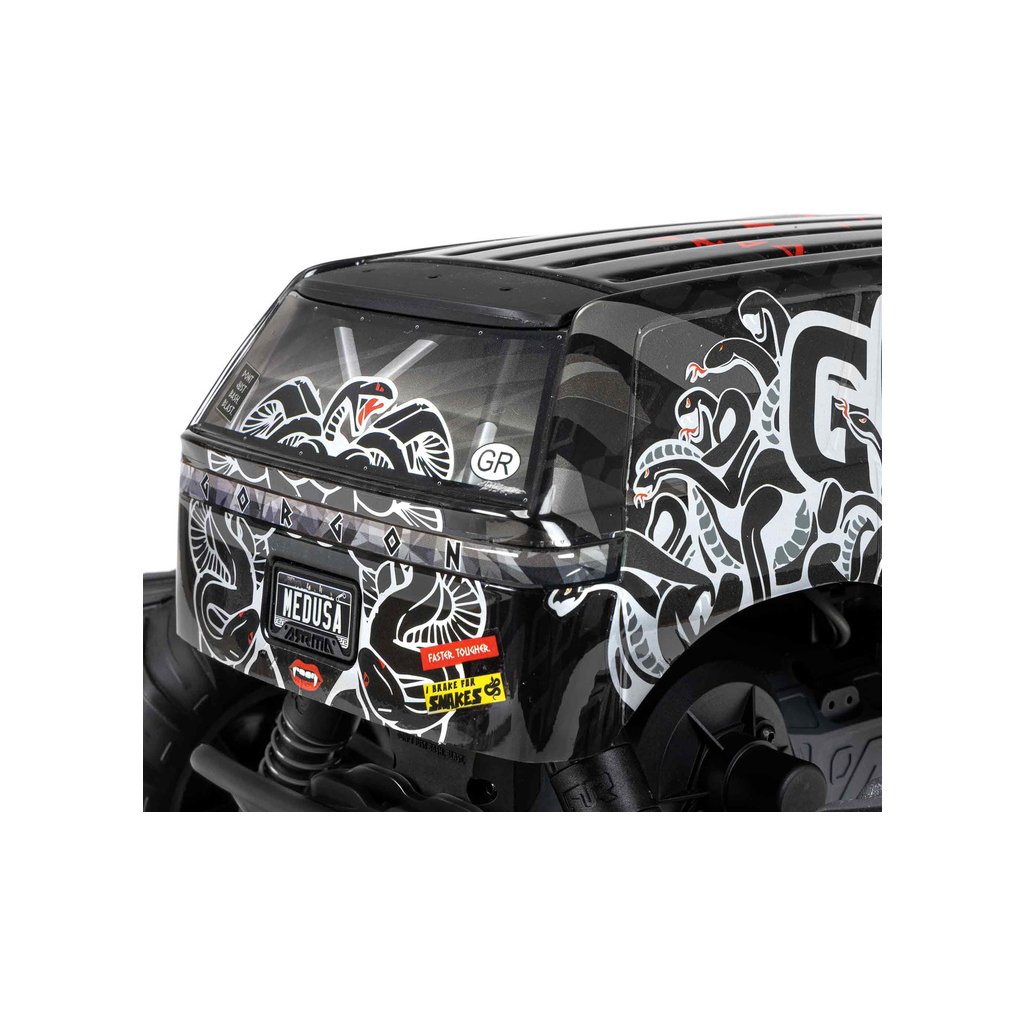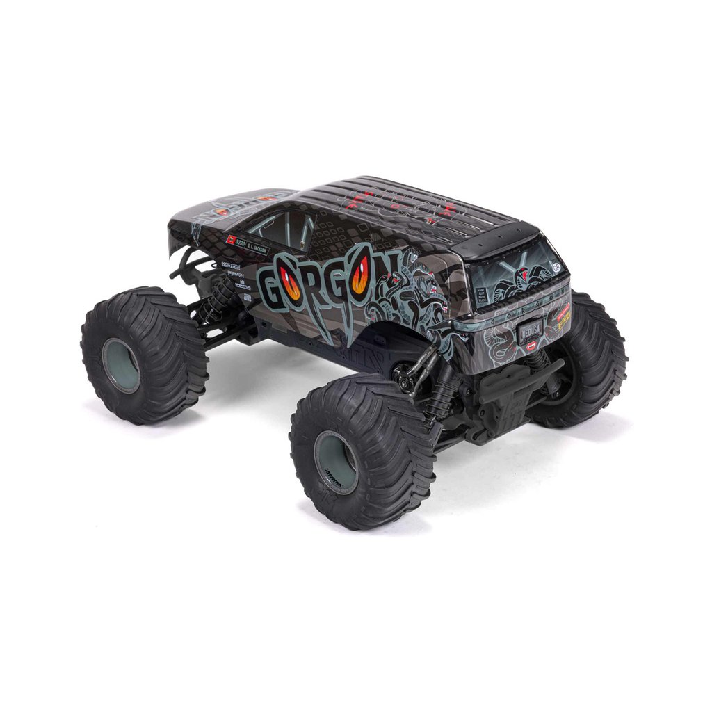Ihned po vybalení přitáhne Gorgon vaši pozornost, díky originálnímu vzhledu. Velmi atraktivní moderní styl má barevně sladěny jednotlivé díly, jako jsou pružiny, přihrádka na baterii, kluzné desky a nárazníky. Osvědčená technologie ARRMA má díky kompozitnímu šasi vysokou odolnost. Nezávislé zavěšení, olejové tlumiče a nastavitelná světlá výška zajišťují komfortní jízdu. Pro nezastavitelnou trakci přenáší 2WD převodovka výkon ze stejnosměrného motoru MEGA 550 do masivních pneumatik dBoots ® Chevron o rozměru 130mm, nalepených na nylonových discích 57mm. Použité kovové převody jsou dostatečně odolné i pro případný upgrade na střídavý pohon.