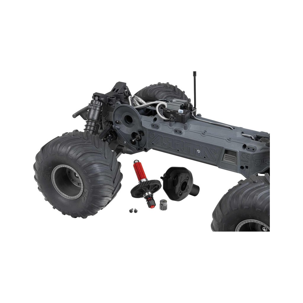 Převodovka modelu ARRMA GORGON MT, zajišťuje přenos výkonu ze stejnosměrného motoru MEGA 550 14T na zadní kola. Převodovka je dostatečně dimenzovaná, aby odolala i střídavému pohonu.