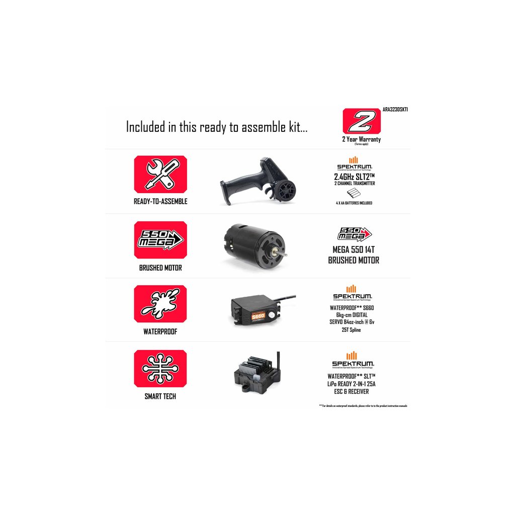 Vysílač Spektrum SLT poskytuje bezpečný provoz bez výpadků a pro začátečníky umožňuje možnost omezení výkonu na 75%, nebo 50%. Pro bezstarostnou jízdu jsou na modelu použity voděodolné* komponenty - regulátor s přijímače Spektrum 2-v-1 25A a servo řízení Spektrum S660 s vysokým točivým momentem.