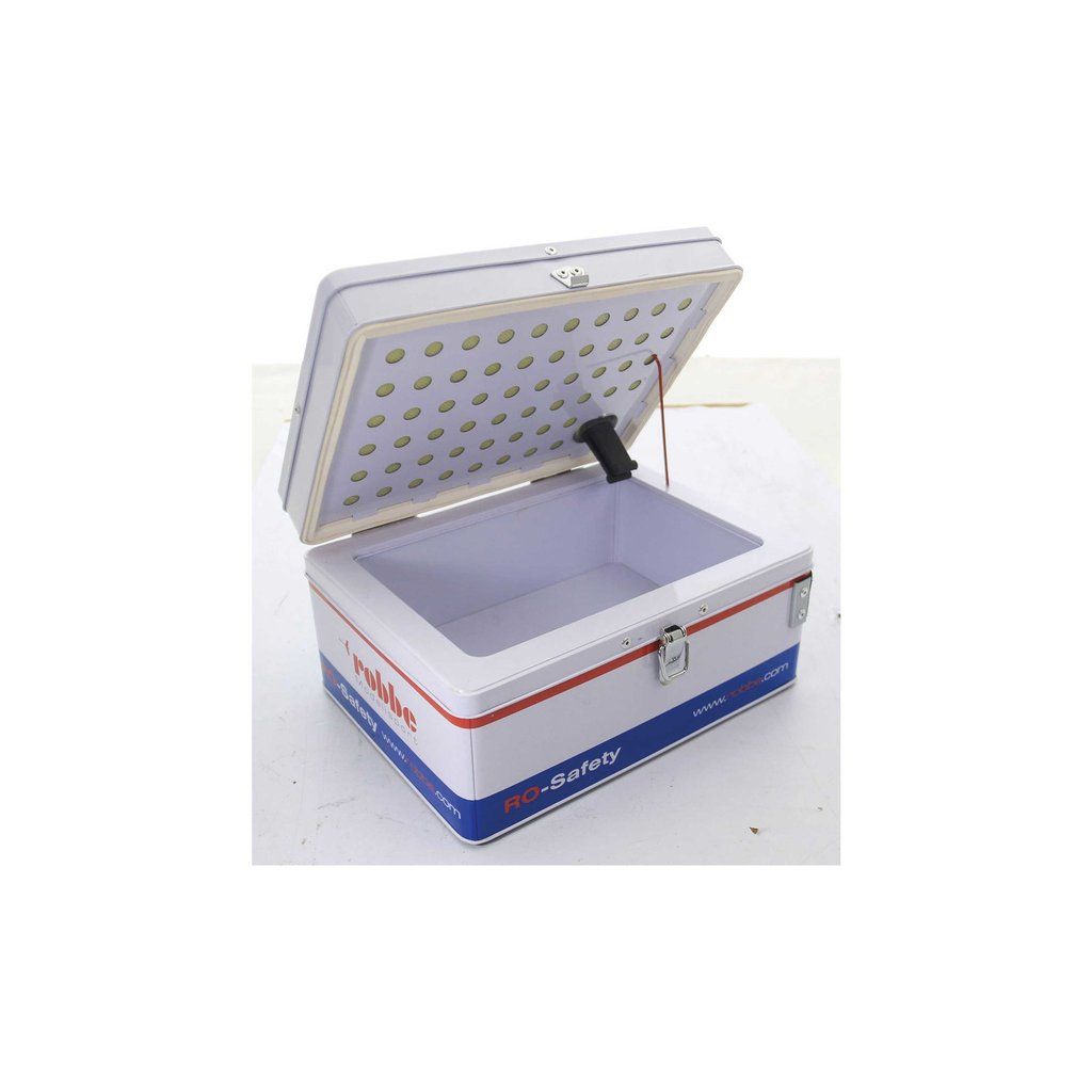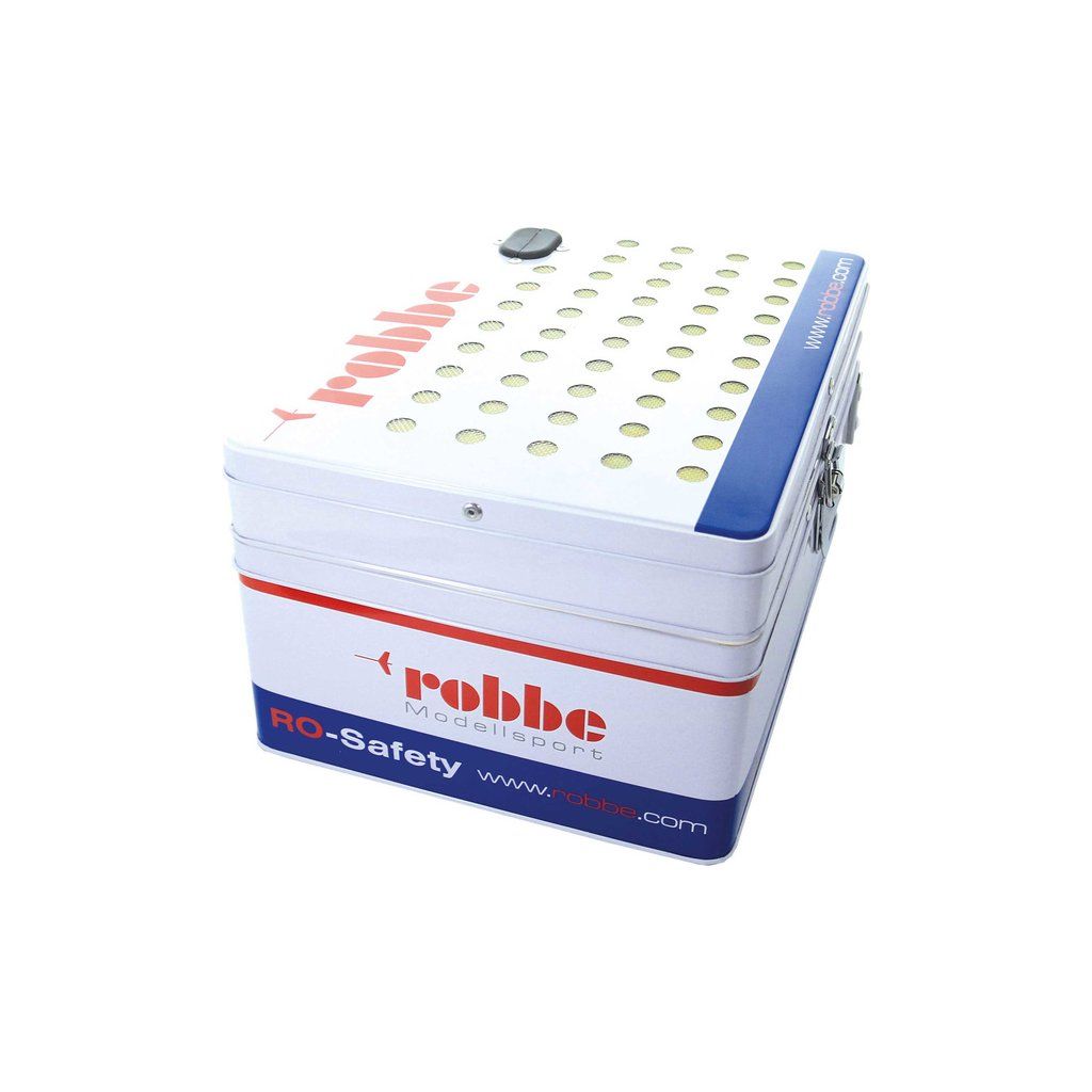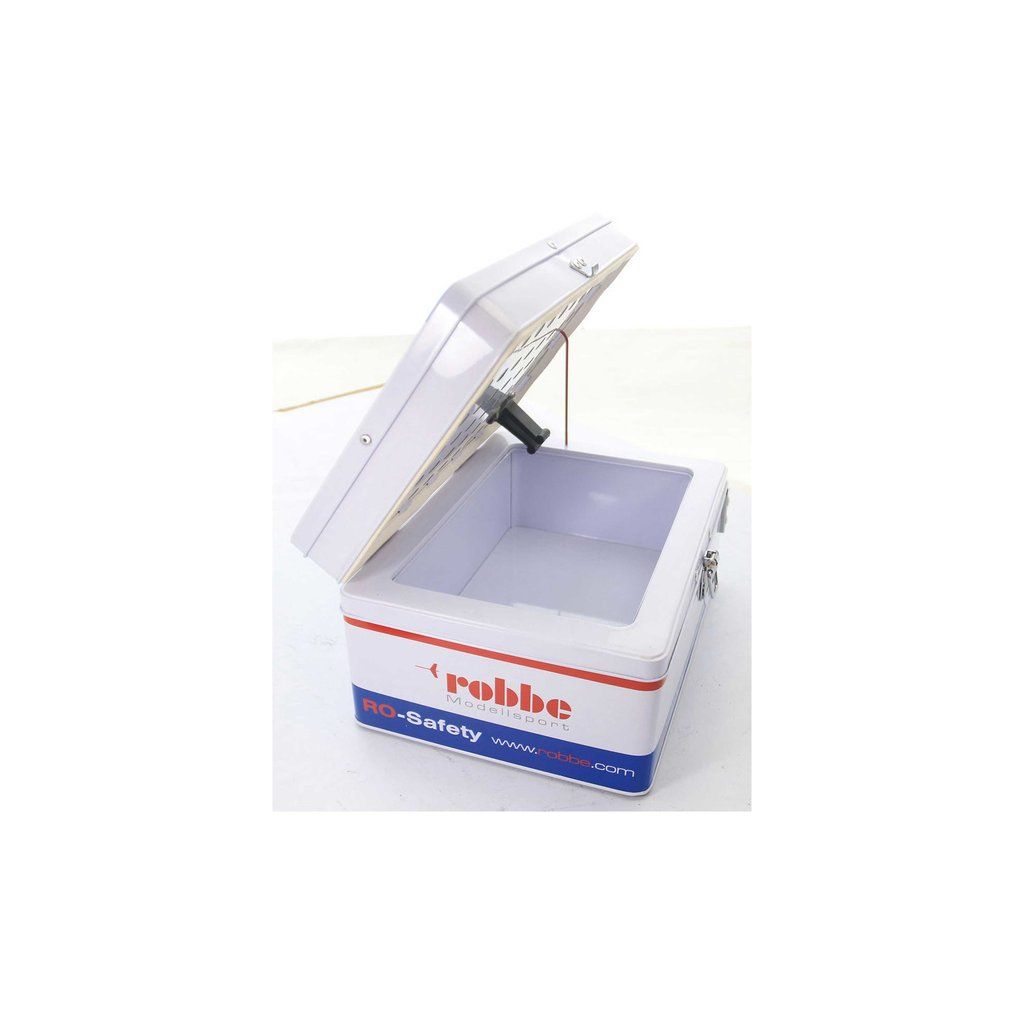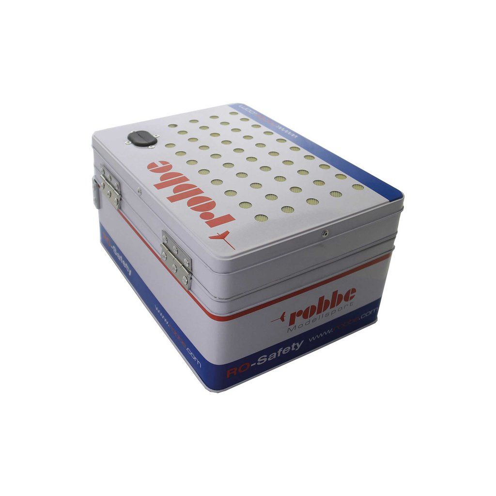 Bezpečnostní kovový kufr je určen k minimalizování rizika spojeného s nabíjením a uskladněním akumulátorů. Bezpečností nehořlavé průchodky umožňují vstup nabíjecích kabelů do kufru. V případě požáru baterií může výsledný tlak uvnitř uniknout ven přes bezpečnostní horní ventilační otvory, zároveň se kouř filtruje, aby se žádné škodlivé látky neuvolňovaly ven. Uvnitř kovového kufru může dojít k požáru s teplotou až 800 °C. Díky speciální izolaci se venkovní podlaha a stěny boxu ohřejí maximálně na 80 °C. Unikající plyn se nezahřeje na více než 150 °C.