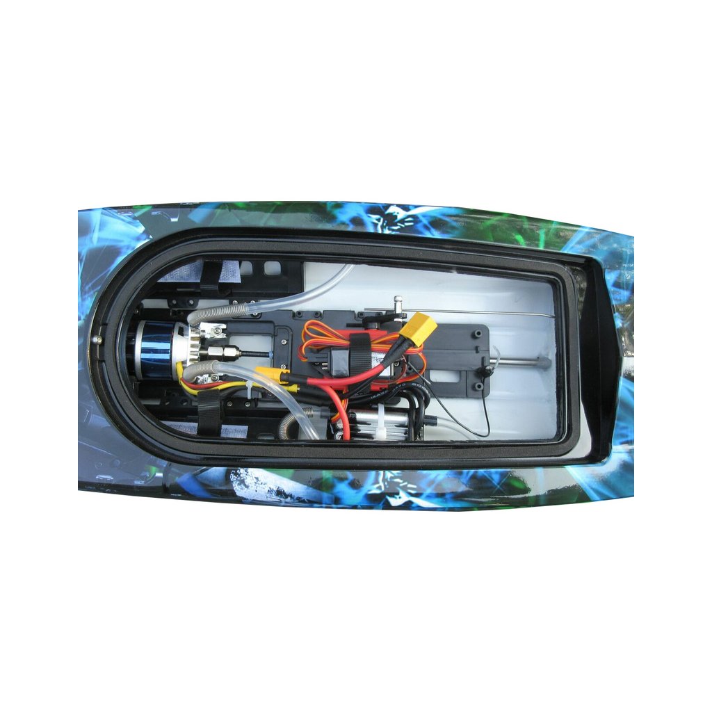 Všechny komponenty elektroniky jsou nainstalovány v trupu lodi. V přední části je motor, na pravé straně baterie a na levé straně je umístěn regulátor. Ve středové části pak přijímač a servo.