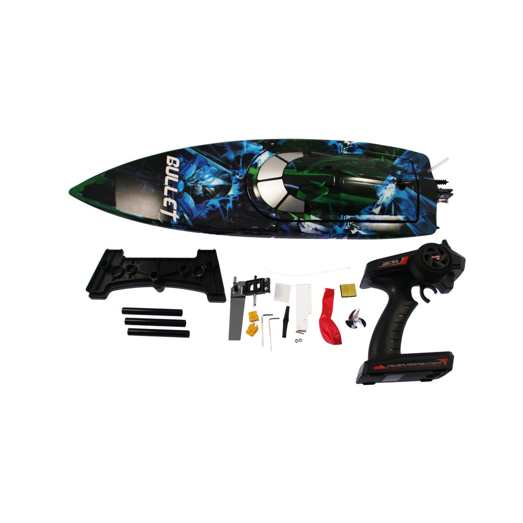 Model je dodáván bez baterie a nabíječe, doporučena je dvojice LiPol baterií 2200 - 3200 mAh 7,4V 35C. Rovněž je třeba doplnit 4 ks alkalické AA baterie do vysílače. V setu je obsažen praktický stojánek a nafukovací balónek jako ochrana přijímače proti vodě. Vysílač je 2 kanálový J2C93 FHSS 2,4GHz, má reverz kanálů, trimy, nastavení velikosti výchylek řízení a plynu. Hotový nabarvený trup má nainstalovaný přijímač J2C91R, servo, regulátor, motor, hřídel motoru a držák kormidla. Sestavit je potřeba pouze lodní šroub a kormidlo. Nutno dokoupit pohonný LiPol akumulátor, nabíječ, 4AA baterie do vysílače.