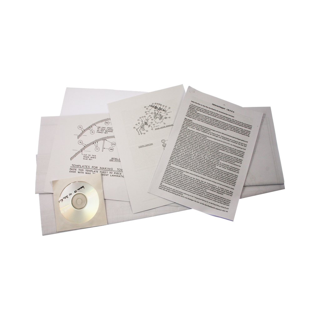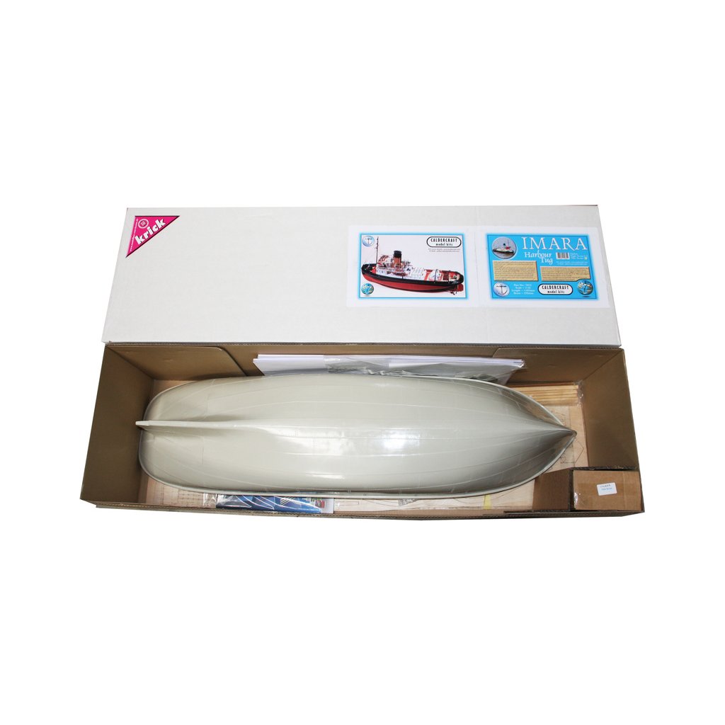 Obsahem balení je stavebnice lodi CALDERCRAFT Imara přístavní remorkér 1:32 kit. Součástí balení je laminátový trup, nástavby a komín, překližkové laserem řezané součásti, spousta kovových odlitků, příslušenství, detailní stavební plán a německý návod ke stavbě.
