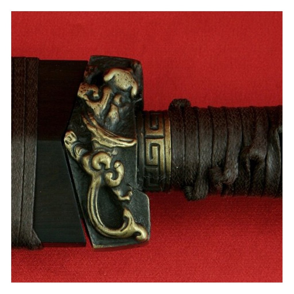 Objevte kouzlo dálnovýchodní historie s autentickou replikou šavle Han Dao. Tento model je vyroben z vysoce kvalitní překládané oceli AISI 1075, která dává čepeli charakteristickou texturu a vysokou odolnost. Design věrně následuje historické předlohy, včetně precizně zpracovaného odlehčovacího žlábku a dekorativní kovové záštity.
