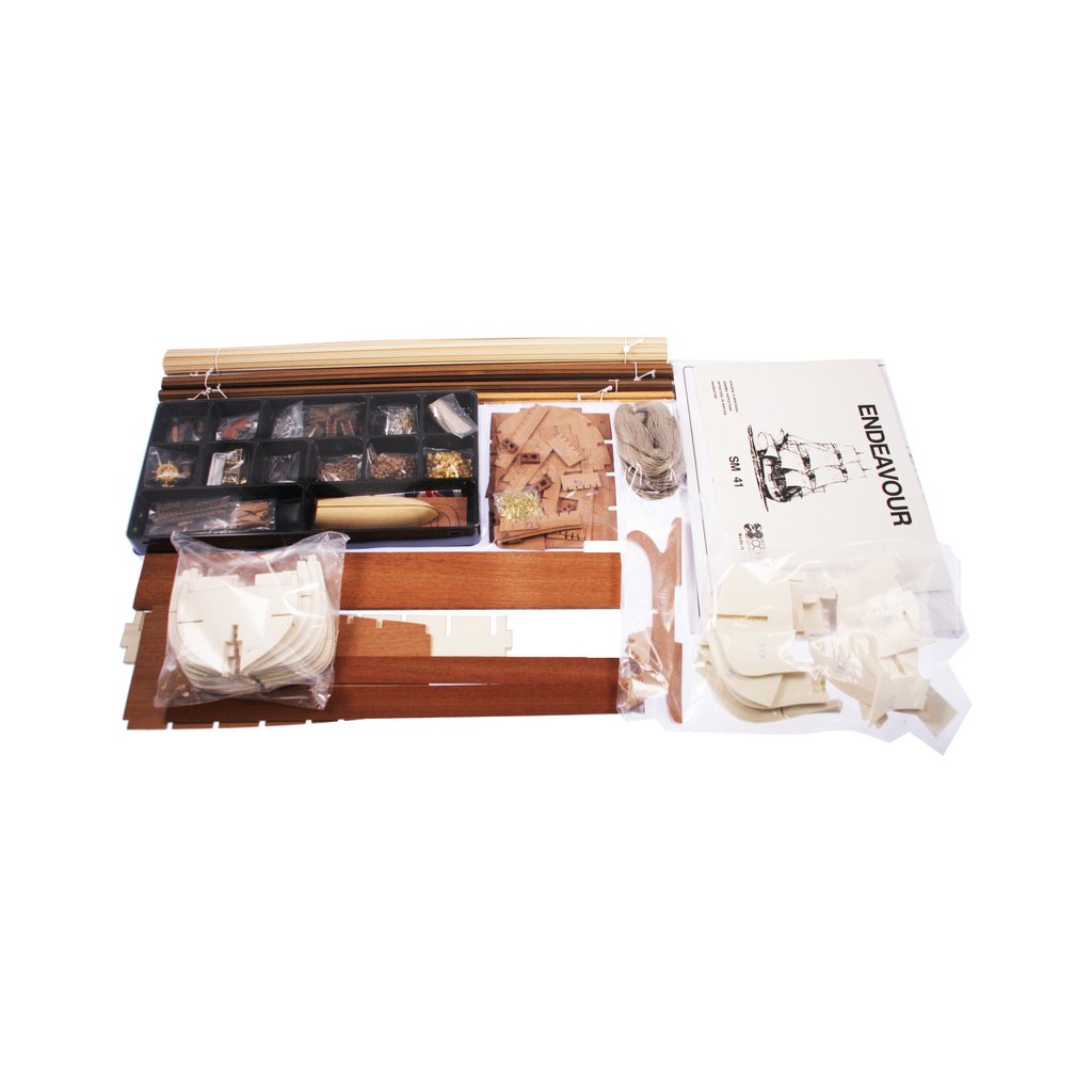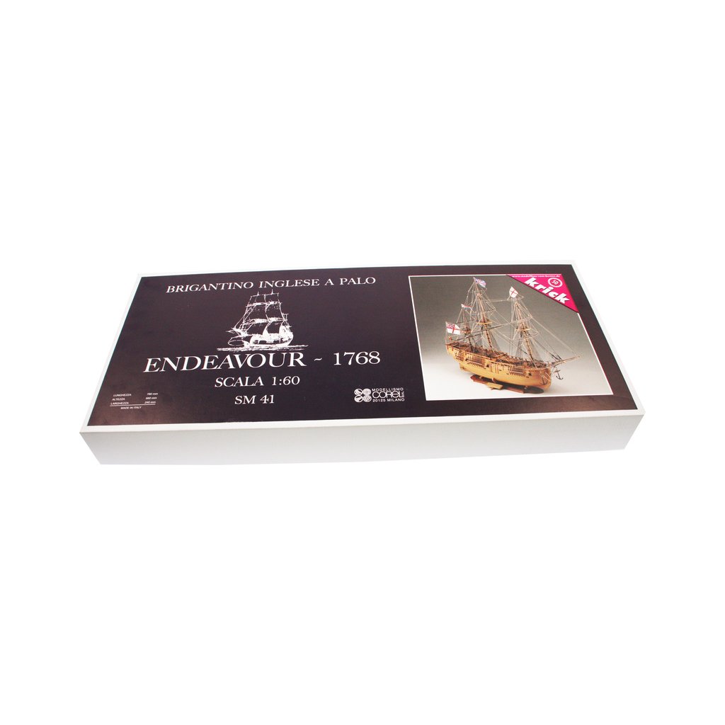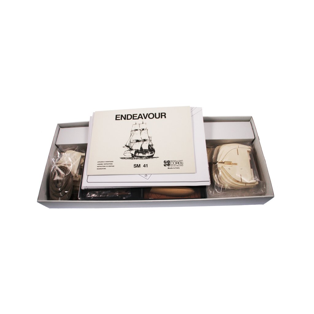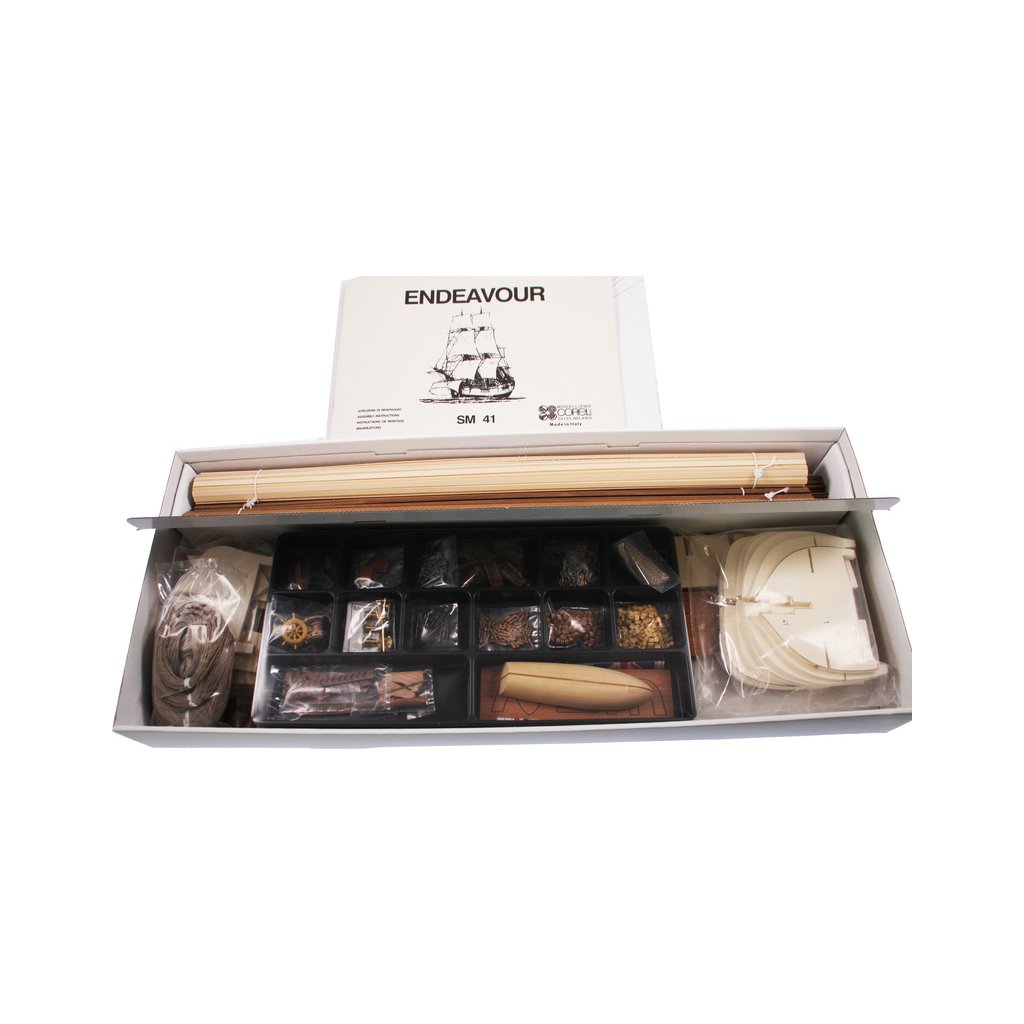 Stavebnice neplovoucího modelu COREL Endeavour v měřítku 1:60 z roku 1768. Loď s kapitánem Cookem v roce 1768 provedla expedici do jižních moří, k pobřeží Austrálie a odvážil se do jižního oceánu. V balení jsou dřevěné díly, lišty a množství kování, příslušenství, plány atd.