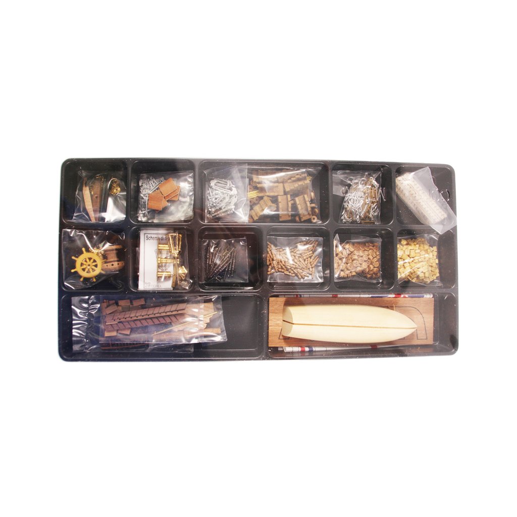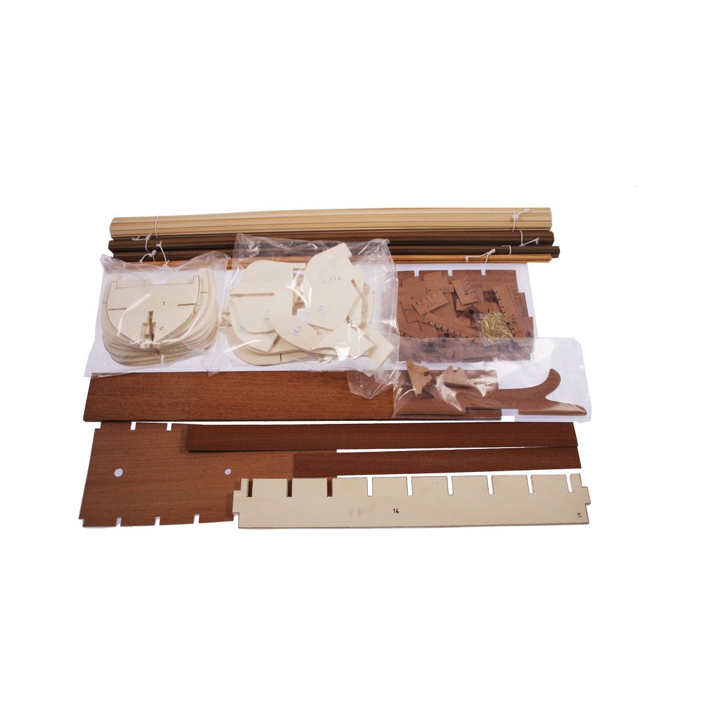 Balení obsahuje sadu překližkových dílů, sadu dřevěných lišt o různém průřezu, blistr s drobnými díly, díly z mosazi, sadu výkresů a vícejazyčný manuál.