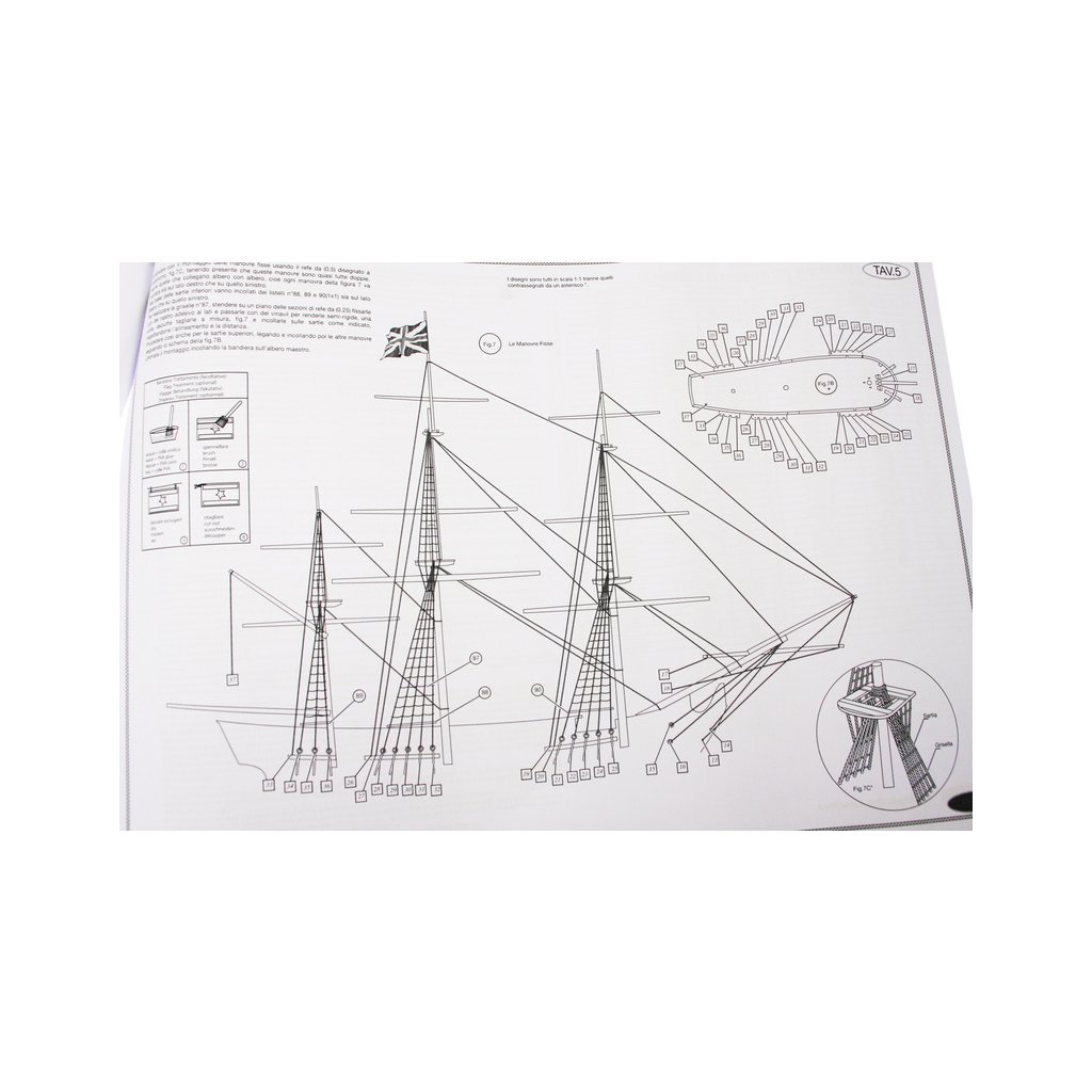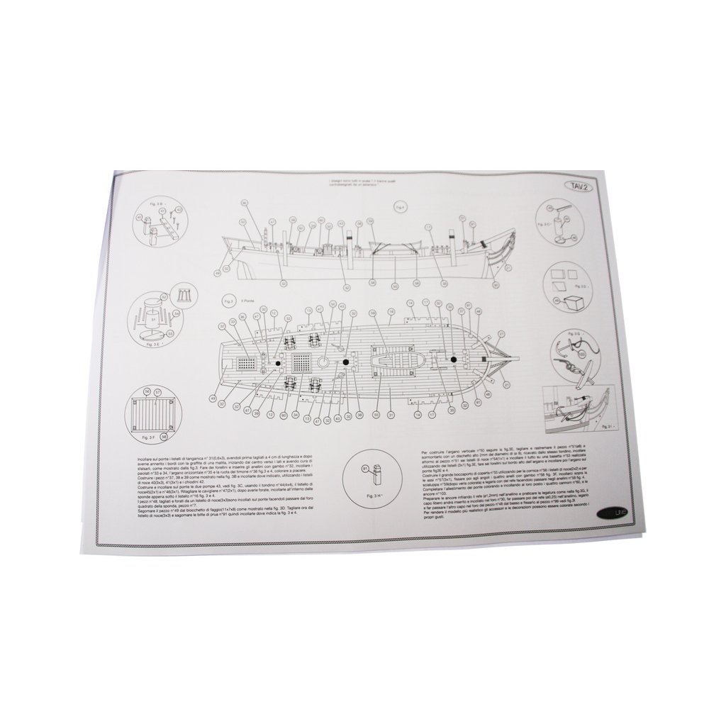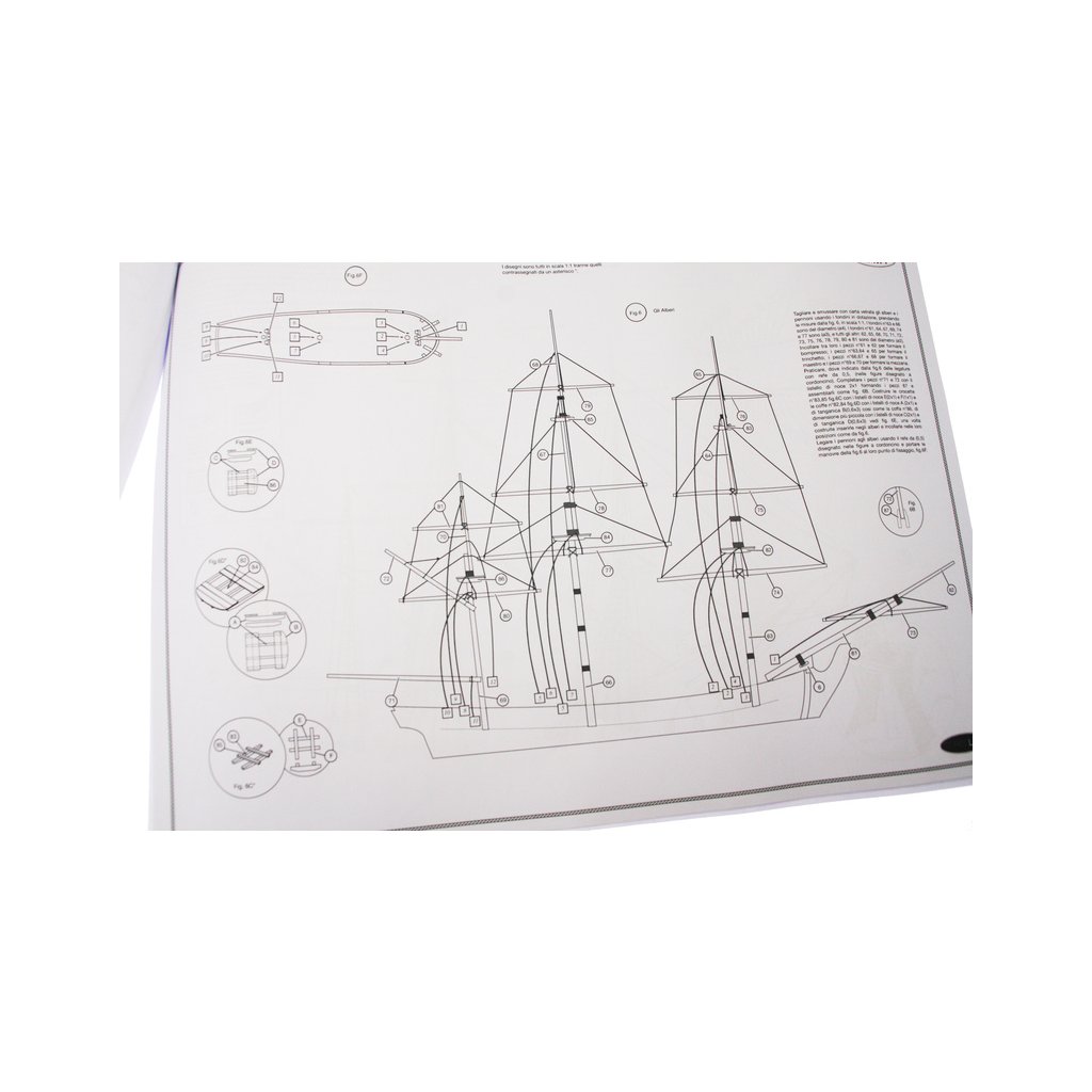 Set obsahuje kompletní sadu výkresové dokumentace modelu v měřítku 1:1 s obrázky jednotlivých detailů. Na výkrese jsou v měřítku nakresleny montážní sestavy, jejich kompletace a to včetně stěžňů a ráhen a způsob vázání lanoví. Vícejazyčný postup stavby rámcově upravuje logické sestavení jednotlivých komponentů.