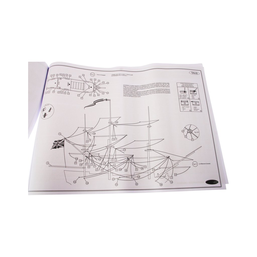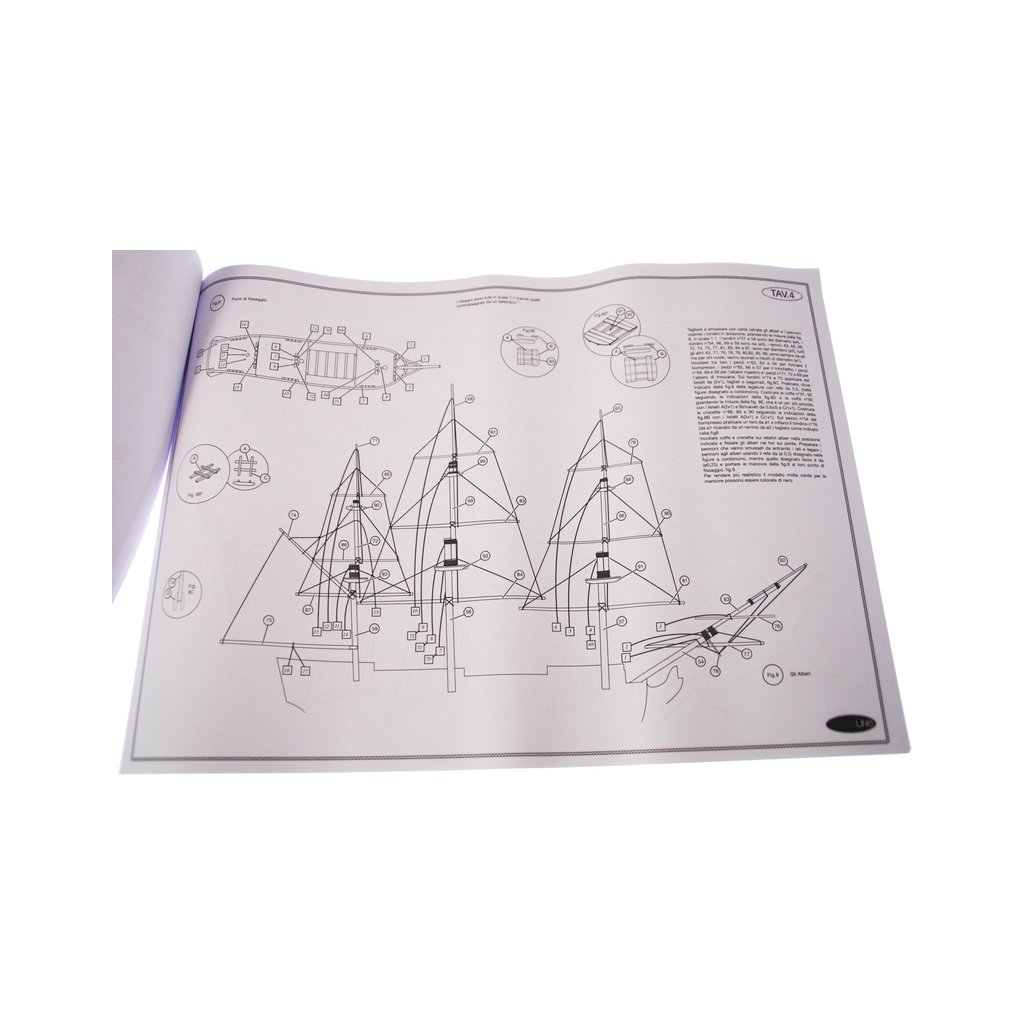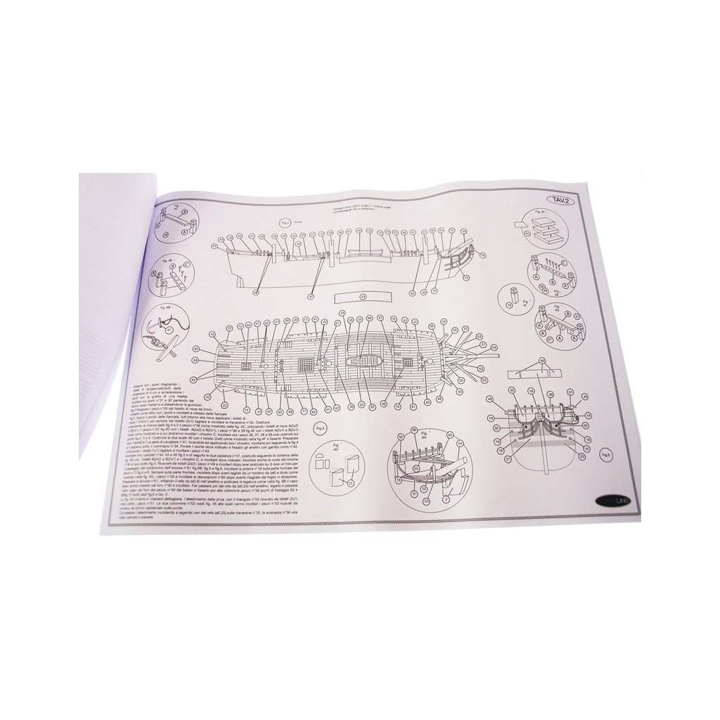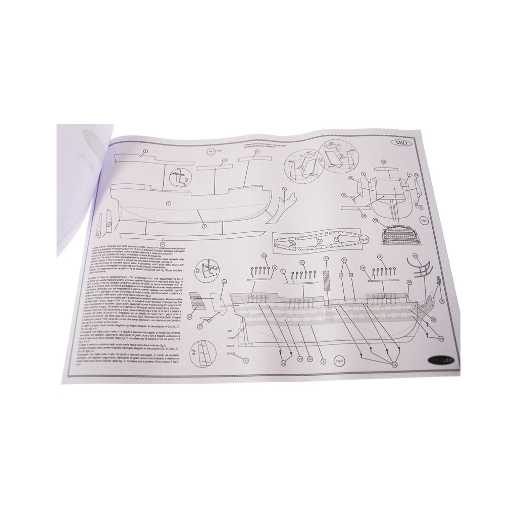 Balení obsahuje sadu překližkových dílů, sadu dřevěných lišt o různém průřezu, blistr s drobnými díly, sadu výkresů a manuál anglický, německý, francouzský a italský.