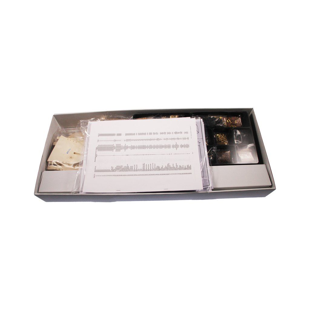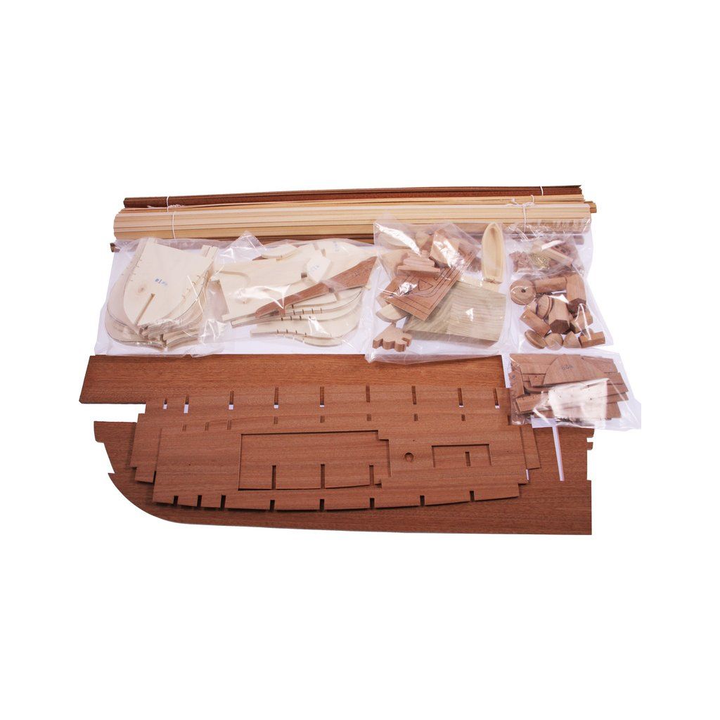 Balení obsahuje sadu překližkových dílů, sadu dřevěných lišt o různém průřezu, blistr s drobnými díly, díly z mosazi, sadu výkresů a vícejazyčný manuál.