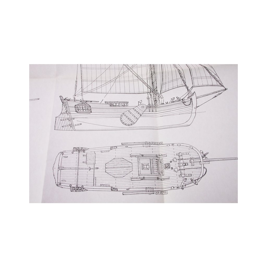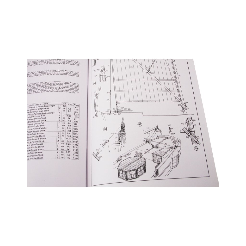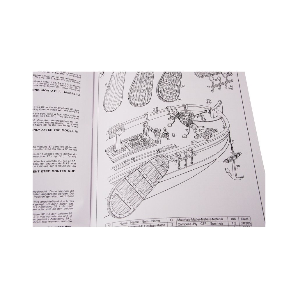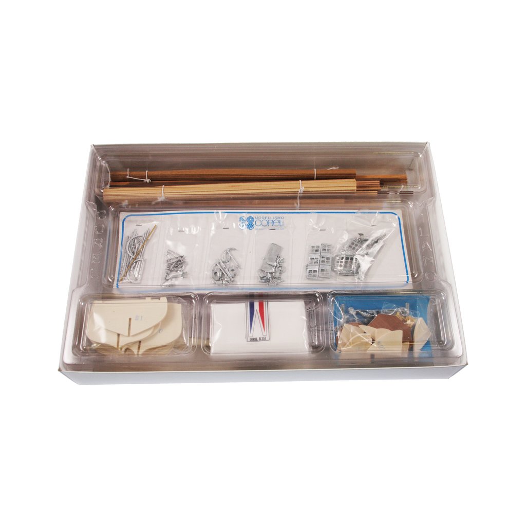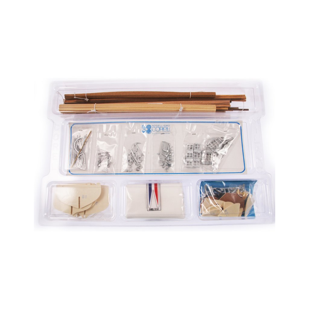 Balení obsahuje sadu překližkových dílů, sadu dřevěných lišt o různém průřezu, blistr s drobnými díly, díly z mosazi, sadu výkresů a vícejazyčný manuál.