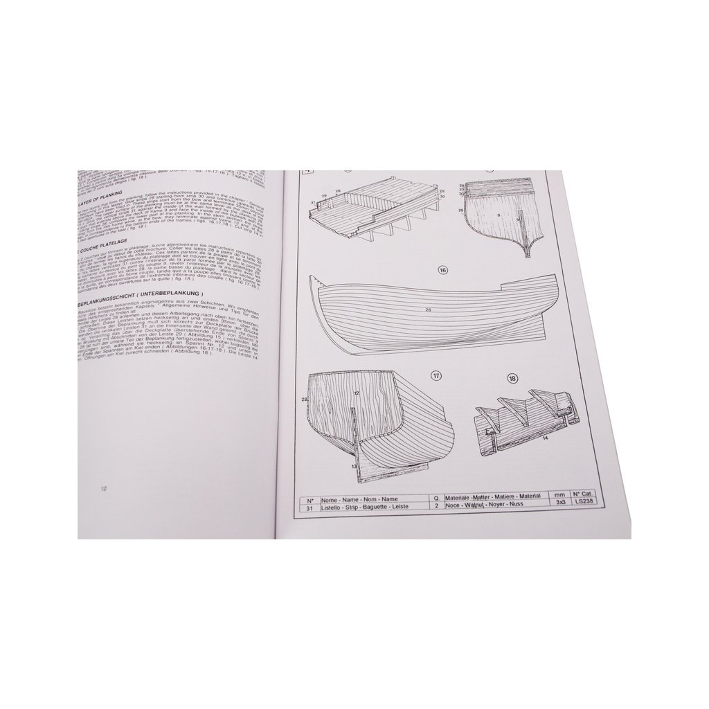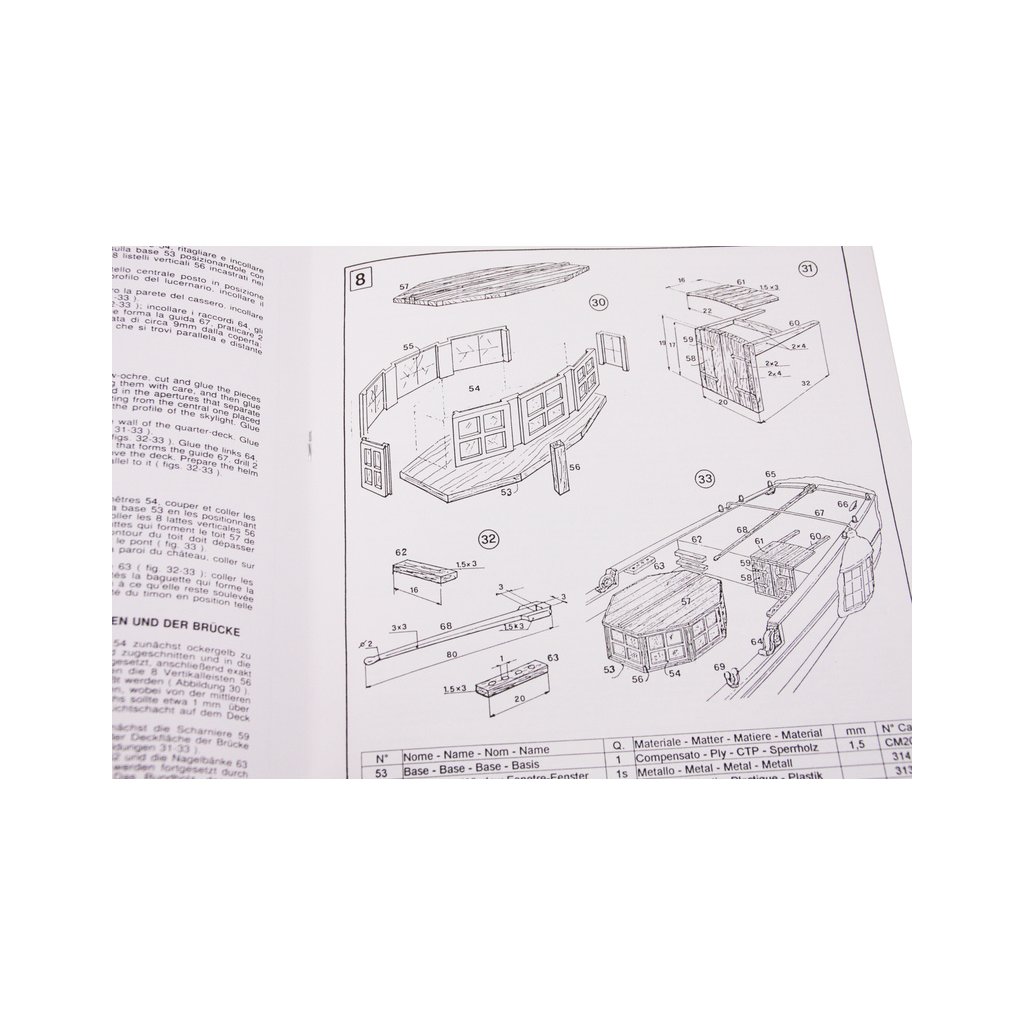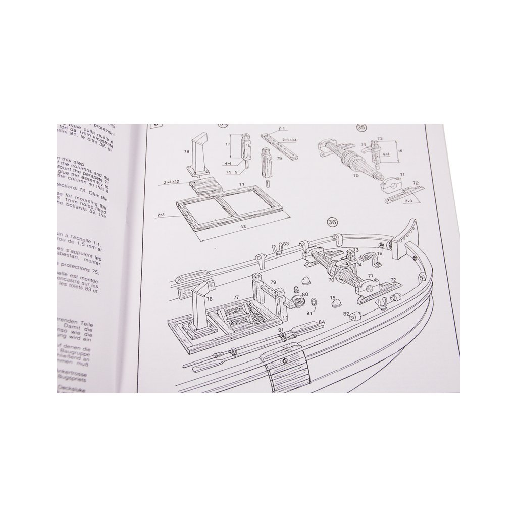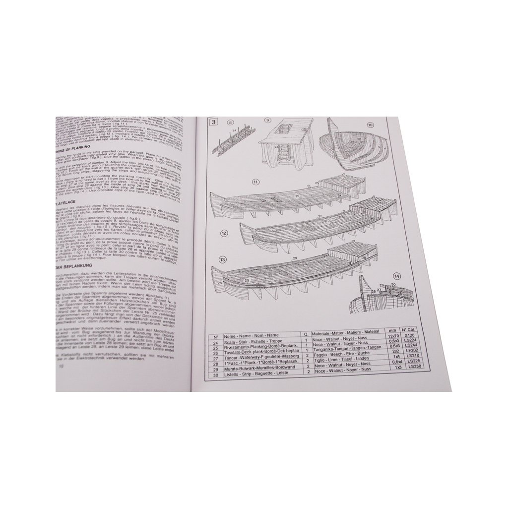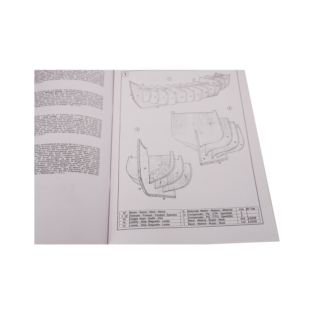 Balení obsahuje sadu překližkových dílů, sadu dřevěných lišt o různém průřezu, blistr s drobnými díly, díly z mosazi, sadu výkresů a vícejazyčný manuál.