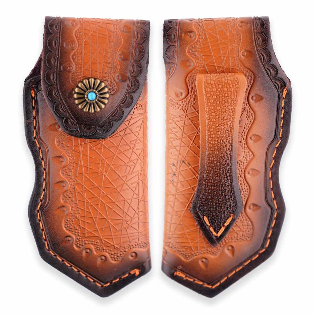 Nůž je vybaven otvorem v čepeli pro snadné otevírání jednou rukou a pojistkou typu liner lock, která bezpečně fixuje čepel v otevřené poloze. Součástí je také kvalitní kožené pouzdro s bohatým zdobením, vhodné pro nošení na opasku.