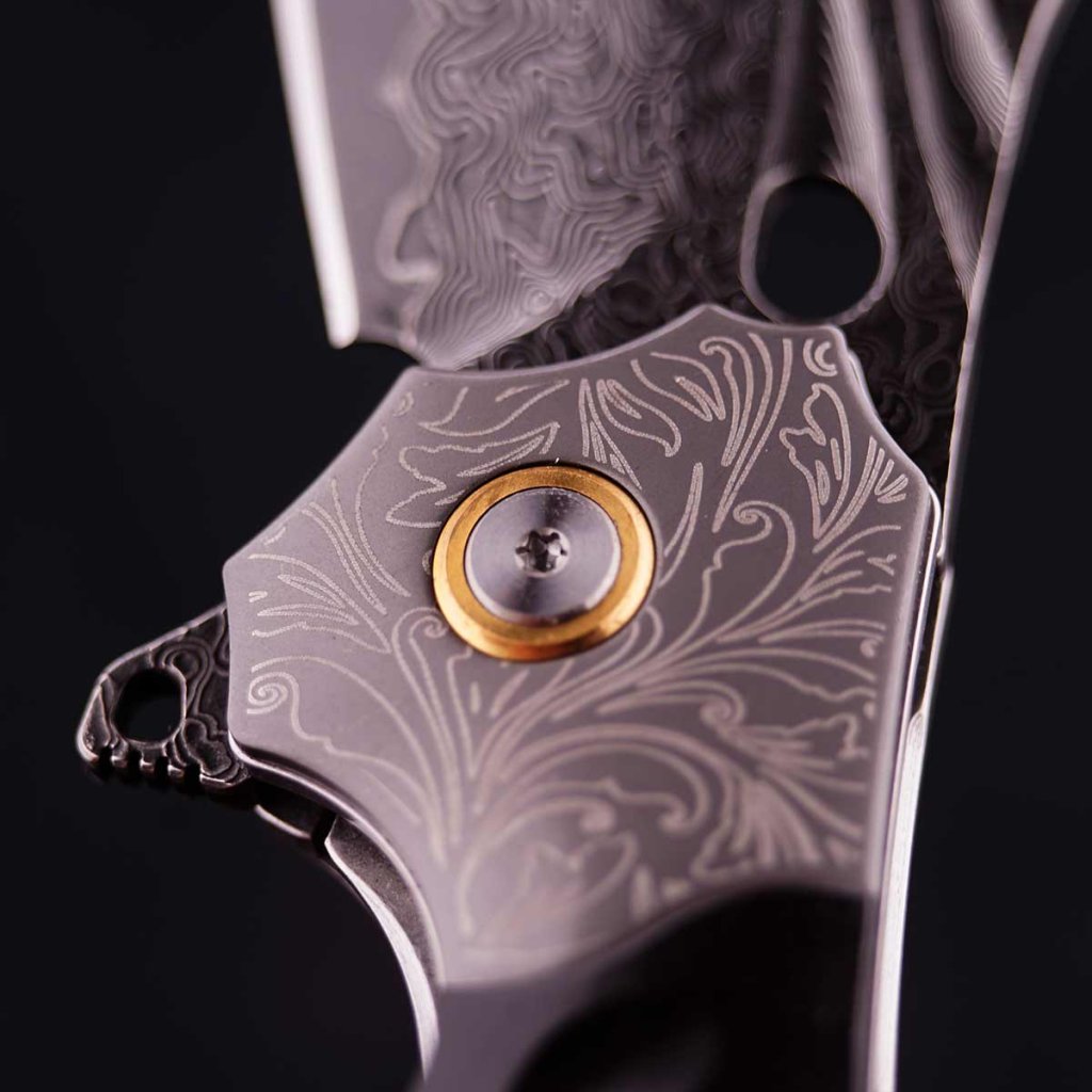 Rukojeť je osazena střenkami z odolného ebenového dřeva s plastickým 3D vzorem, který zajišťuje jistý úchop i v náročnějších podmínkách. Kovová část rukojeti je jemně zdobená gravírováním, což dodává noži elegantní kontrast k jeho drsnému charakteru. Pevná konstrukce a ergonomický tvar dělají z nože spolehlivý nástroj pro každodenní nošení.