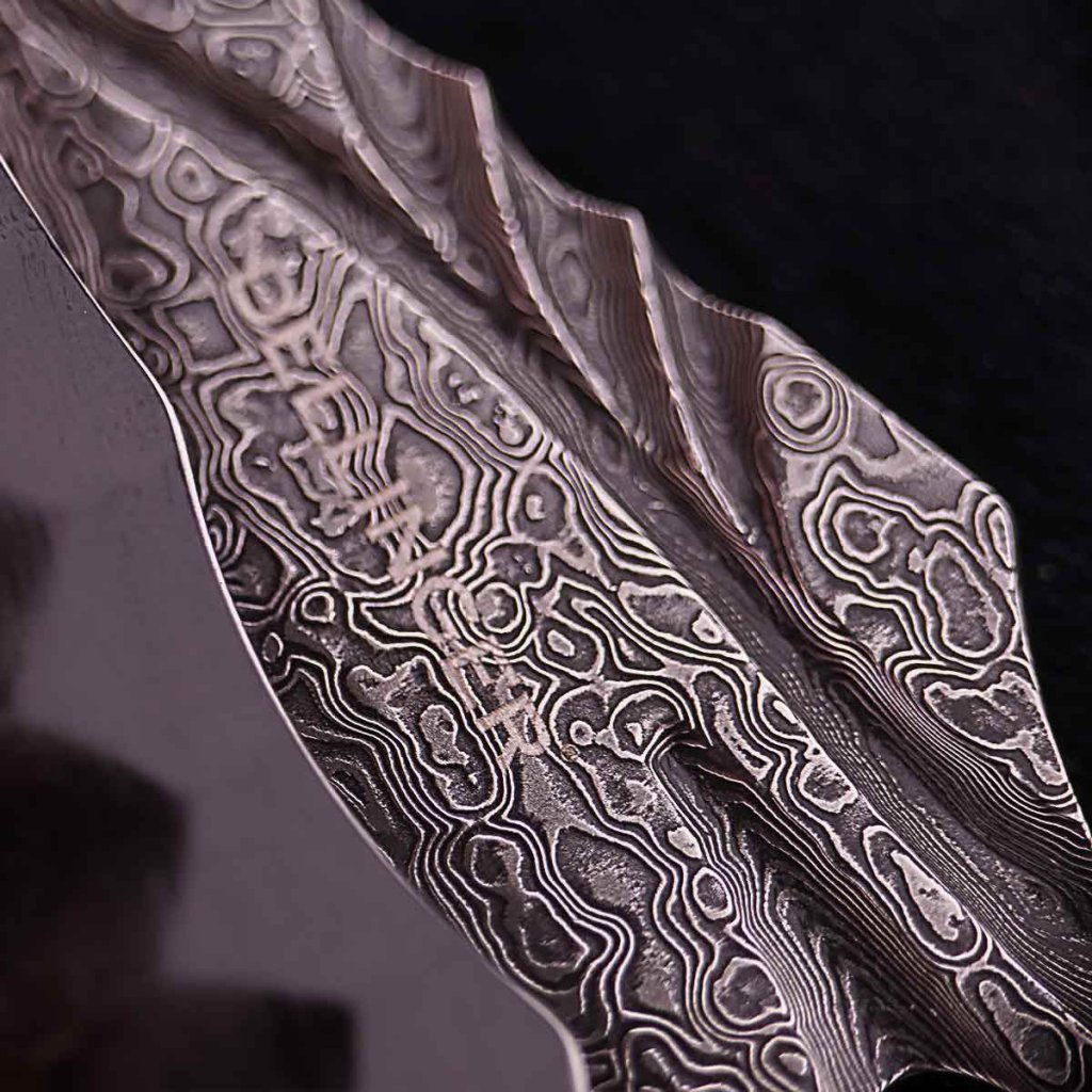 Zavírací nůž Dellinger Damascus Hakke je výrazný EDC nůž, který kombinuje masivní vzhled, precizní zpracování a praktickou funkčnost. Čepel z damaškové oceli zaujme nejen kresbou, ale i agresivní siluetou, která dává noži sebevědomý charakter a výborné řezné vlastnosti. Čepel je vyrobena z damaškové oceli s typickou kresbou. Každý kus je originál – žádné dvě čepele nejsou stejné. Výrazný hřbet s tvarovaným profilem zlepšuje kontrolu při řezu a podtrhuje robustní design nože.