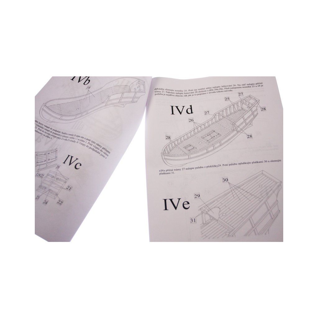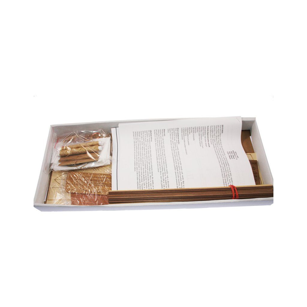Po otevření víka krabice naleznete dřevěné díly modelu z překližky, sadu lišt, drobné součásti uzavřené v plastovém průhledném blistru, sadu výkresů a manuál.