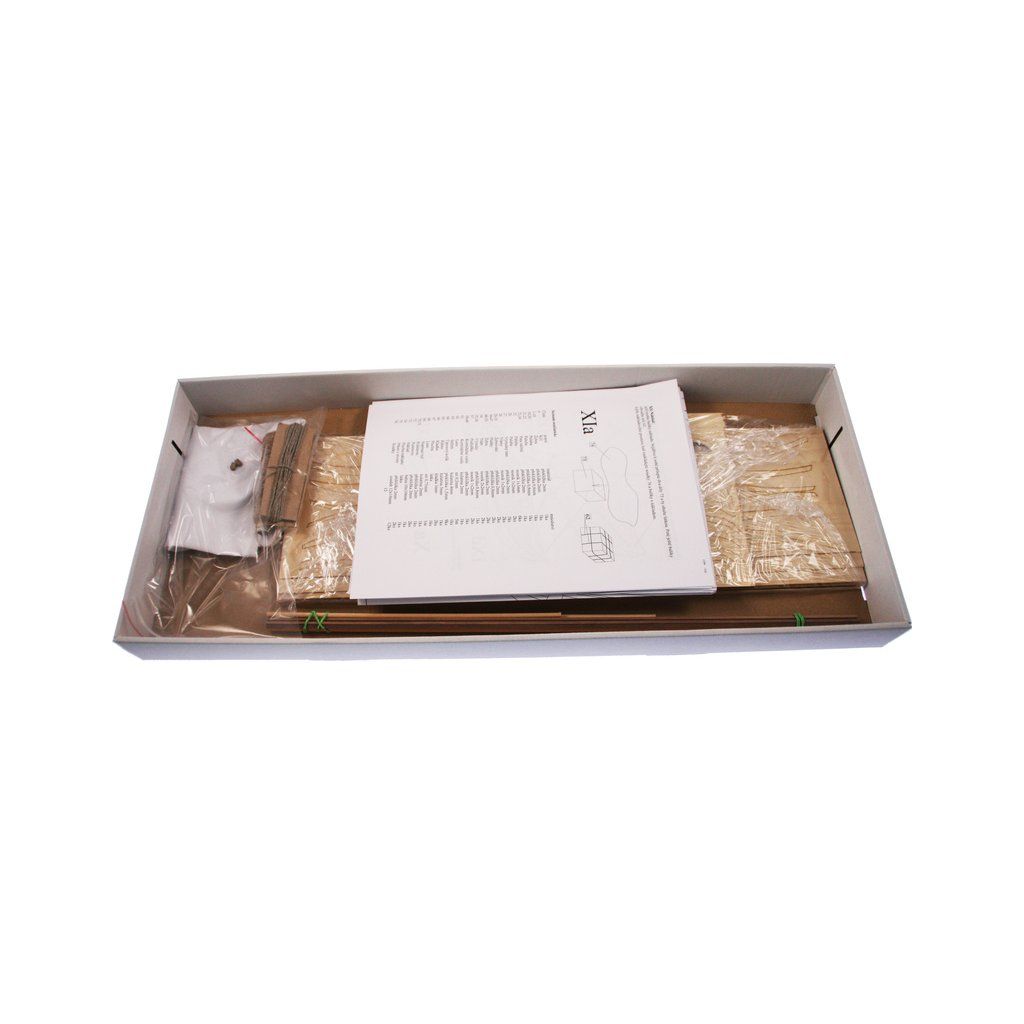 Po otevření víka krabice naleznete dřevěné díly modelu z překližky, sadu lišt, drobné součásti uzavřené v plastovém průhledném blistru, sadu výkresů a manuál.