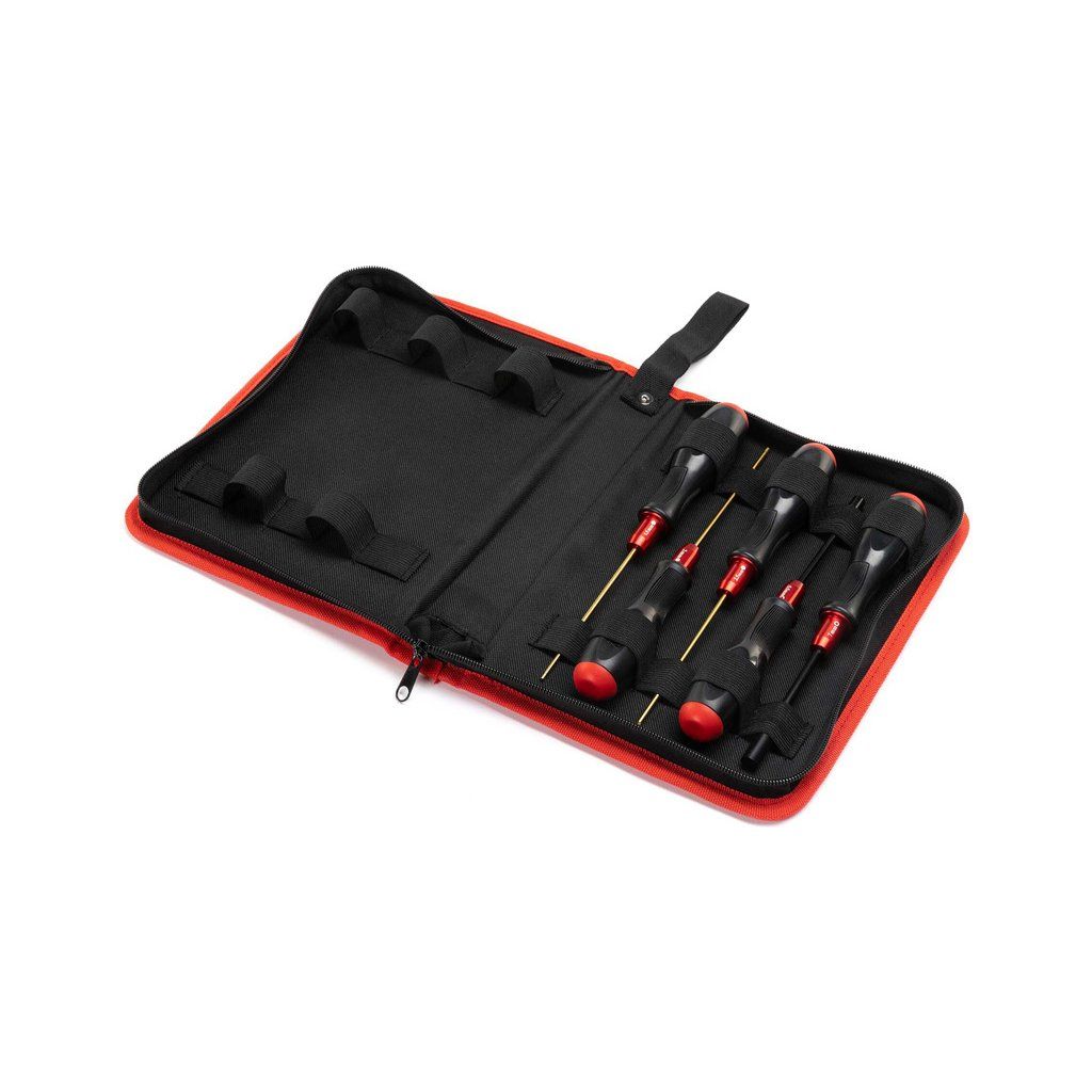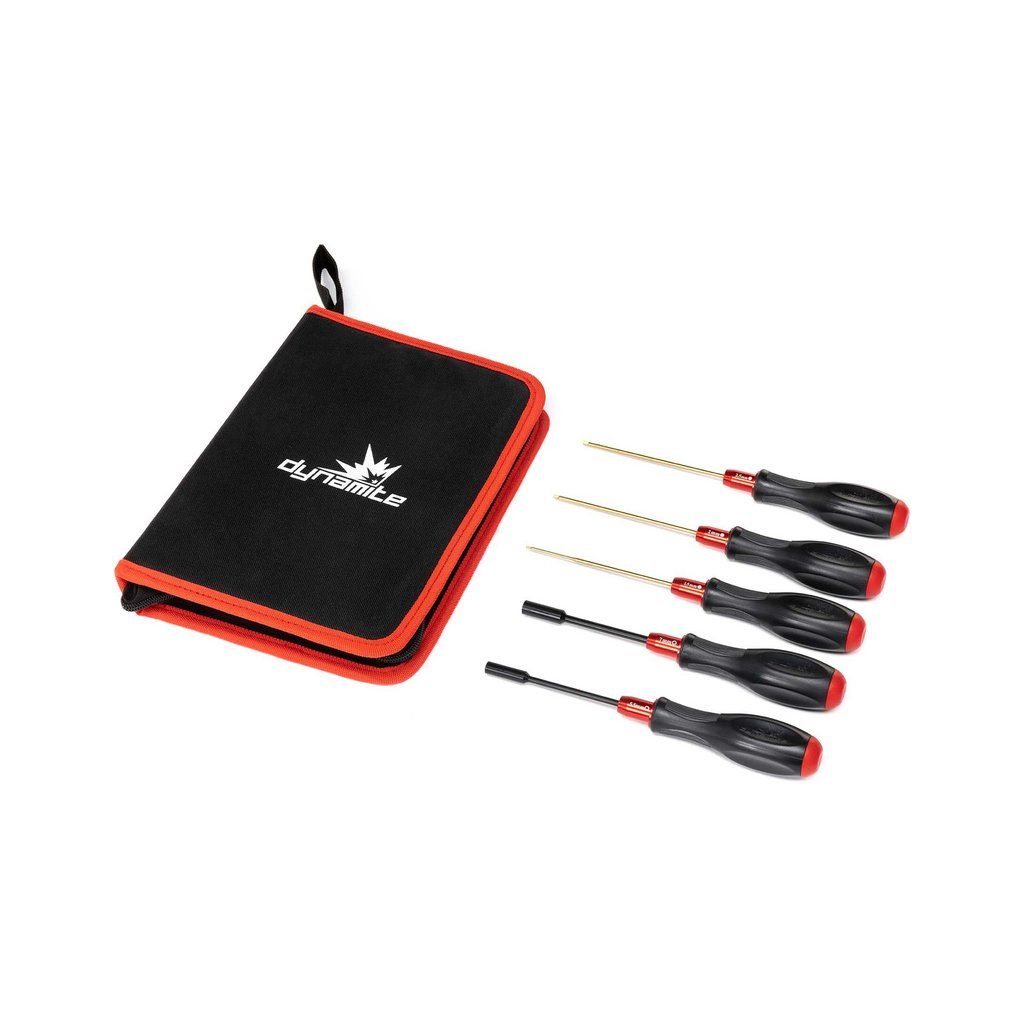 Sada šroubováků Metrická imbus (5 ks) od Dynamite, je základní sadou pro RC auta 1:10. Obsahuje imbus šroubováky 1.5mm, 2mm a 2.5mm, nástrčné klíče 5.5mm a 7mm. Ergonomicky tvarovaná plastová rukojeť s otočnou koncovkou pro pohodlné šroubování. Pouzdro na nářadí s logem.