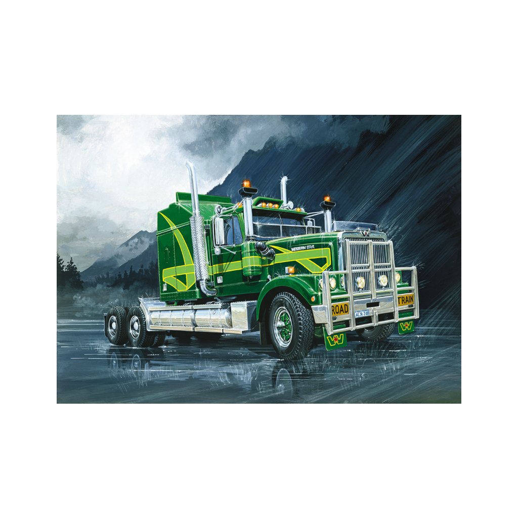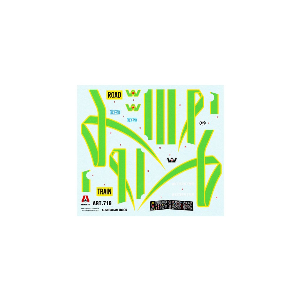Plastikový model Italeri 0719 - trucku Australský kamión v měřítku 1:24 ke slepení. Délka modelu 332 mm, obtížnost 4. Balení obsahuje SUPER OBTISKY.