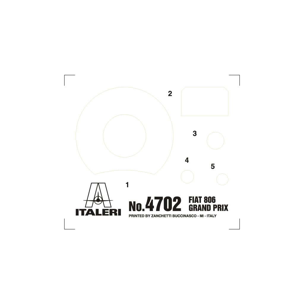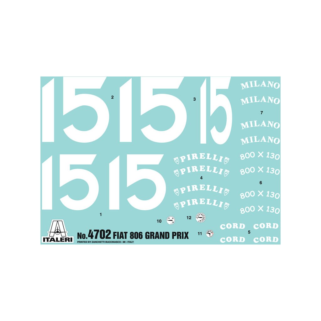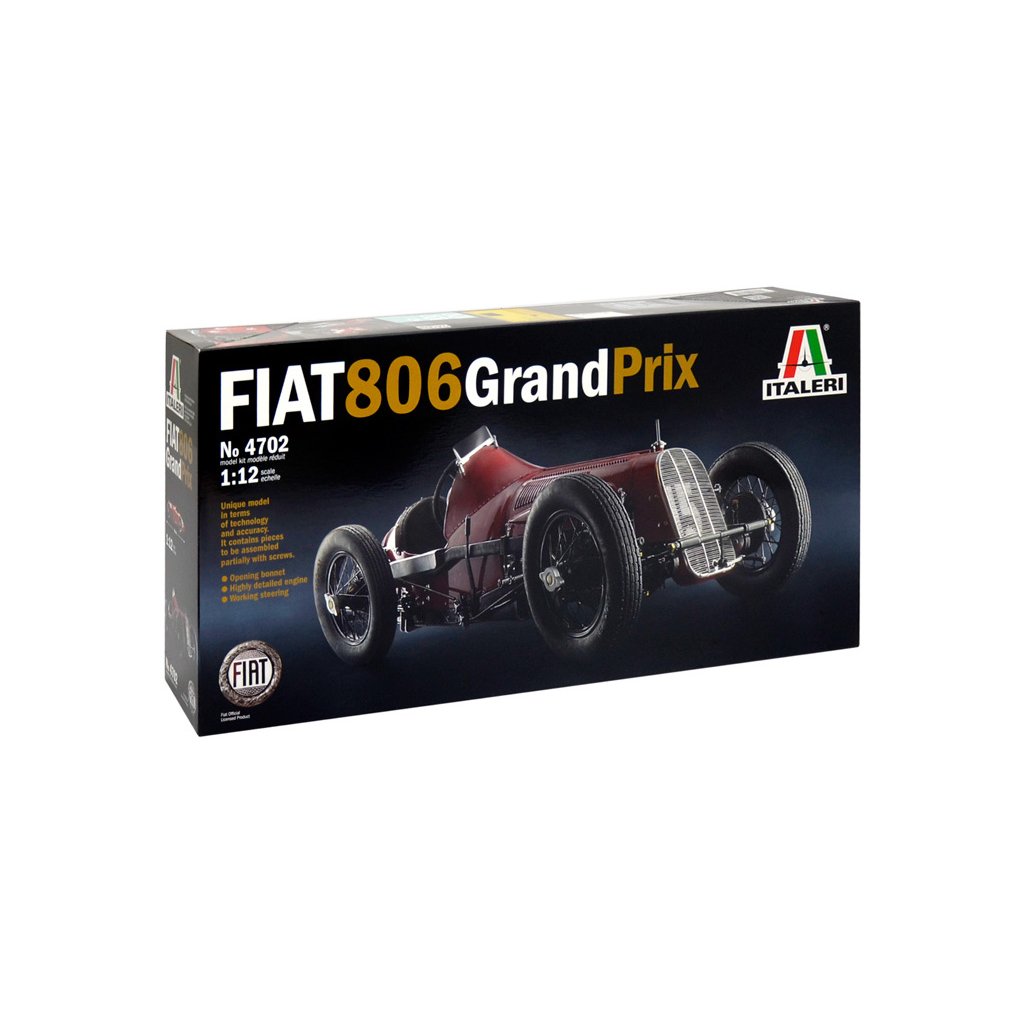 Plastikový model Italeri 4702 - auto FIAT 806 GRAND PRIX v měřítku 1:12 ke slepení. Délka modelu 300 mm, obtížnost 5. Balení obsahuje SUPER OBTISKY, MASKOVACÍ SAMOLEPKY, BOX SE ŠROUBY A MATICEMI, KŮŽE, MĚDĚNÉ DRÁTY, PVC HADICE, PRUŽINY A DALŠÍ ČÁSTI.