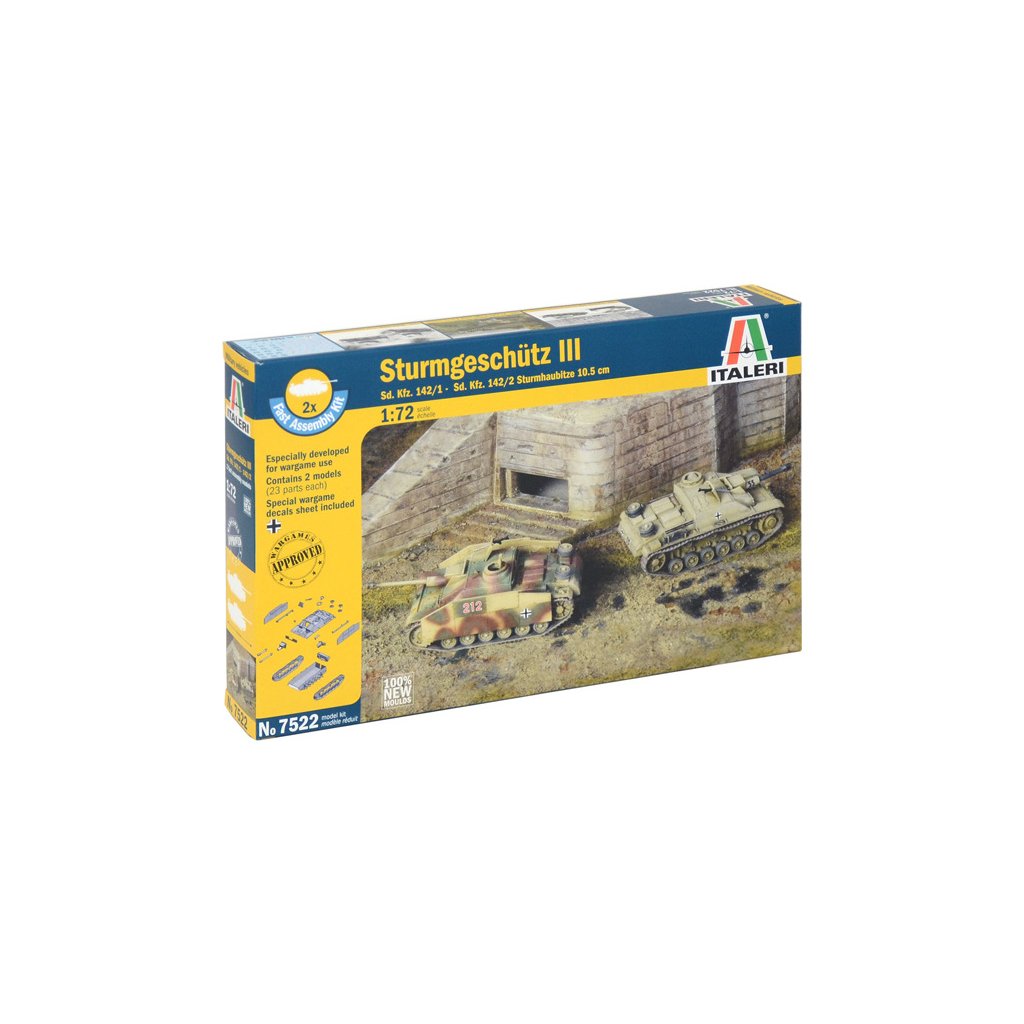 Plastikový model Italeri 7522 - Easy Kit tank STURMGESCHUTZ III v měřítku 1:72. Délka modelu 76 mm, obtížnost 1. Balení obsahuje DVA RYCHLE SESTAVITELNÉ MODELY a SPECIÁLNÍ POTISKY PRO 3 VERZE.
