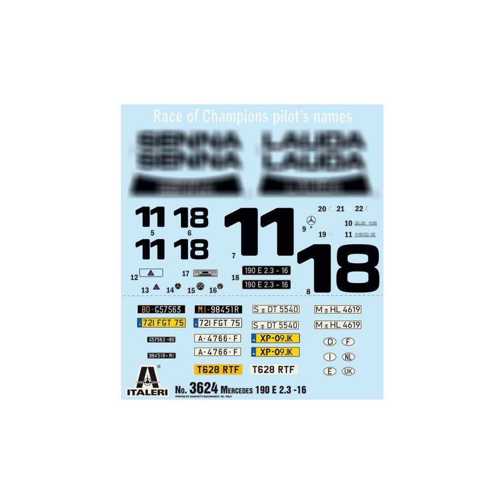 Plastikový model Italeri 3624 - auto Mercedes-Benz 190E v měřítku 1:24 ke slepení. Délka modelu 184 mm, obtížnost 3. Balení obsahuje SUPER OBTISKY.