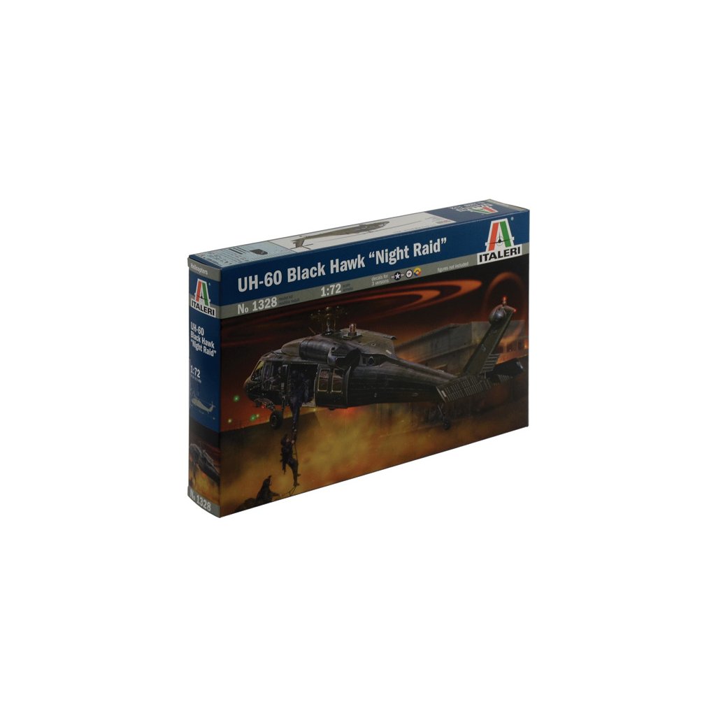 Plastikový model Italeri 1328 - vrtulník UH-60/MH-60 Black Hawk "Night Raid" v měřítku 1:72 ke slepení. Délka modelu 210 mm, obtížnost 3. Balení obsahuje SKVĚLÉ OBTISKY PRO 3 VERZE.
