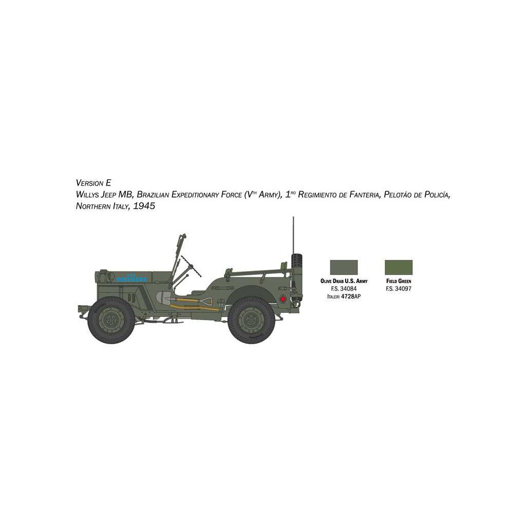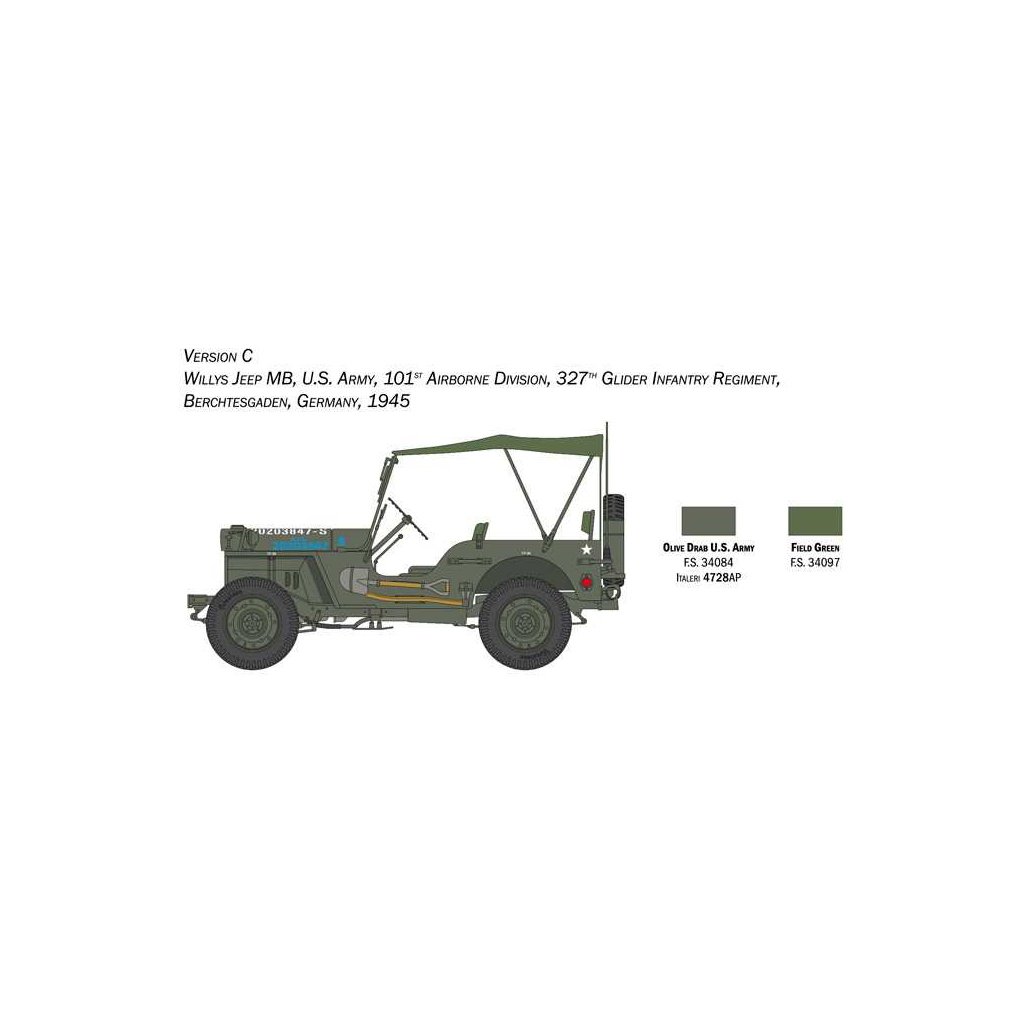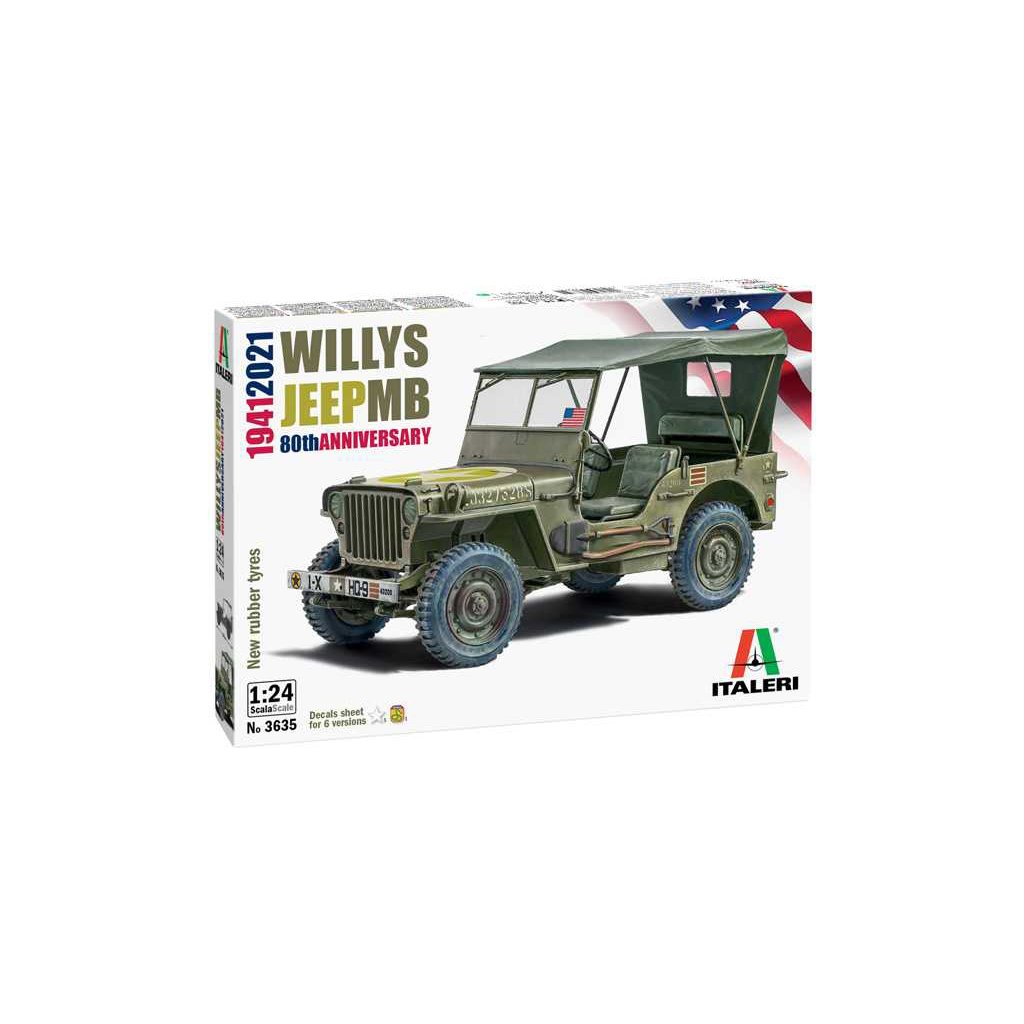 Plastikový model Italeri 3635 - military Willys Jeep MB v měřítku 1:24 ke slepení. Délka modelu 138 mm, obtížnost 2. Balení obsahuje SKVĚLÉ OBTISKY PRO 6 VERZÍ.