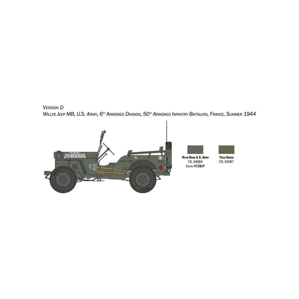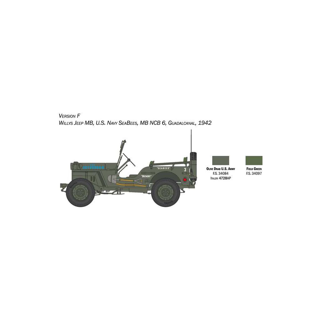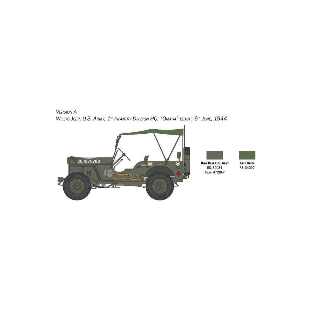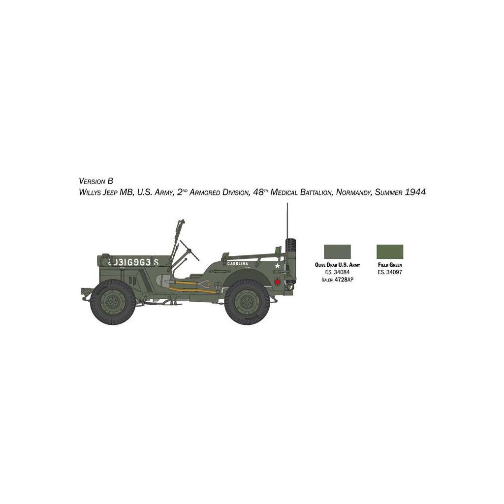 Plastikový model Italeri 3635 - military Willys Jeep MB v měřítku 1:24 ke slepení. Délka modelu 138 mm, obtížnost 2. Balení obsahuje SKVĚLÉ OBTISKY PRO 6 VERZÍ.