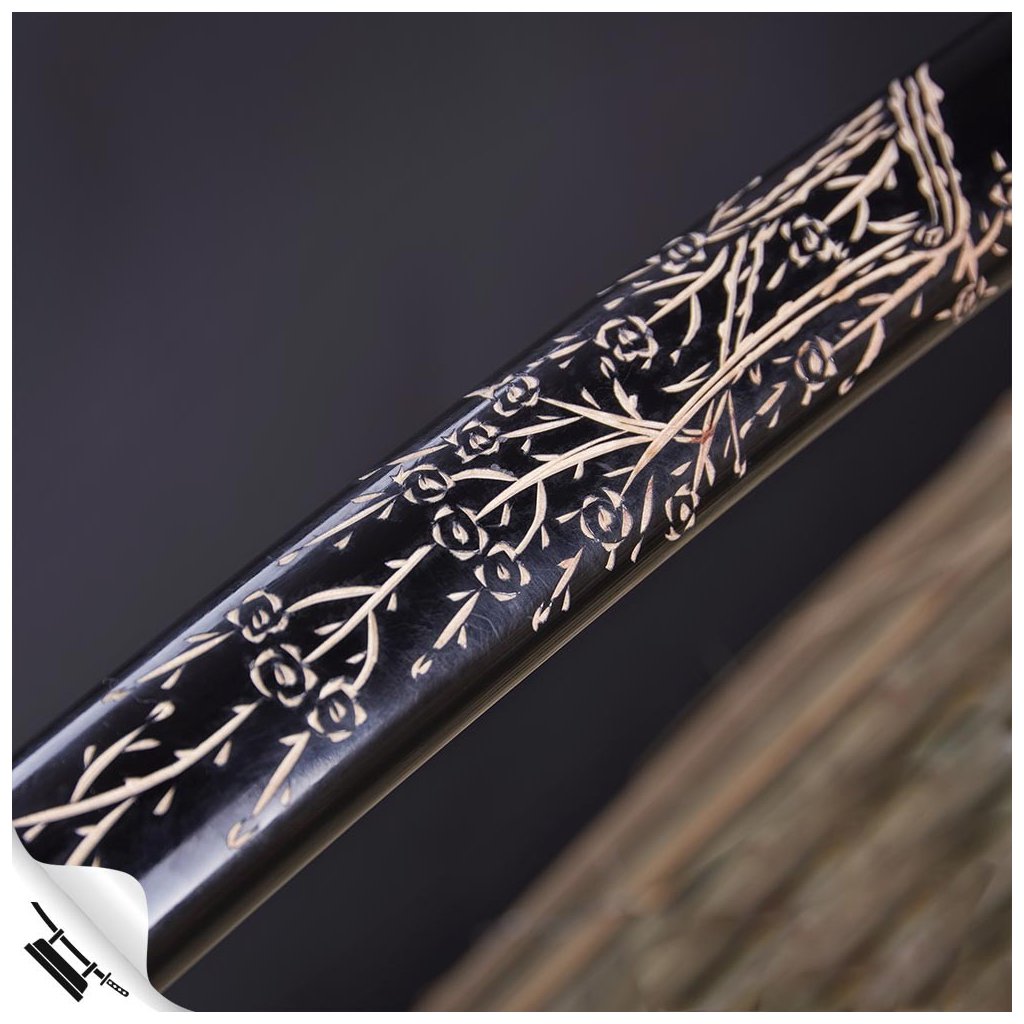 Tato kovaná replika katana typu shinogi-zukuri je vyrobena z kvalitní uhlíkové oceli AISI 1045. Model Rozubusshu je navržen s důrazem na detail a estetiku, což z něj činí ideální kousek pro sběratele i studenty bojových umění. Hlavní dominantou je černá lesklá pochva saya s unikátním ručně vyrytým motivem růží, který doplňuje mosazná tsuba s květinovým dekorem. Konstrukce Full Tang s čepelí zajištěnou bambusovým kolíkem (mekugi) poskytuje potřebnou stabilitu pro nácvik základních technik (kata) a manipulaci.